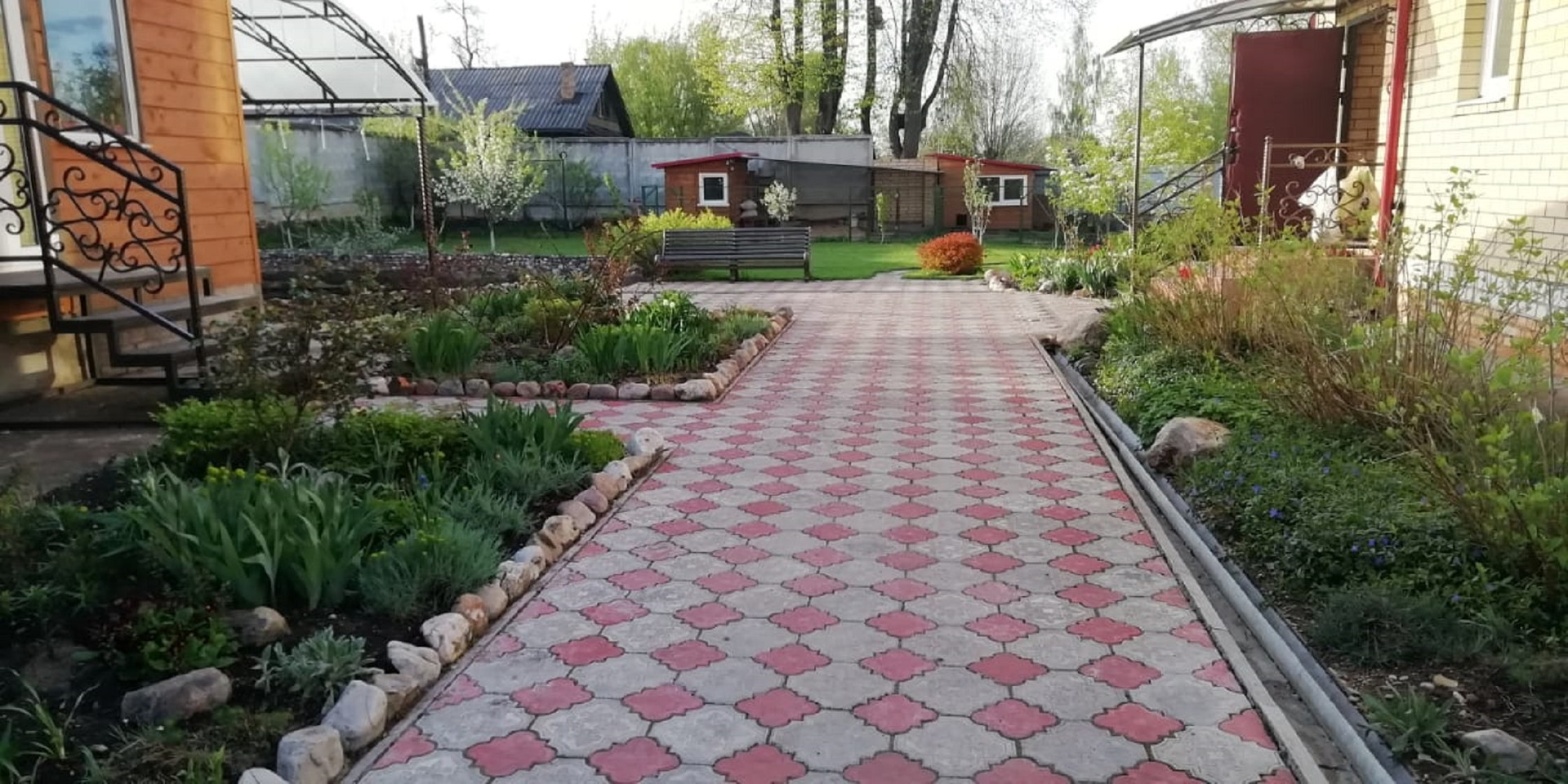 Въезд на участок с двух сторон, на котором помимо дома имеется – двухэтажная баня с летней кухней и навесом, большой гараж на две машины, теплица, хозяйственные постройки, пруд, забор (кирпичные столбы с проф. листом).