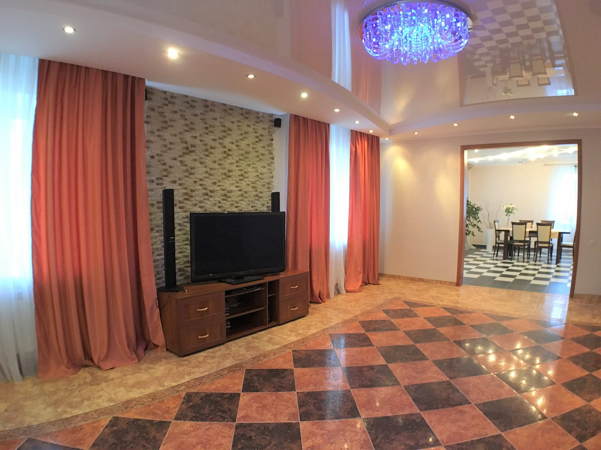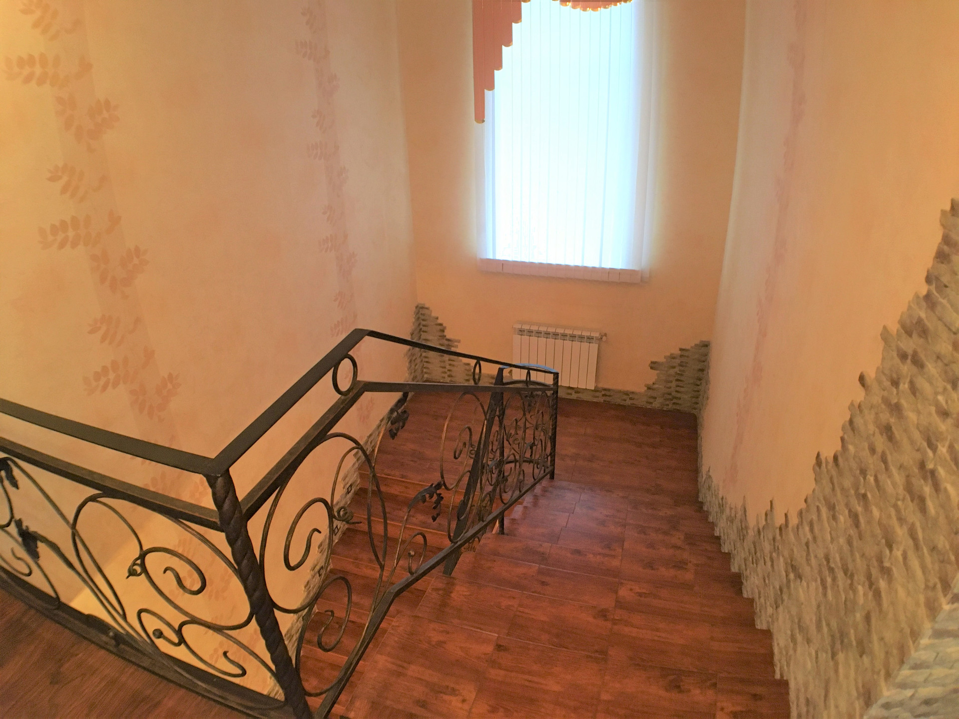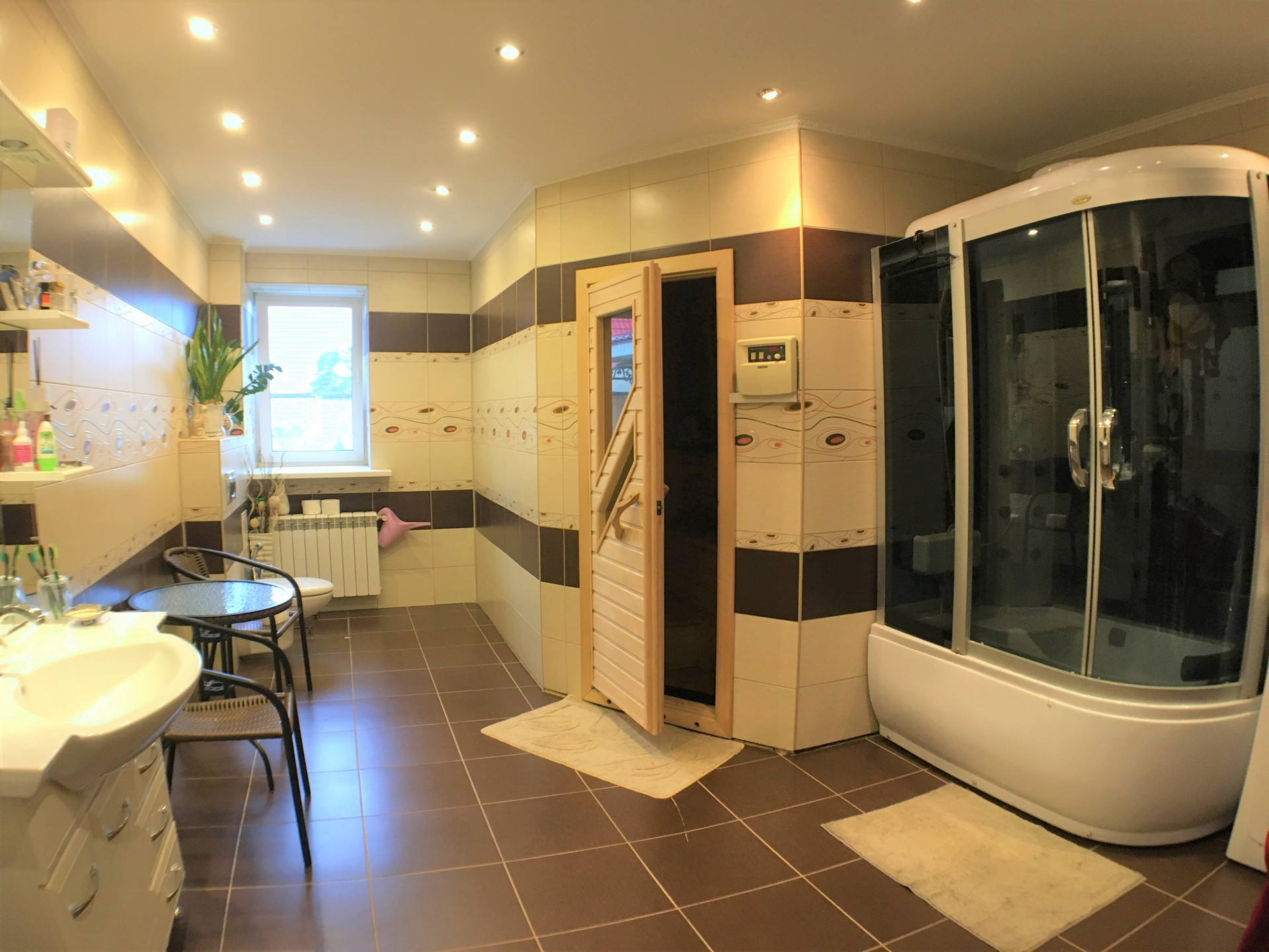 Гостиная, столовая, кухня, комната для гостей, санузел, сауна, две прихожих и гараж.