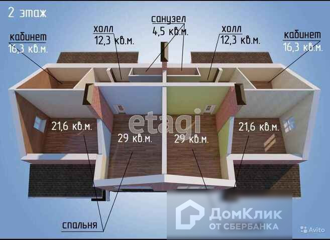Второй этаж: комната: 21.6кв.м, 2ая комната: 29кв.м, кабинет 16.3кв.м, холл:12,3кв.м, санузел:4.5кв.м.
