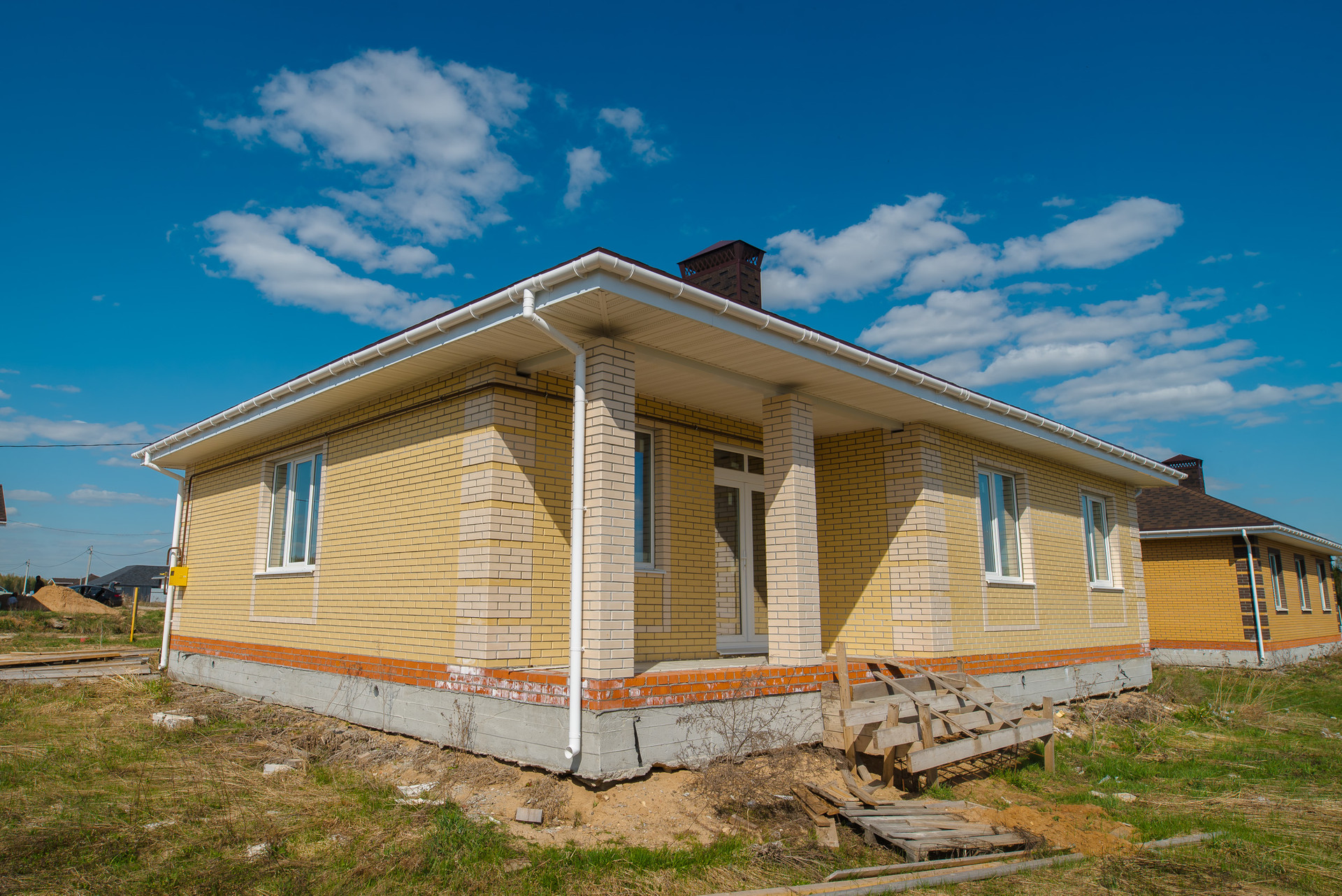 Дом выстроен из газоблоков, облицован кирпичом, фундамент свайно-ростверковый.