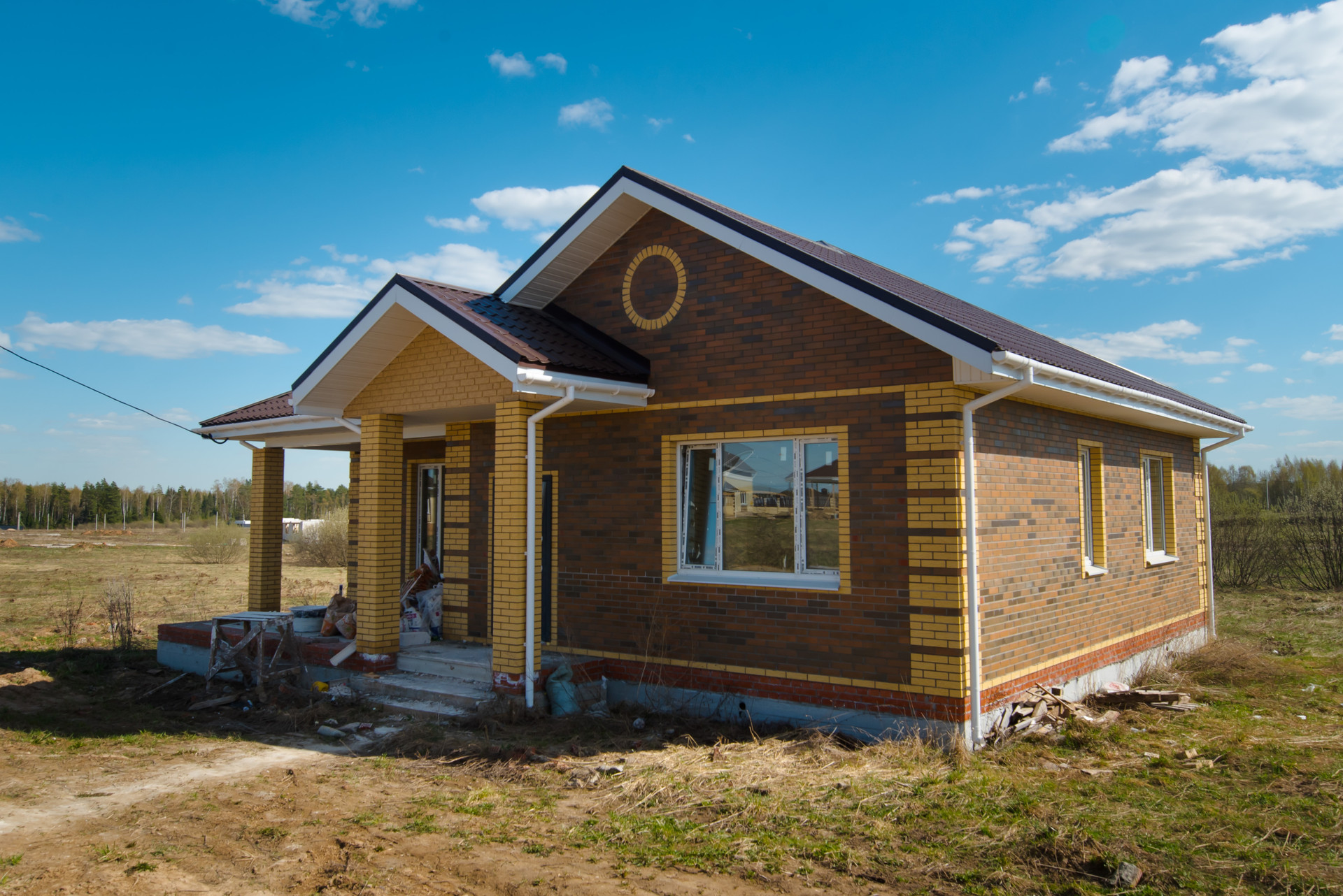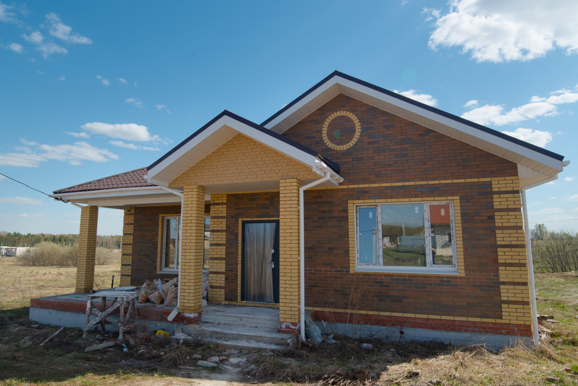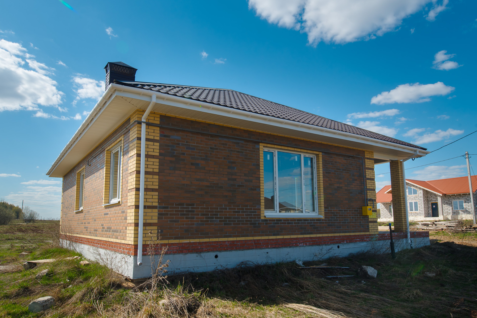 Дом построен из газоблоков с облицовочным керамическим кирпичом на фасаде и мягкой кровлей. Фундамент свайно-ростверковый, что гарантирует надежность и долговечность конструкции.