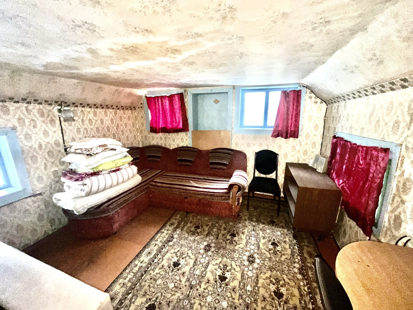 -Дом кирпичный, 2 этаж мансардный. На первом этаже 2 жилые комнаты и кухня, второй одна большая комната. Отопление печное.