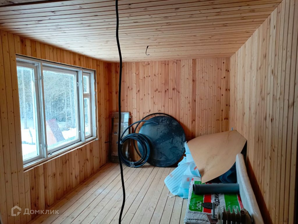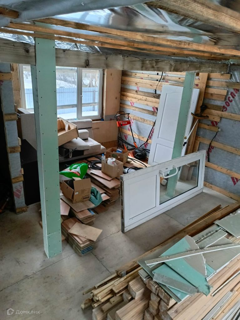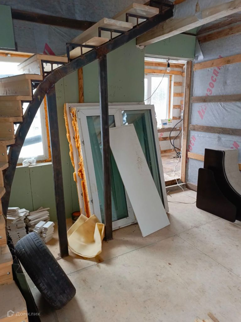 В доме остались стройматериалы для завершения строительства: пластиковые окна, вагонка, утеплитель, ламинат и двери.