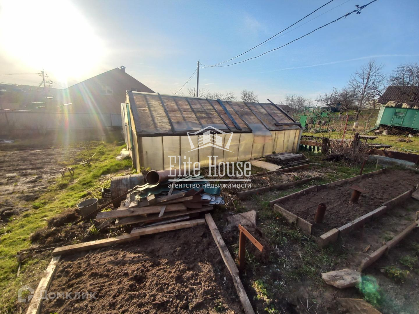 Участок обнесен забором из профлиста, с фасада устроены распашные ворота. На участке две теплицы, сарай. Посажены плодовые деревья.