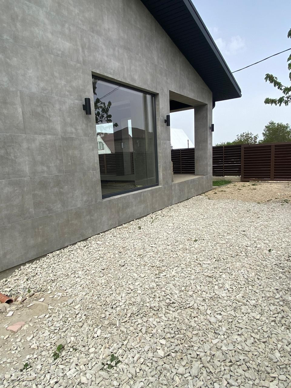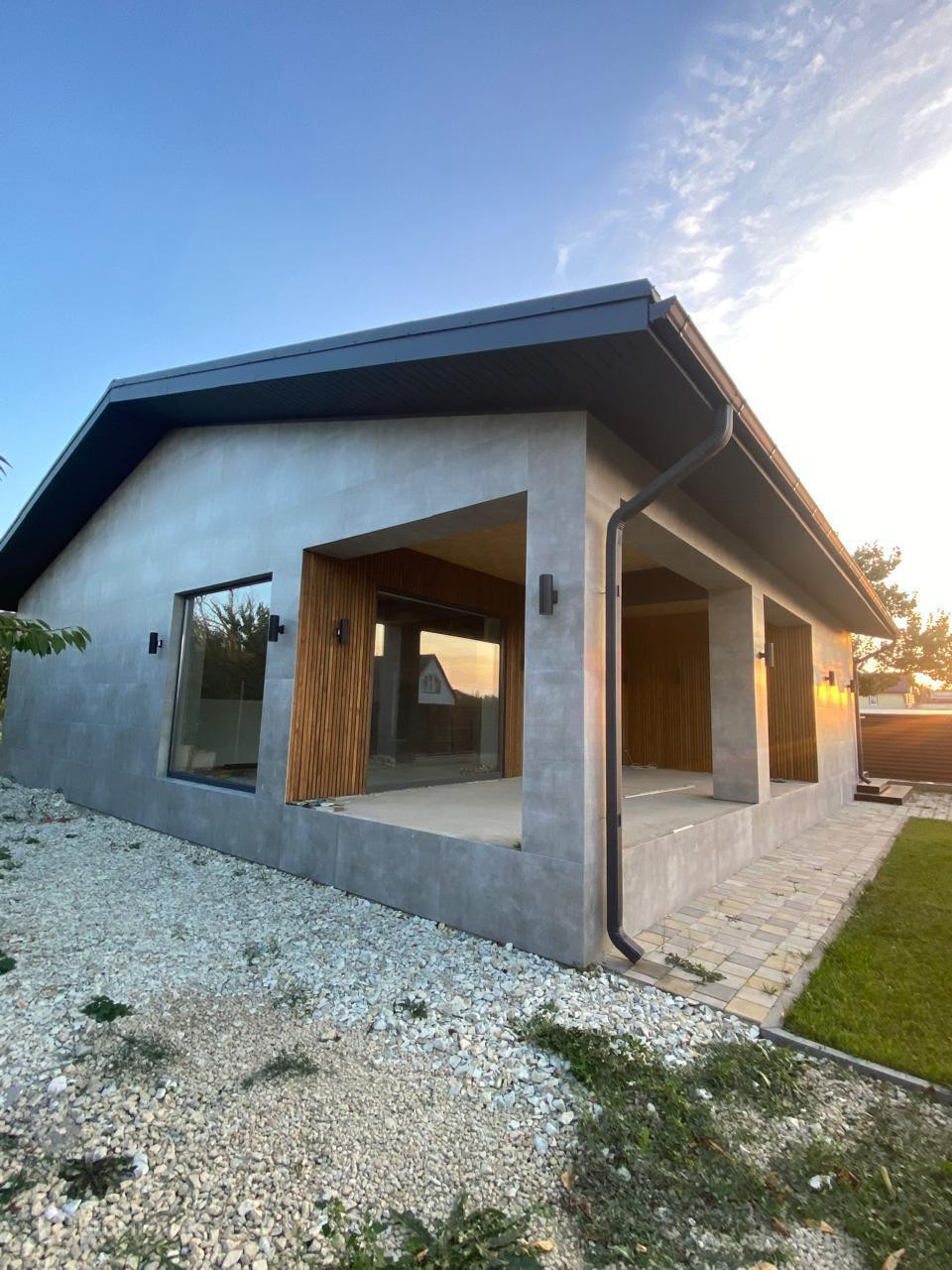 Дом выполнен из монолитного каркаса. Стены наружные из керамзитового блока 46 см оштукатурены и облицованы керамогранитом. Перегородки - кирпичные. Крыша- металлочерепица( ral 7024), утеплитель 150 мм. Установлены алюминиевые окна в пол.