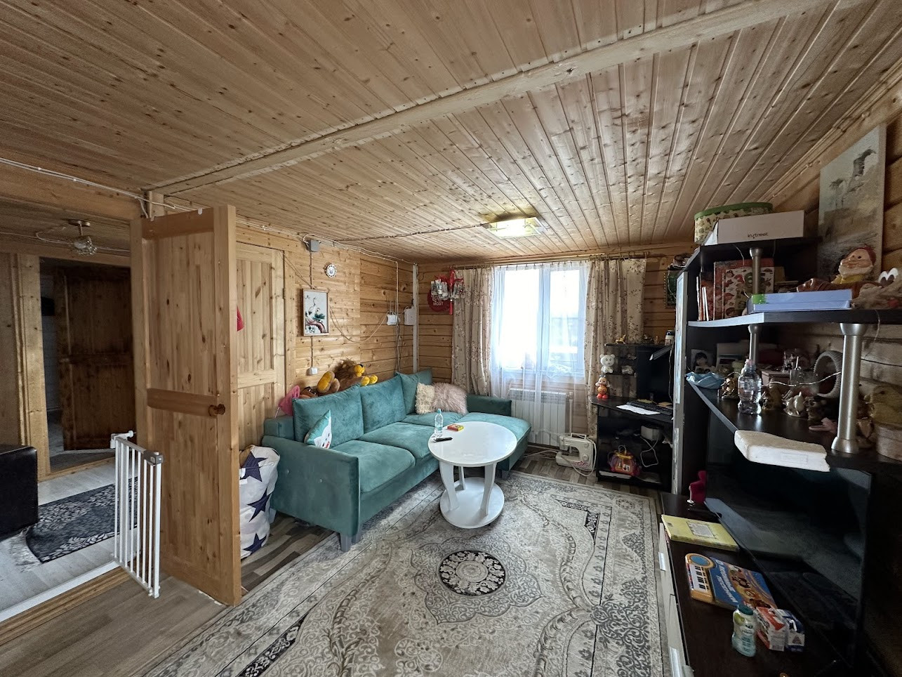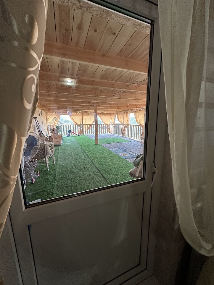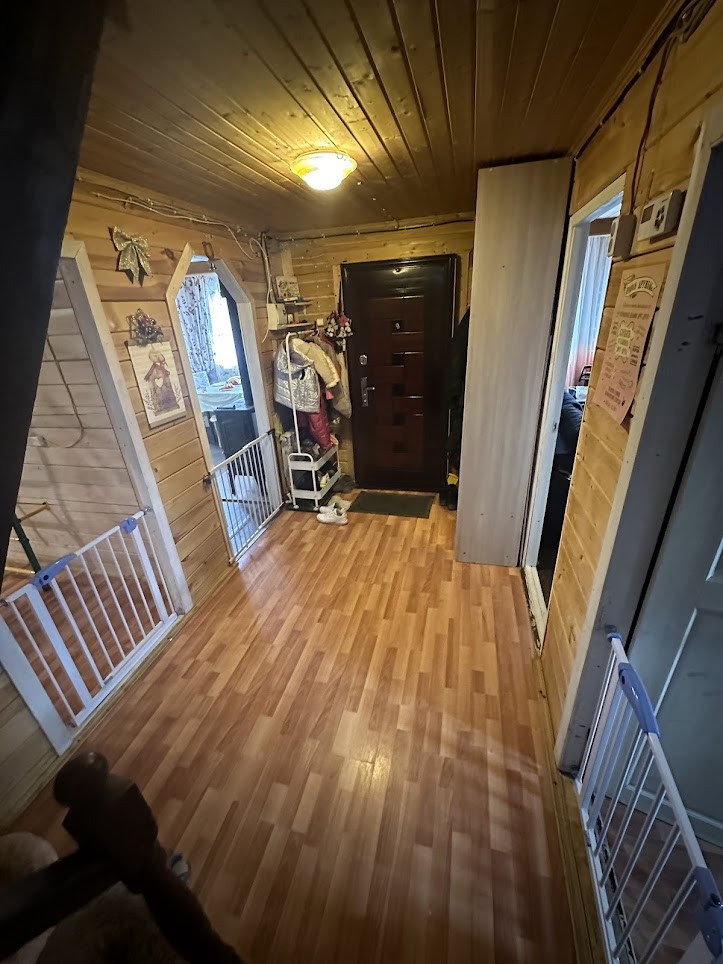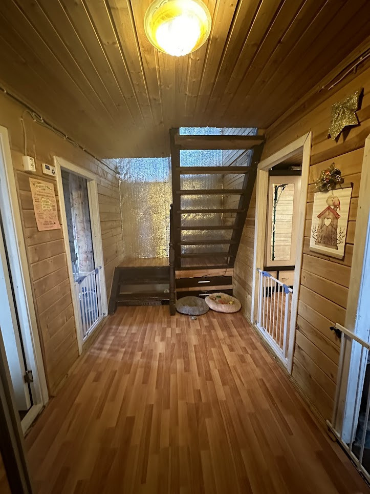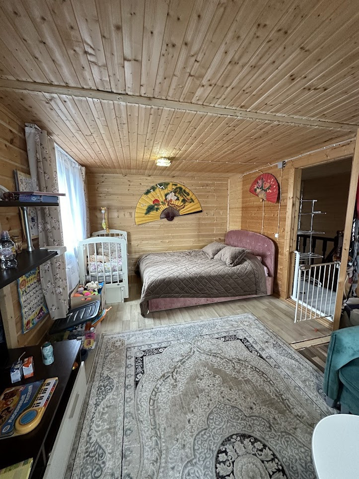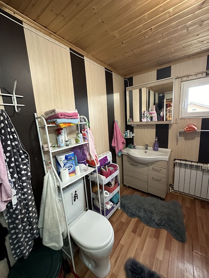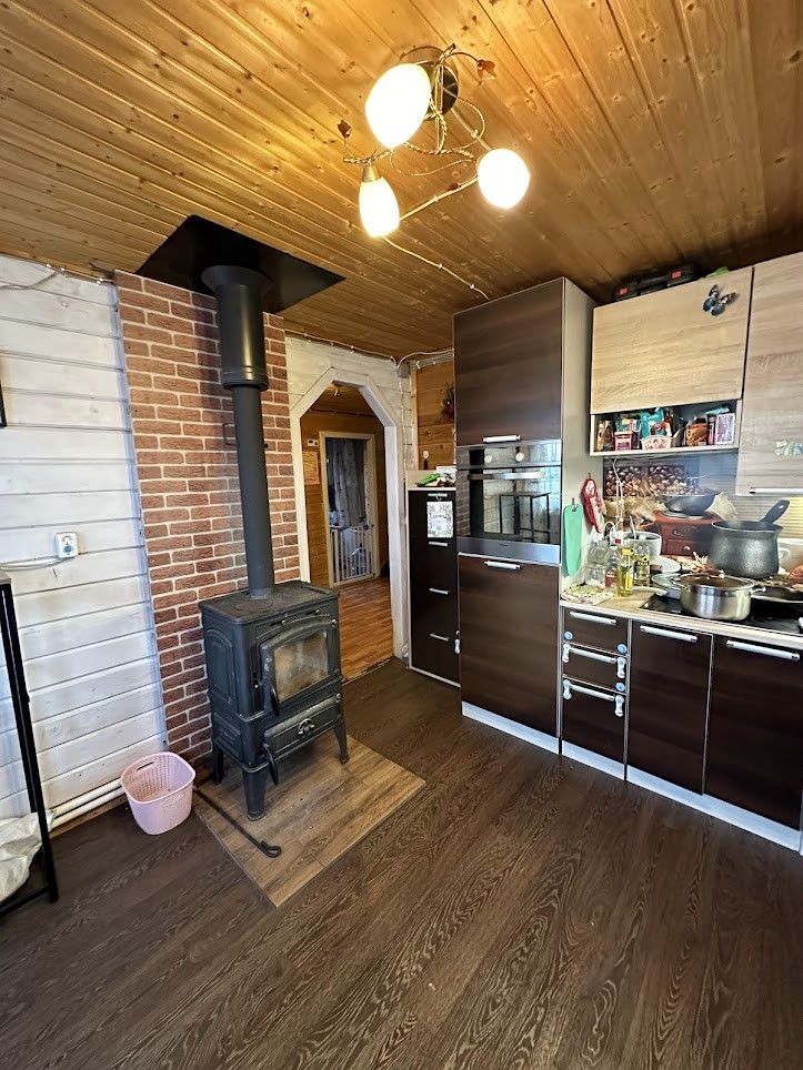 Конструктив здания: свайный фундамент заглублением на 2,5 метра; стены - деревянные, первая часть дома, где вход - из профилированного бруса 150х150 мм, вторая часть с террасой - каркасная; фасад обшит сайдингом; крыша покрыта ондулином, деревянная лестница на 2-й этаж; двухкамерные стеклопакеты; уличная современная входная дверь. Дом тщательно утеплен (в семье маленький ребенок). Спутниковые ТВ и интернет.