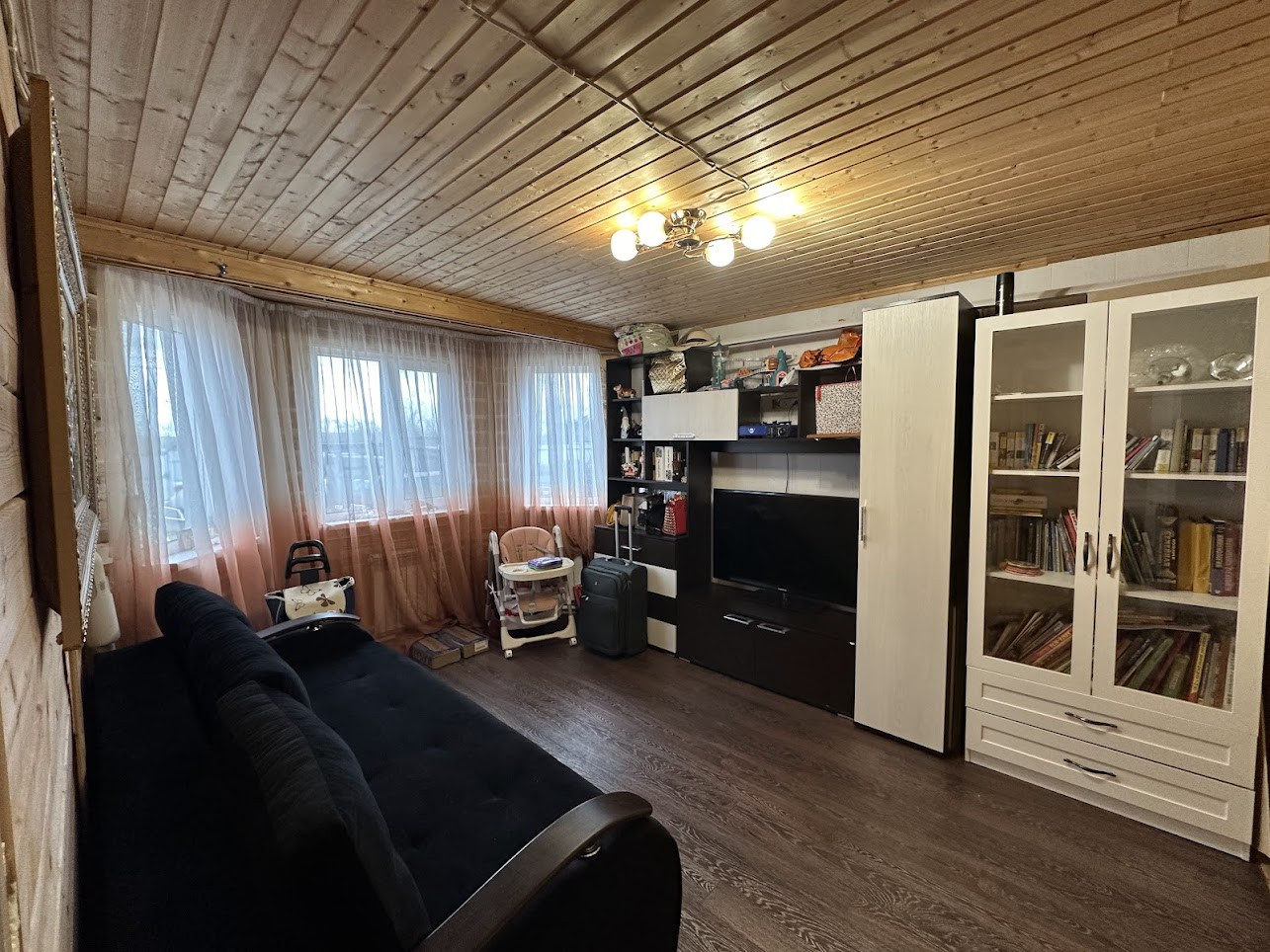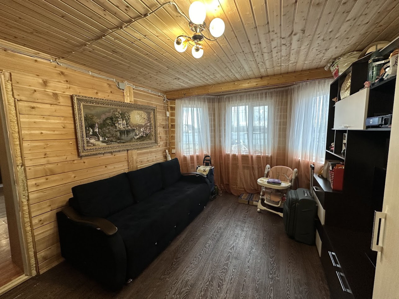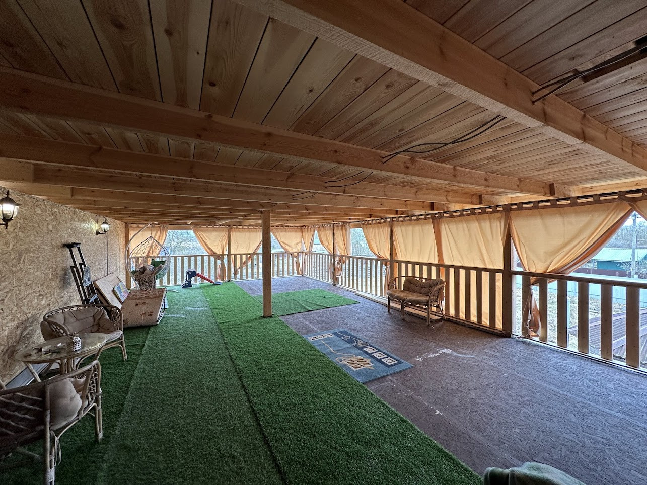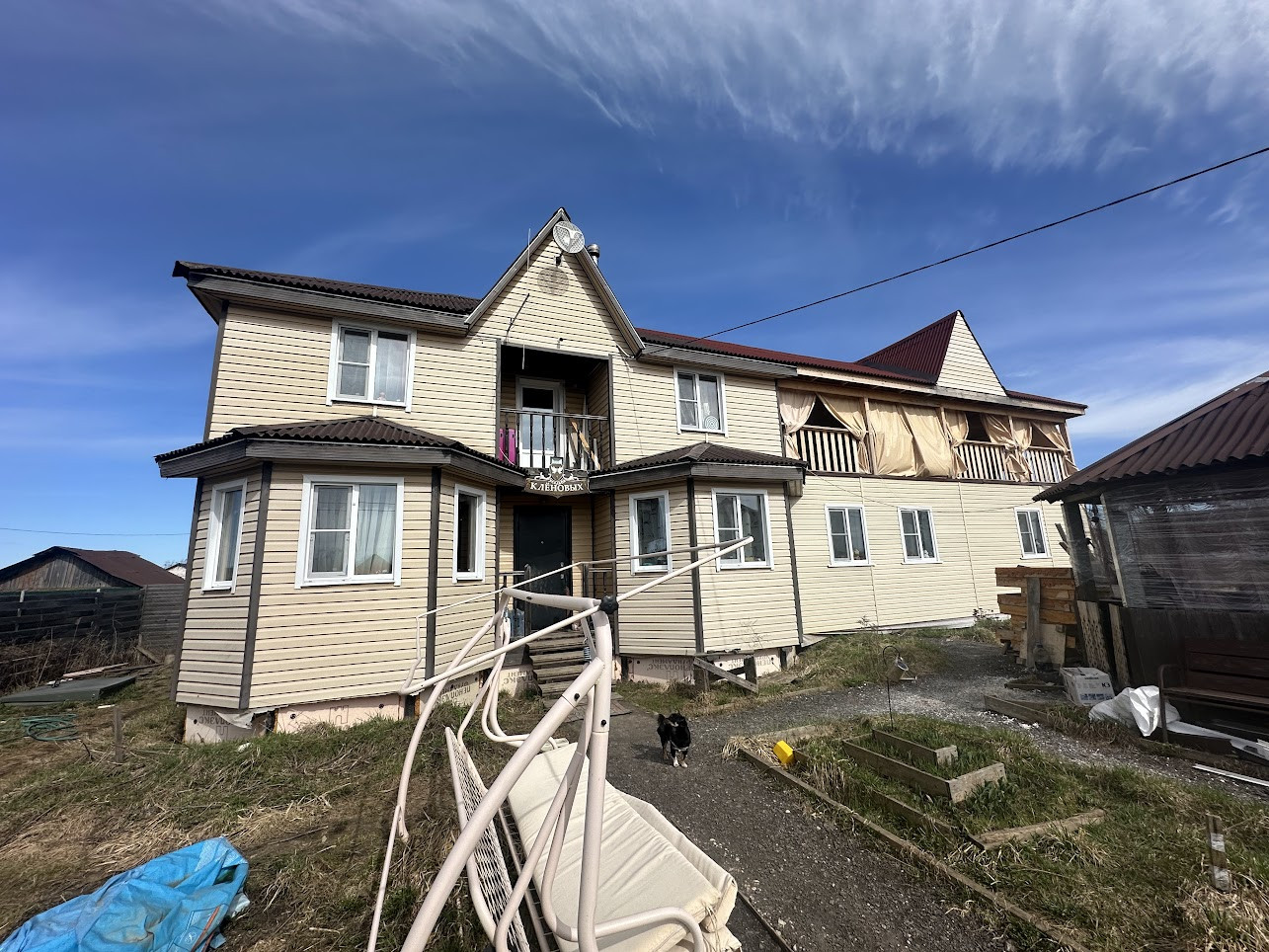 Конструктив здания: свайный фундамент заглублением на 2,5 метра; стены - деревянные, первая часть дома, где вход - из профилированного бруса 150х150 мм, вторая часть с террасой - каркасная; фасад обшит сайдингом; крыша покрыта ондулином, деревянная лестница на 2-й этаж; двухкамерные стеклопакеты; уличная современная входная дверь. Дом тщательно утеплен (в семье маленький ребенок). Спутниковые ТВ и интернет.