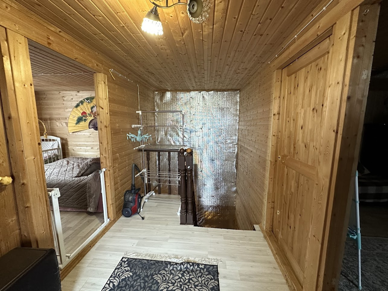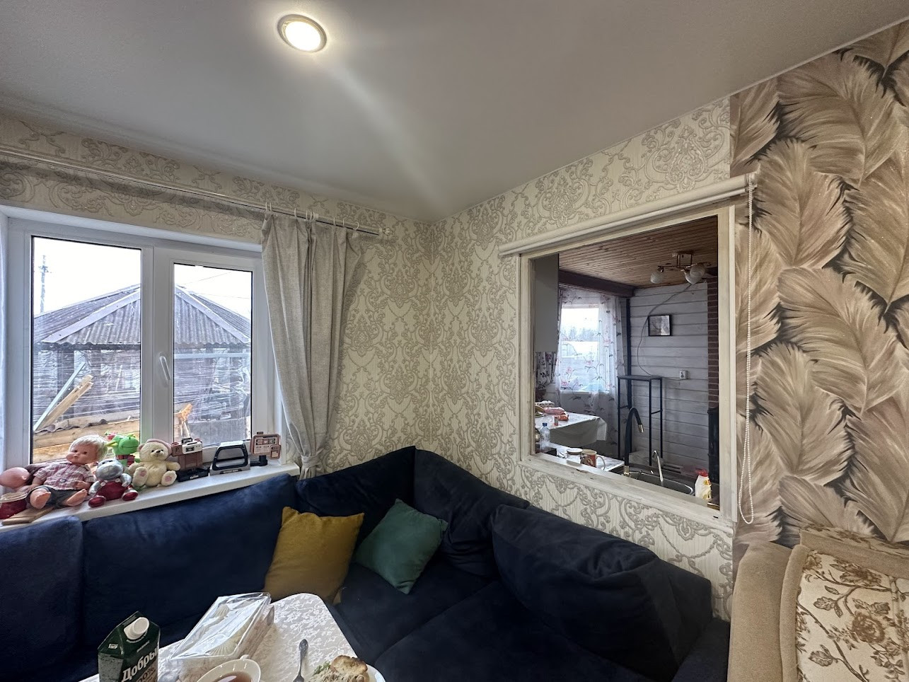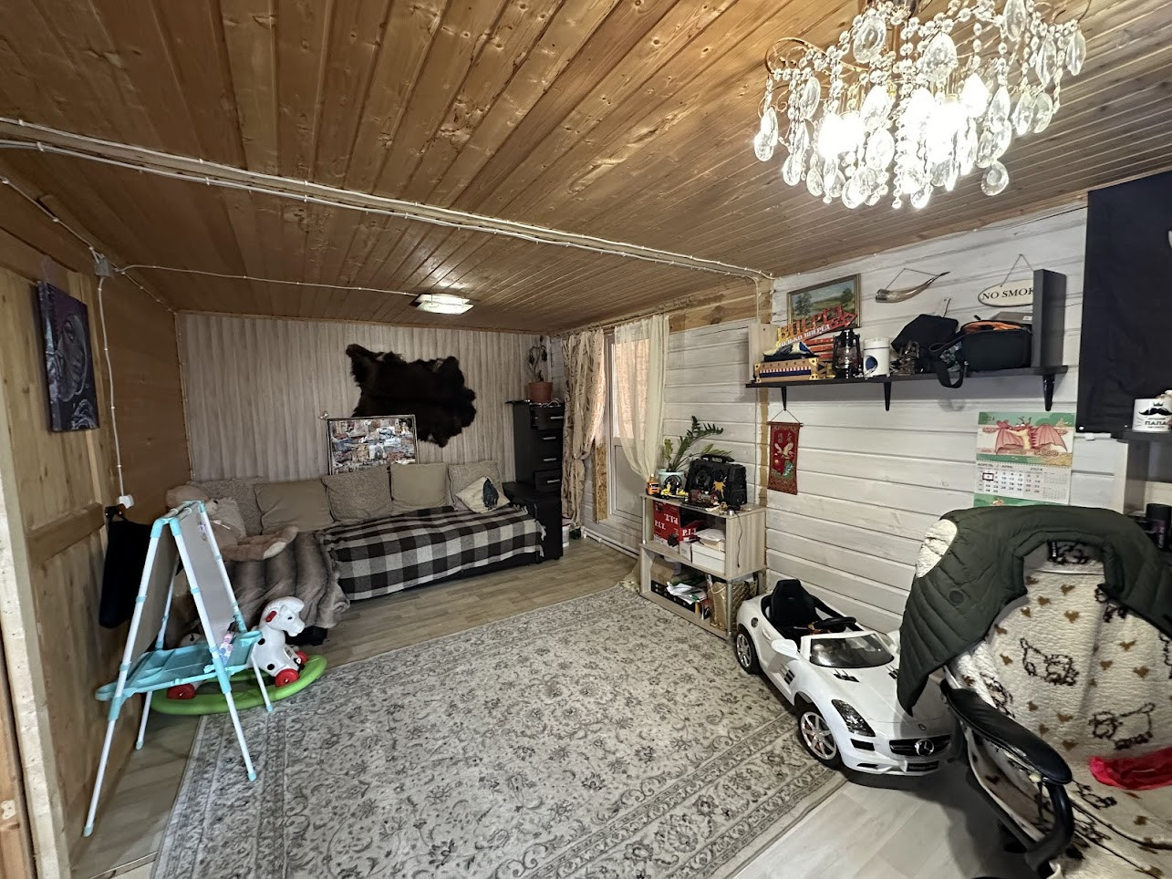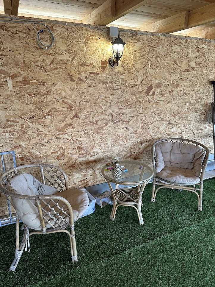 Конструктив здания: свайный фундамент заглублением на 2,5 метра; стены - деревянные, первая часть дома, где вход - из профилированного бруса 150х150 мм, вторая часть с террасой - каркасная; фасад обшит сайдингом; крыша покрыта ондулином, деревянная лестница на 2-й этаж; двухкамерные стеклопакеты; уличная современная входная дверь. Дом тщательно утеплен (в семье маленький ребенок). Спутниковые ТВ и интернет.