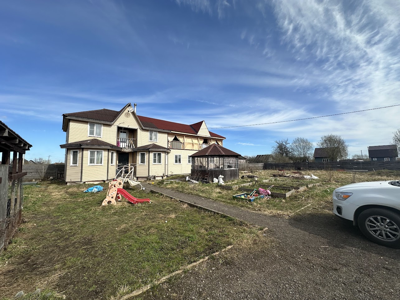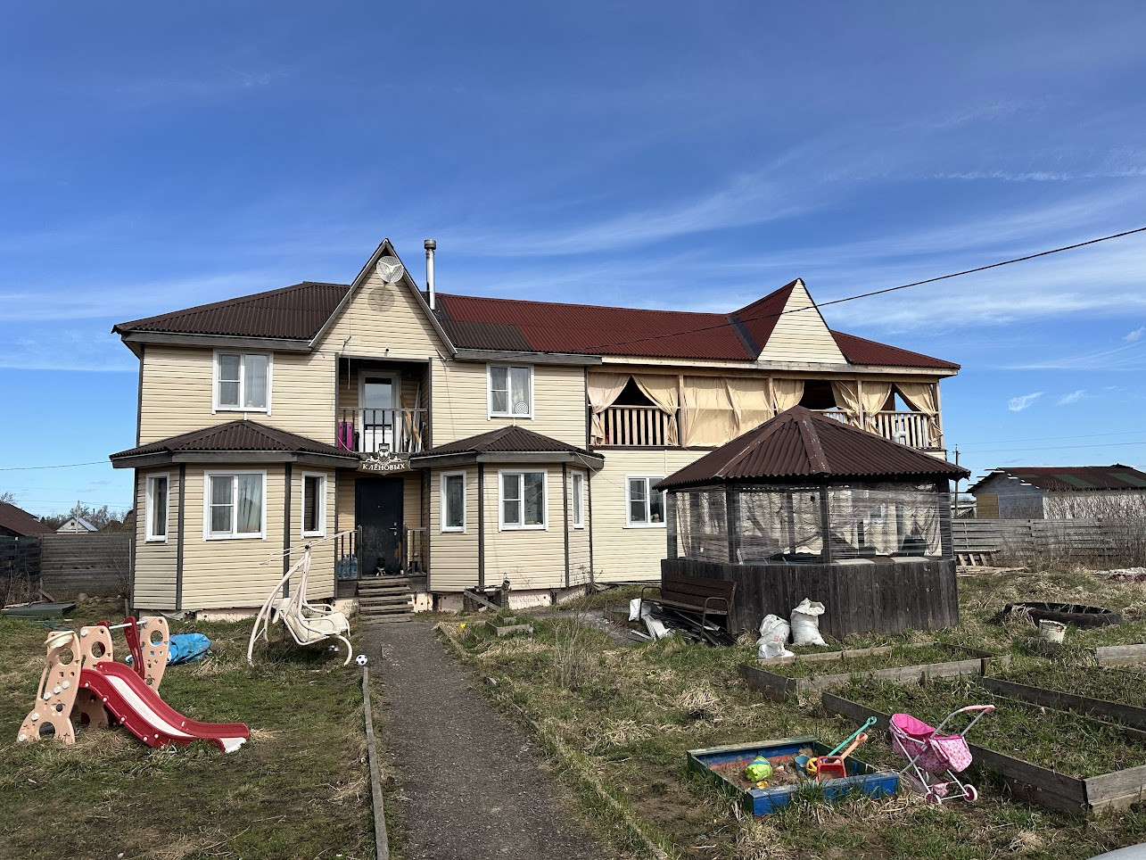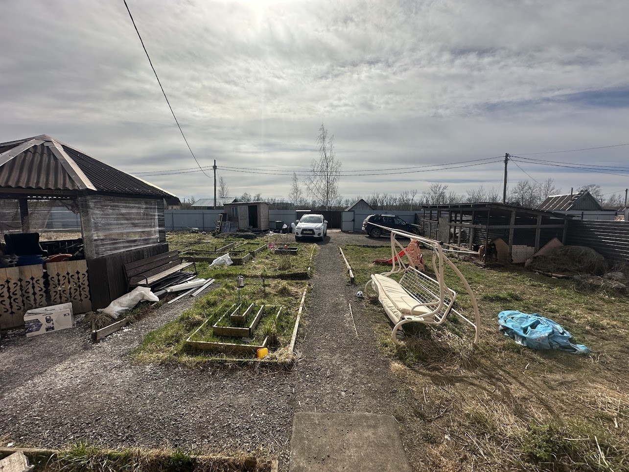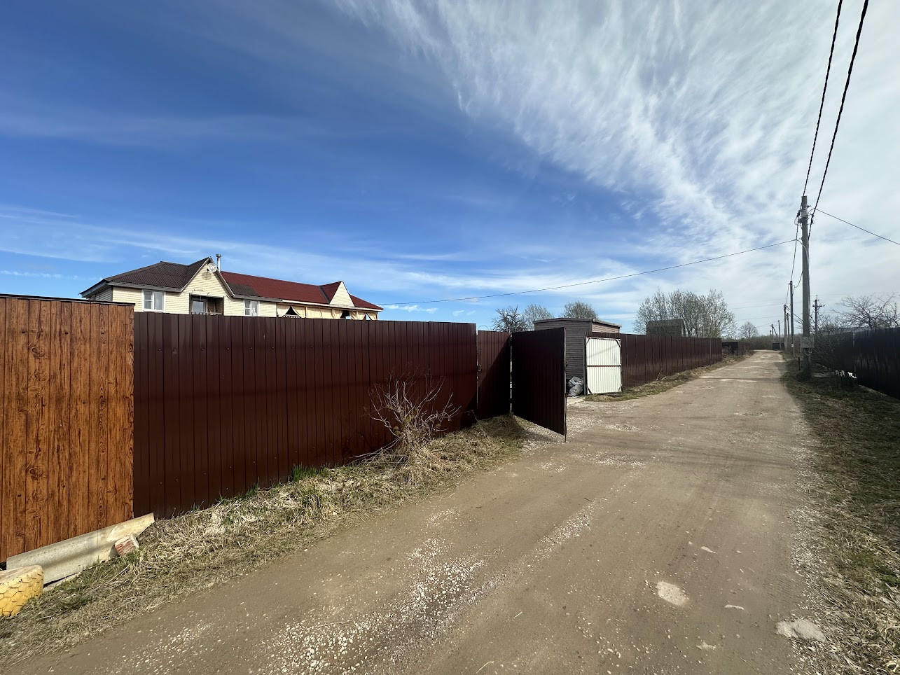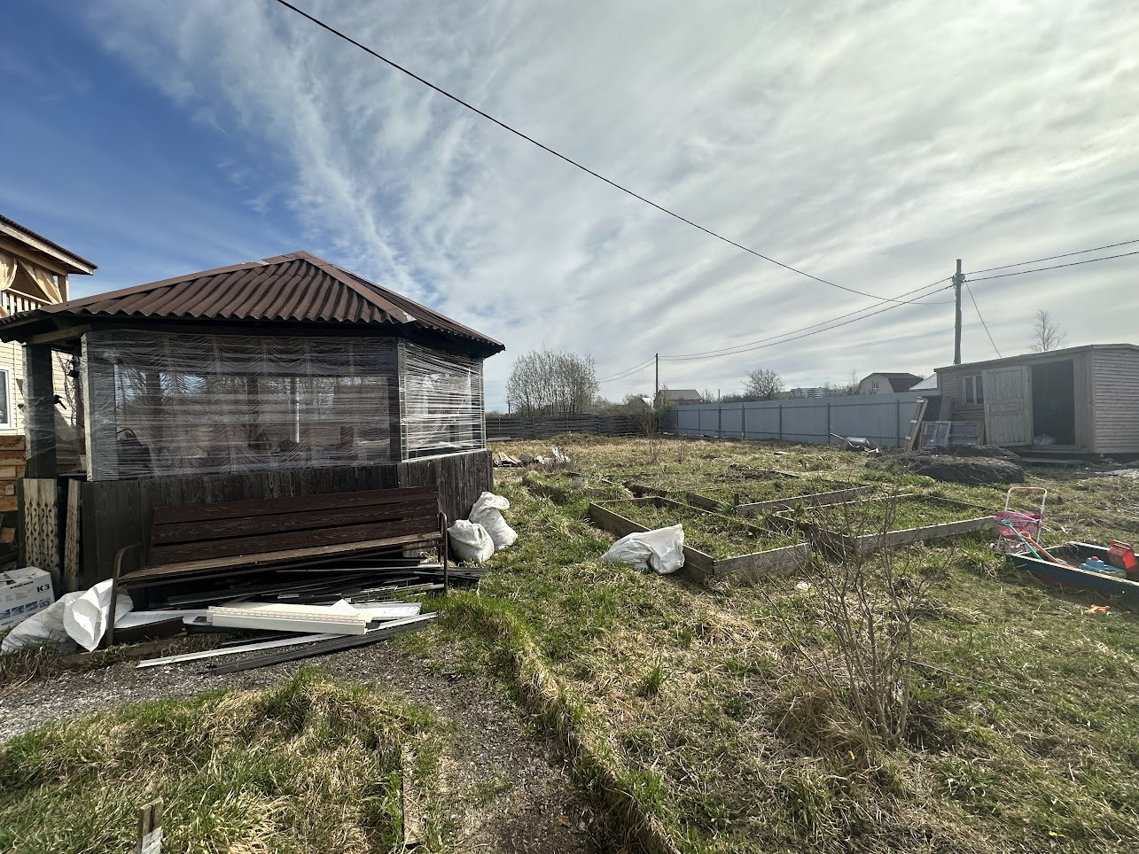 Участок 13,3 соток частично распланирован и вмещает в себя цветочные клумбы, кусты калины и сирени, отсыпана площадка для парковки автомобиля (можно ставить 3 машины), дровеник, сарай для хозинвентаря, курятник или вольер для собаки (кому что требуется), уютная беседка. С лицевой стороны участок огорожен забором из металлопрофиля с распашными воротами, боковые части и тыльная сторона забора - деревянные.