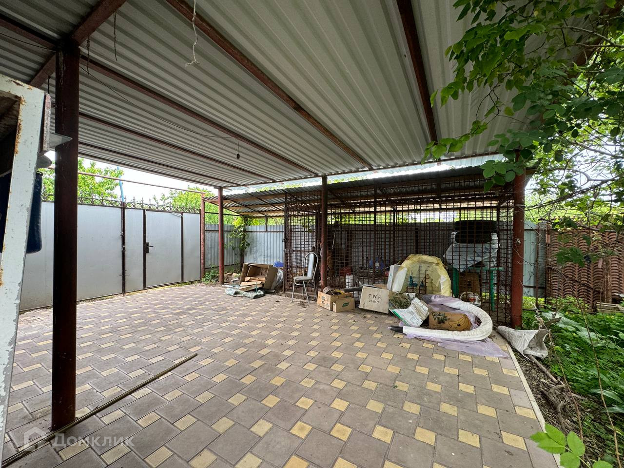 Обустроенная автостоянка с капитальным навесом, расширенные ворота с калиткой ,вольер для собак.