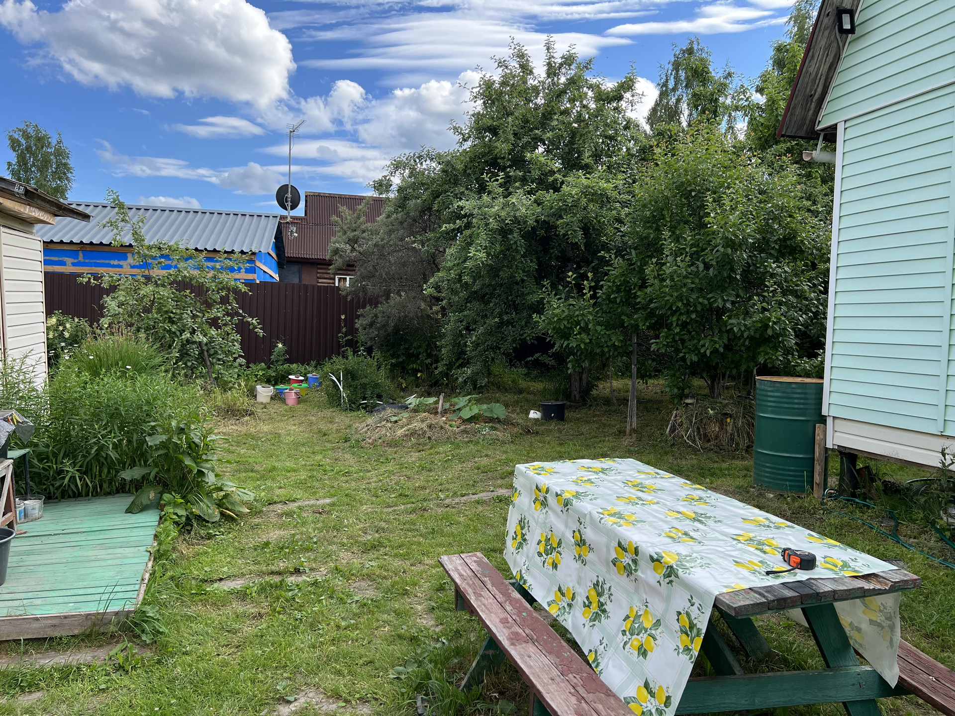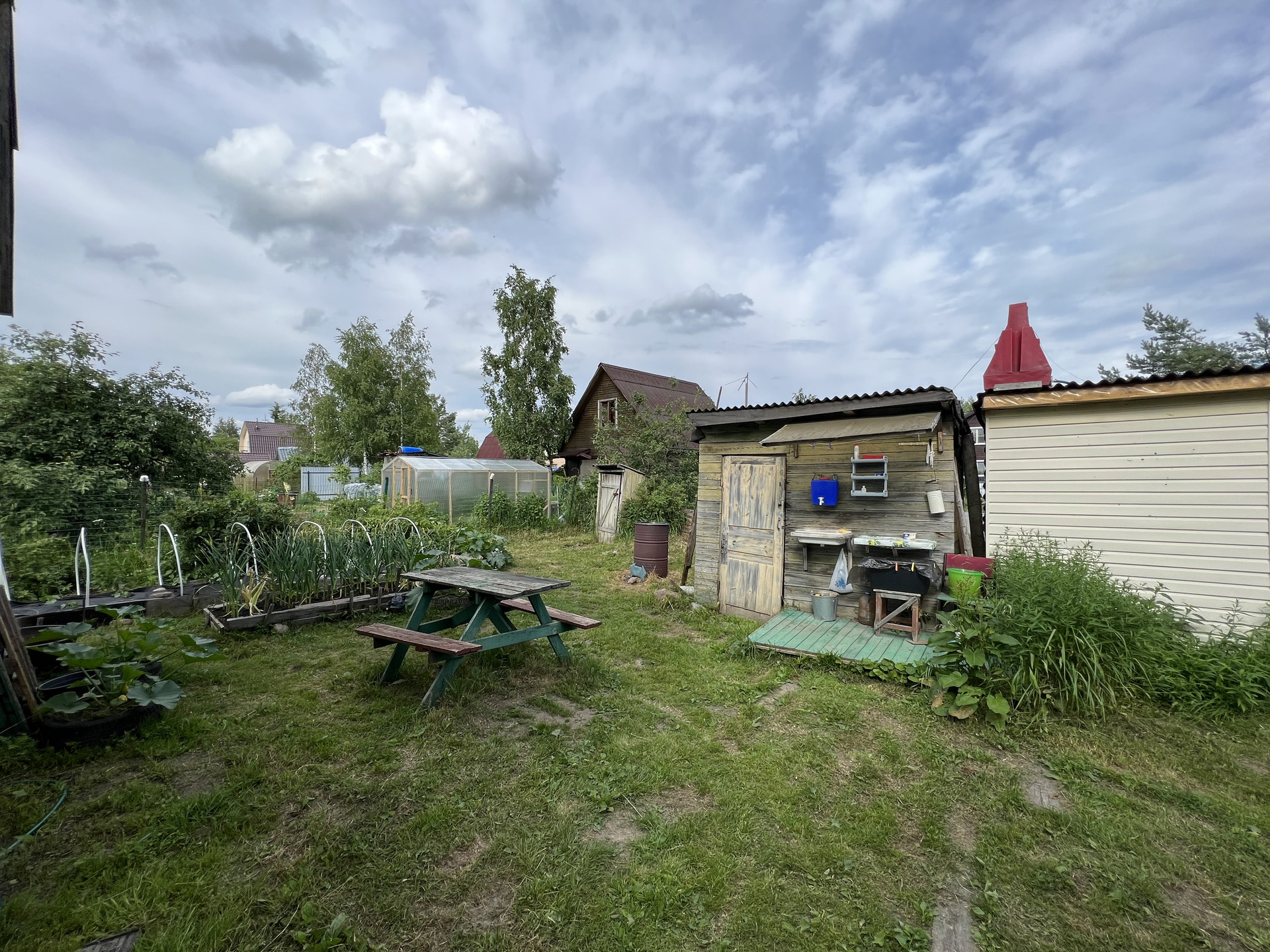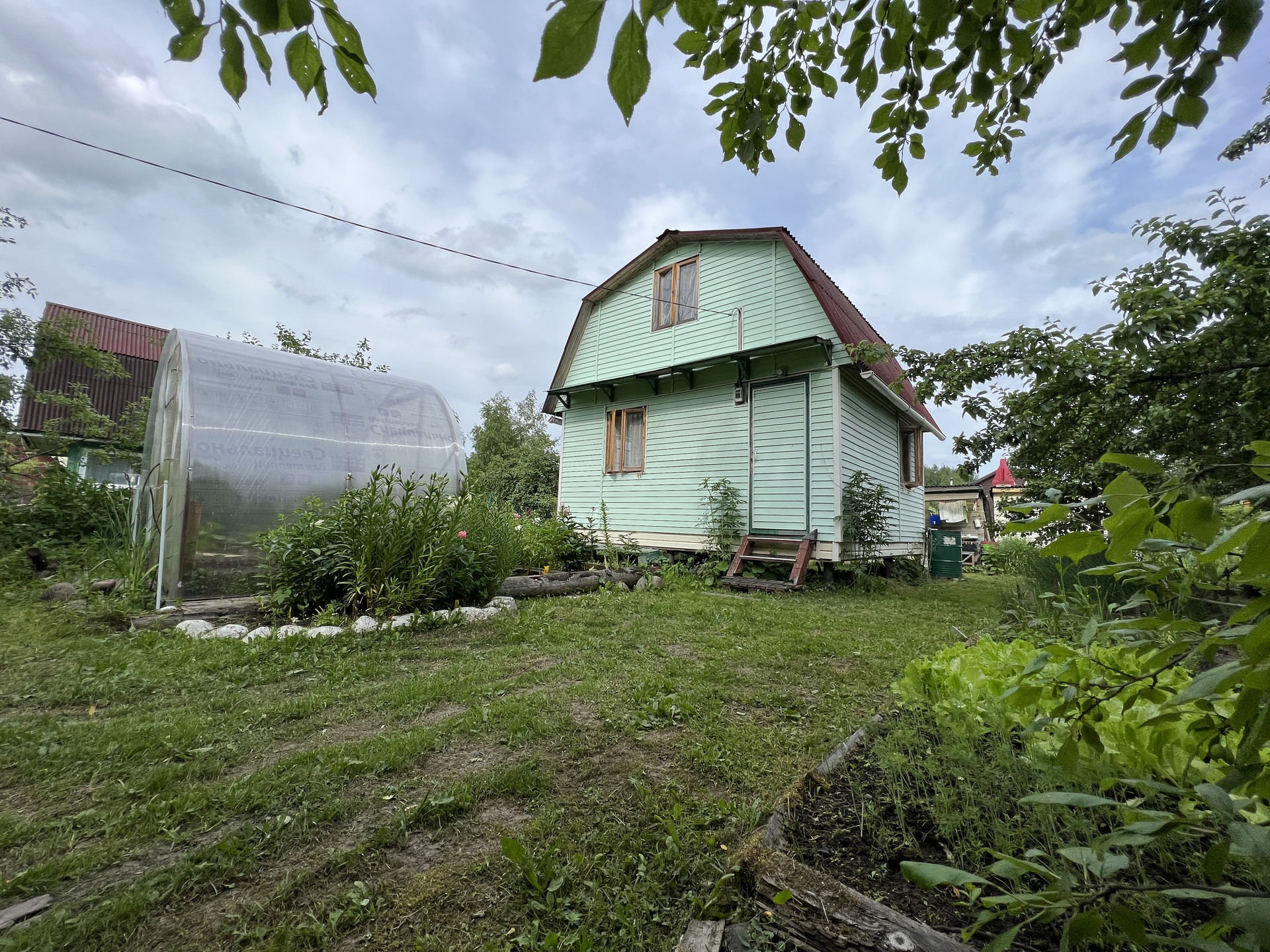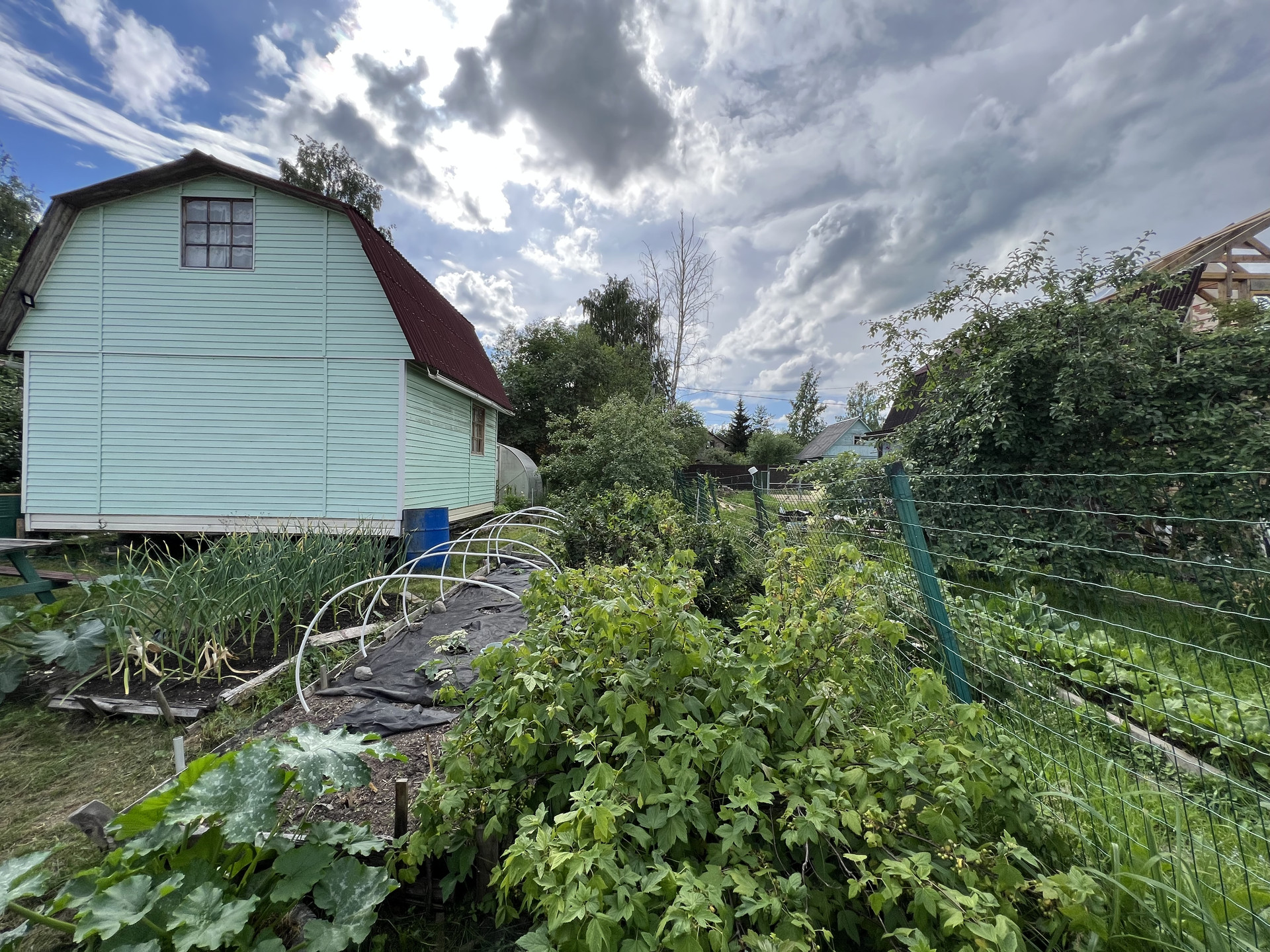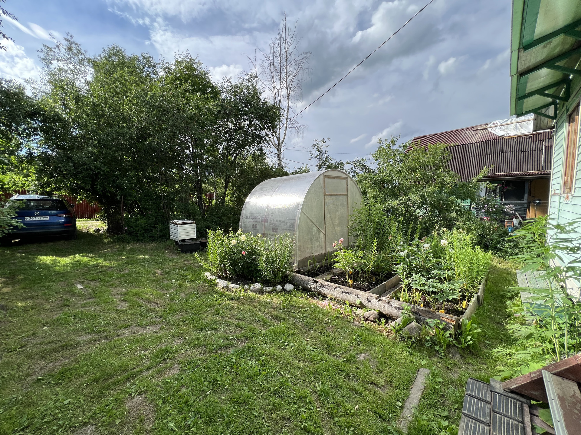 На участке новая теплица, плодовые деревья, яблони сливы, кусты смородины и крыжовника