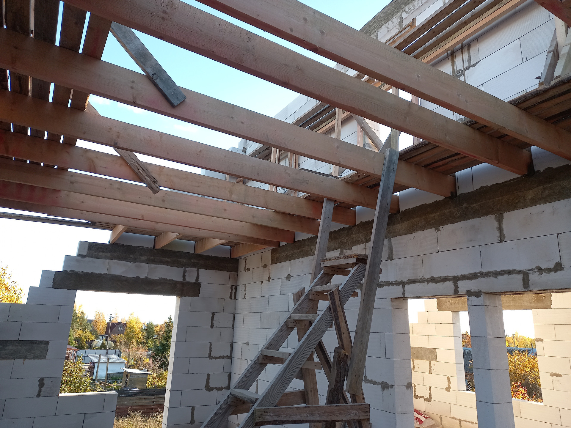 На участке доски и брусья для стропильной системы.