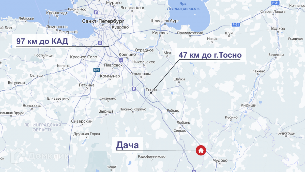 Добраться до СПб можно электричкой, ближайшая станция Бабино-2-в 4 км от дома (в сезон с апреля по октябрь курсирует автобус до станции). За 1 час 50 минут Вы доберетесь до центра города без пробок. Либо можно доехать на автобусе № 321 до Любани (30 минут), от Любани до Тосно на автобусе № 320 (40 минут), от Тосно до СПб на автобусе № 610 (45 минут).