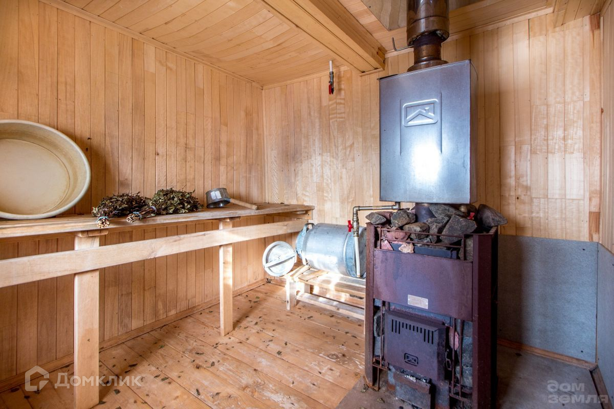 Баня из бруса, на бетонных блоках. Парная, прихожая и комната. Вода в баню заведена по летнему, имеется накопительный бак на чердаке.