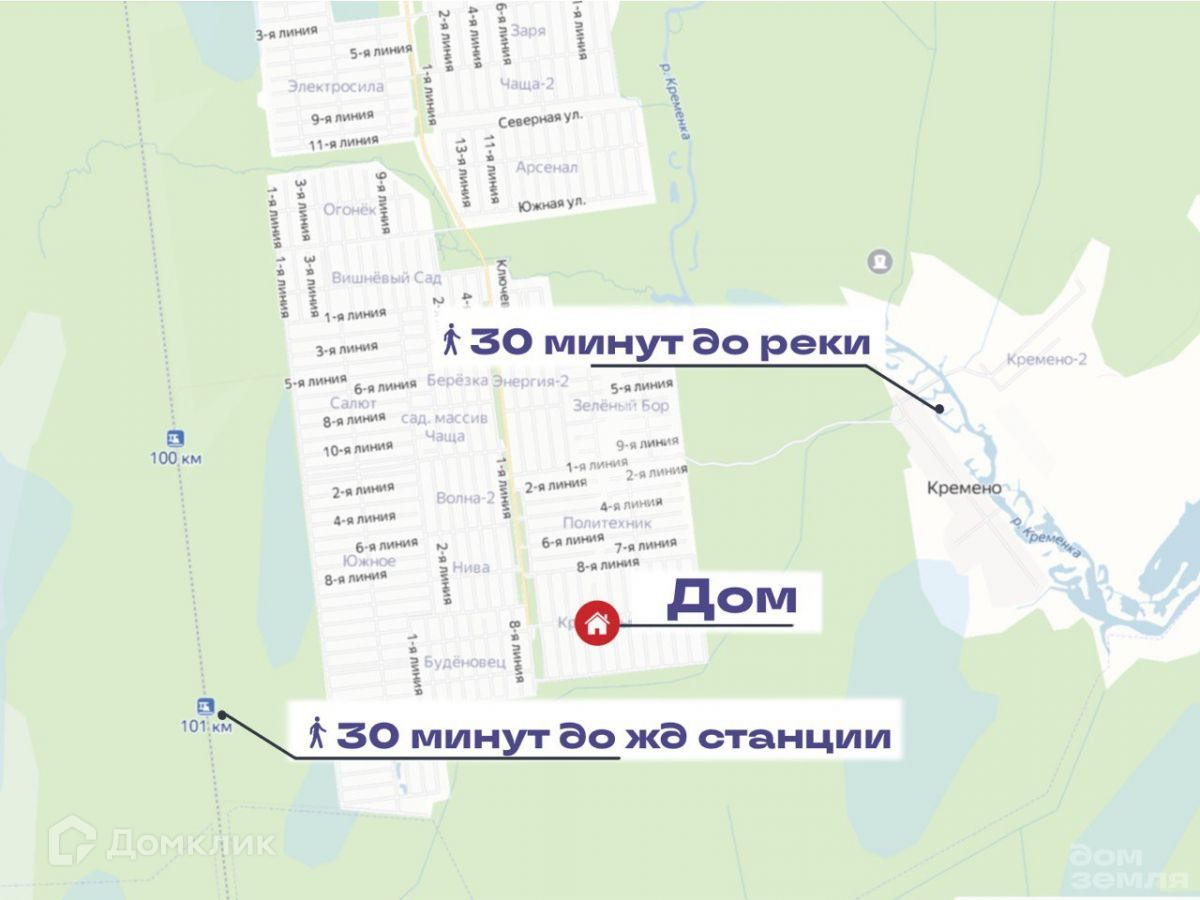 Расположен дом в массиве Чаща, СНТ Красновыборжец, в 30 минутах ходьбы от жд станции "101 км". От СПб 100 км на автомобиле, либо на электричке с Витебского вокзала до ж/д станции «101 км». Садоводческий массив расположен среди леса. Рядом река Кременка. В 10 минутах езды на машине находятся карьеры у п. Новинка, с возможностью семейного отдыха. Экологически чистое и тихое место. Всё есть для полноценной жизни, здорового сна и отдыха на свежем воздухе!