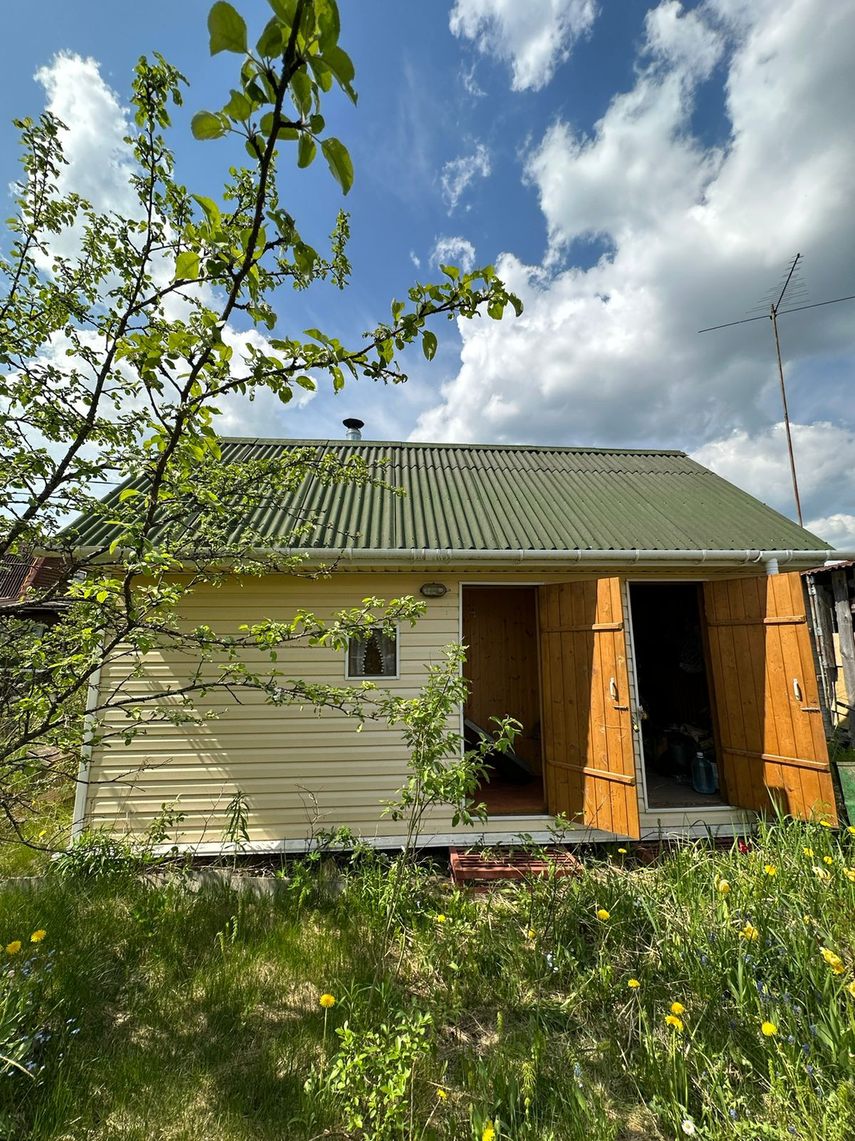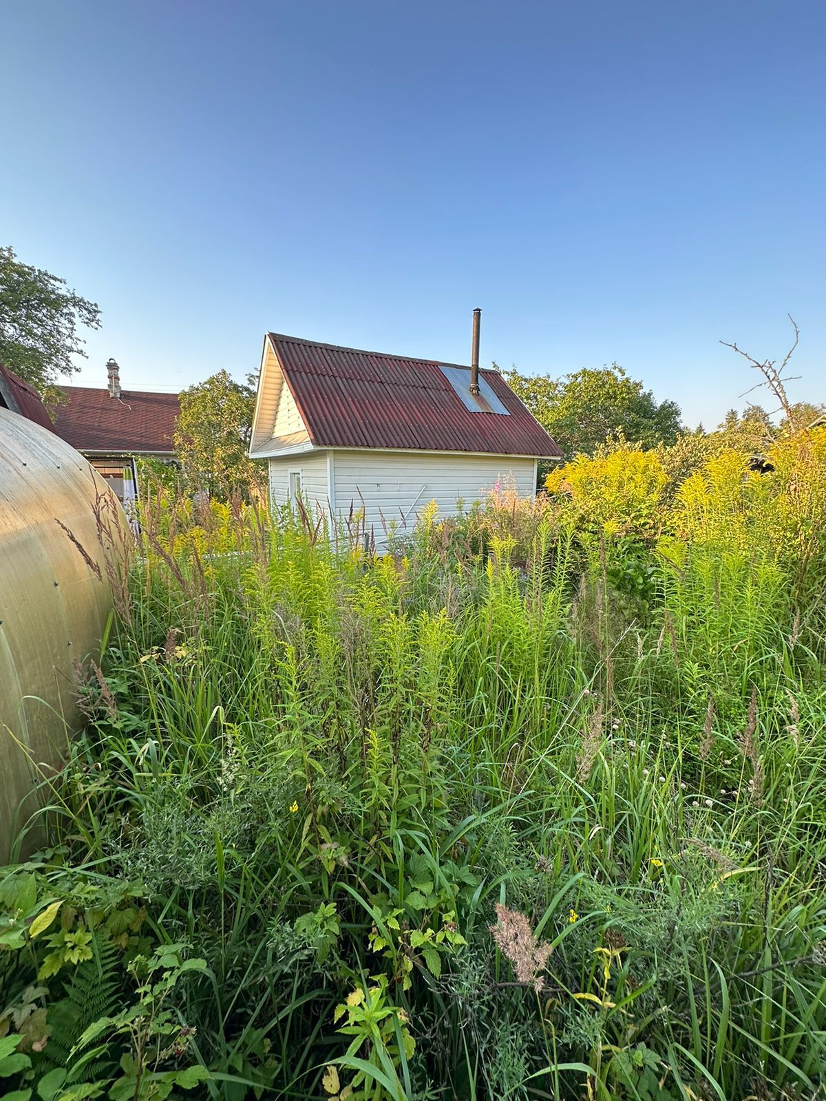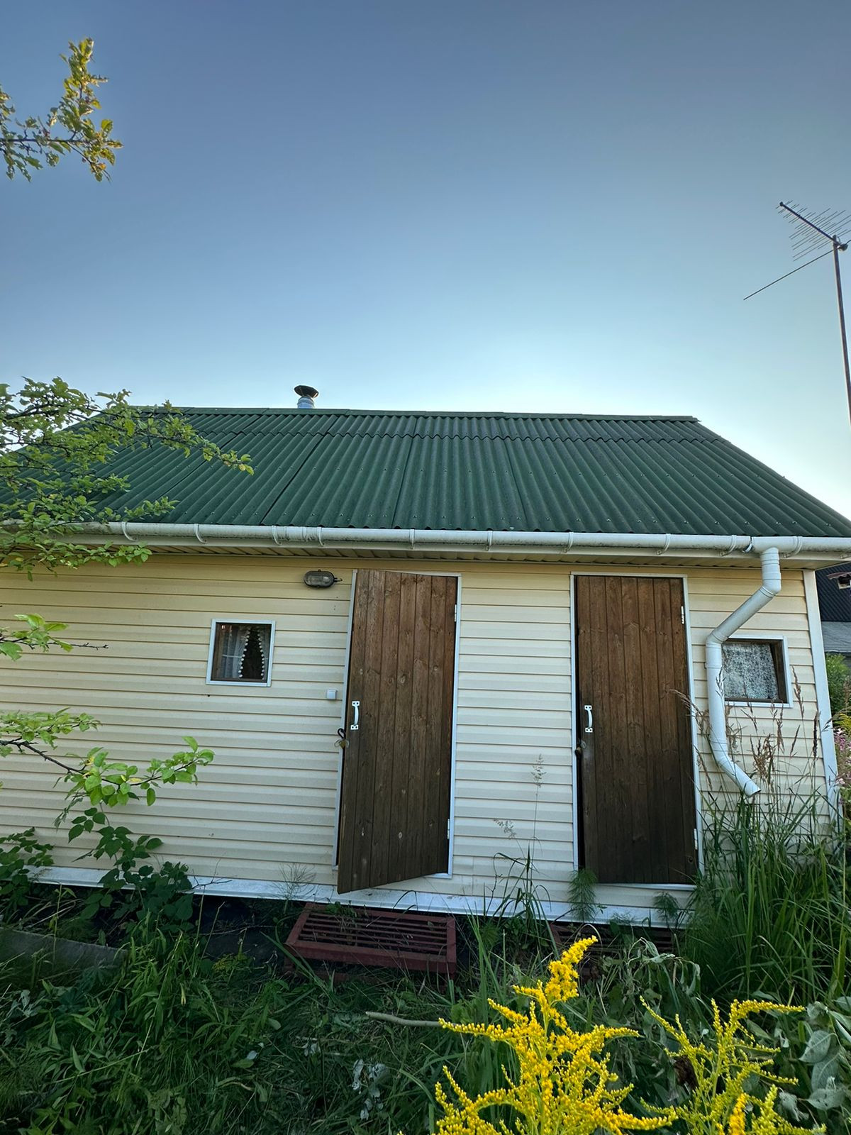 Баня- новая 6*4 из бруса, крыша ондулин. Установлена на сваях. В бане есть: парилка, моечное отделение, с подачей воды сверху, и с/узел. А также с отдельным входом -помещение для хранения хоз.инвентаря.