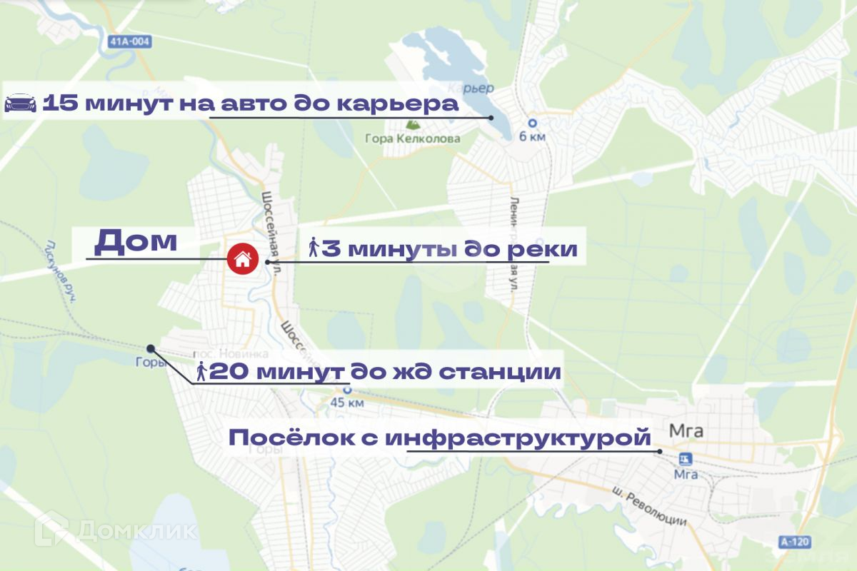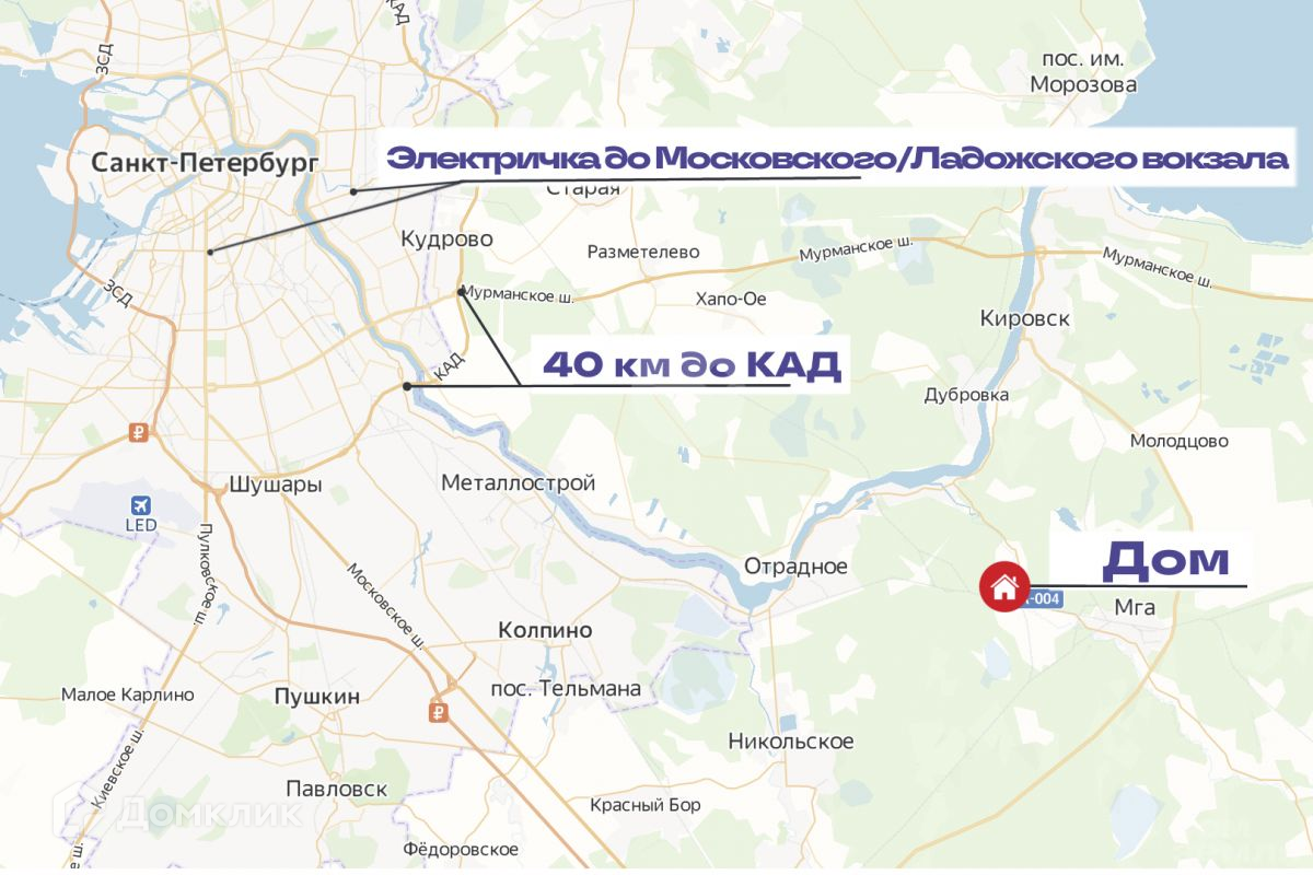 Доехать до дачи можно на электричке с Московского вокзала до станции «45 км» (время в пути 1 час). От Ж/Д станции до дома 20-25 минут пешком. На автомобиле дорога от Санкт-Петербурга займёт 1 час по Мурманскому или Петрозаводскому шоссе.До г. Кировск - 18 км. В Кировске развитая инфраструктура: школы, детские сады, хозяйственные и продуктовые магазины, больница, рынок, бассейн.