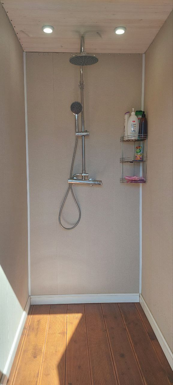 Есть кабинка уличный летний душ, (на фото серый сайдинг) в нем же отдельная кабинка расположен бойлер и стиральная машина.