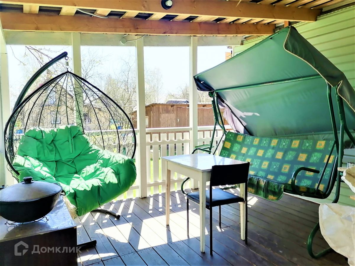Построен в 2000х годах из бревна 150мм, снаружи в качестве оформления использован виниловый сайдинг. Кровля застелена ондулином. По всему дому установлены пвх стеклопакеты. Фундамент у дома ленточный + блоки для террасы.
