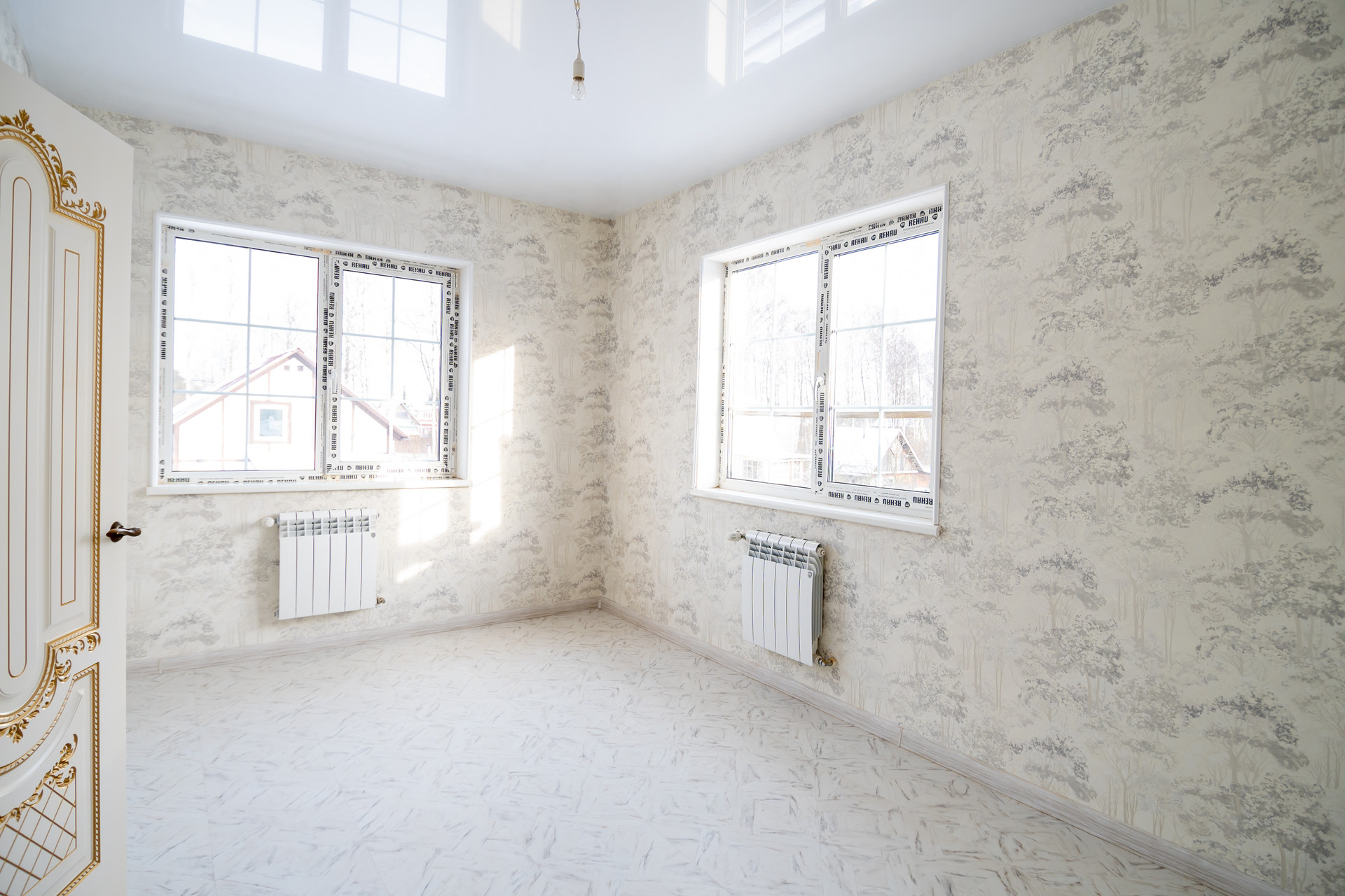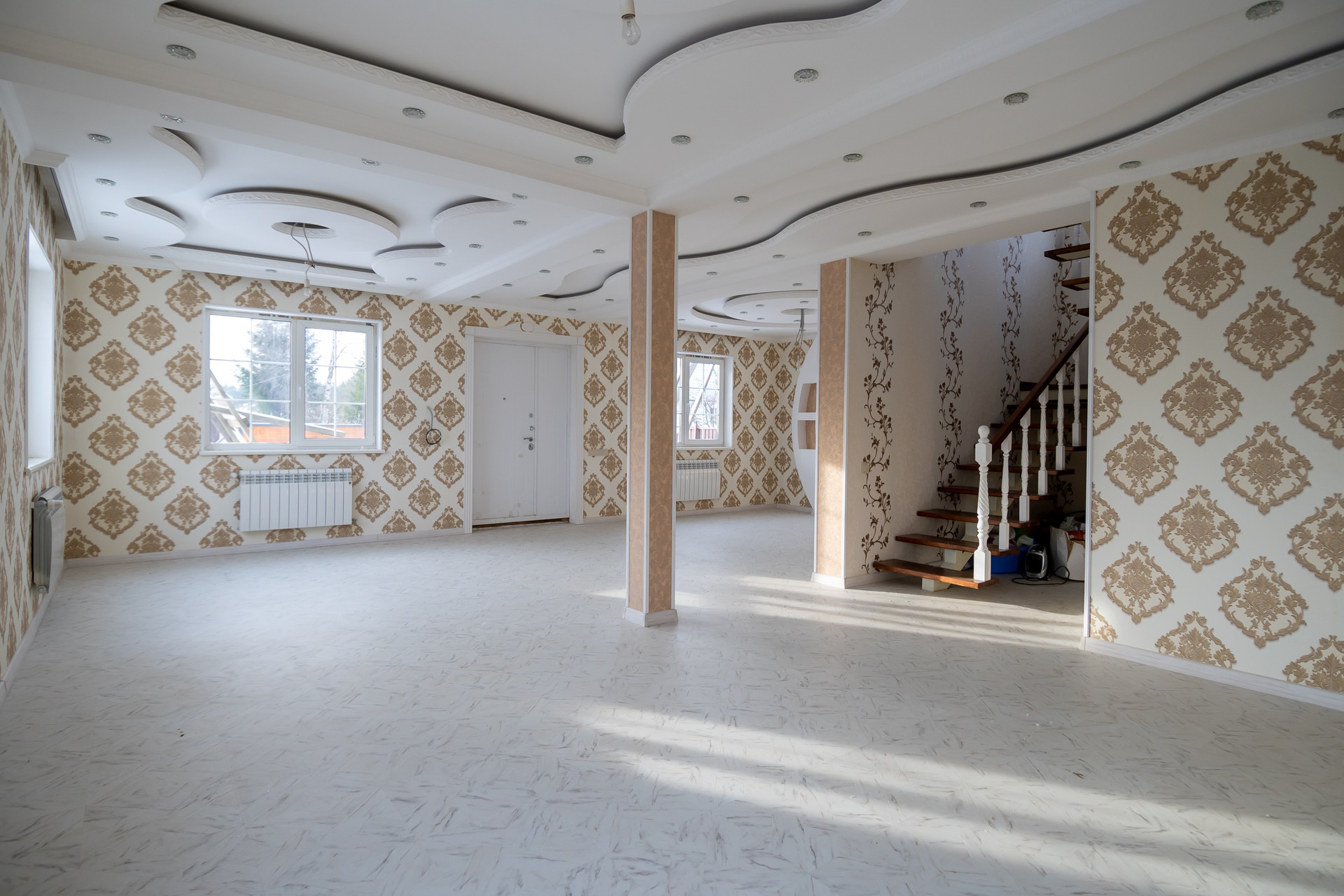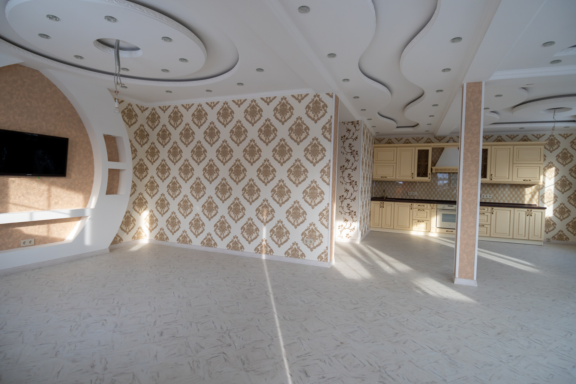 Потолок - натяжные и гипсокартонные (с узорами).