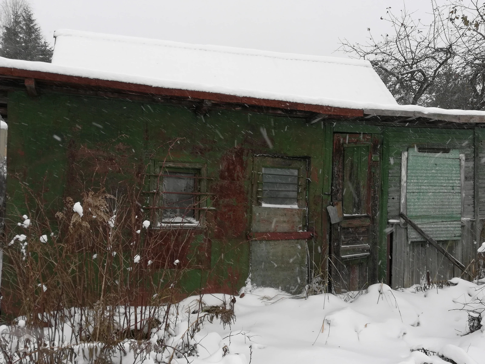 Дом двухэтажный. Внизу - большая комната с печкой, кухонька и веранда, на втором этаже две маленькие спальни. Учасок по периметру огорожен от соседей старым деревянным забором, есть колодец, из построек - сарай для хранения инвентаря и материалов с туалетом.