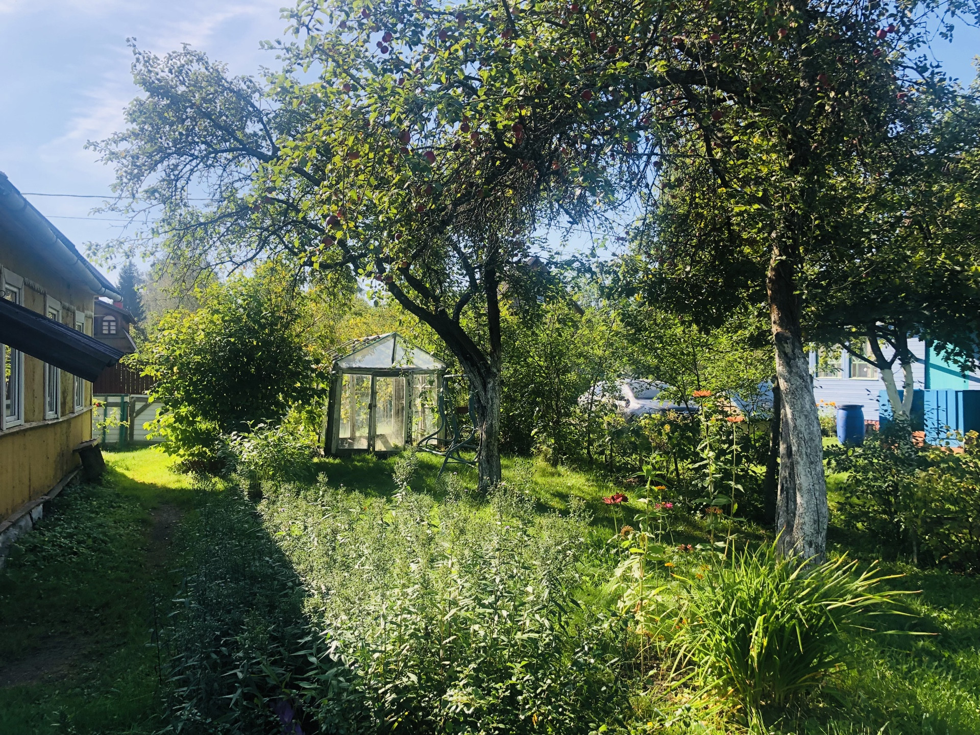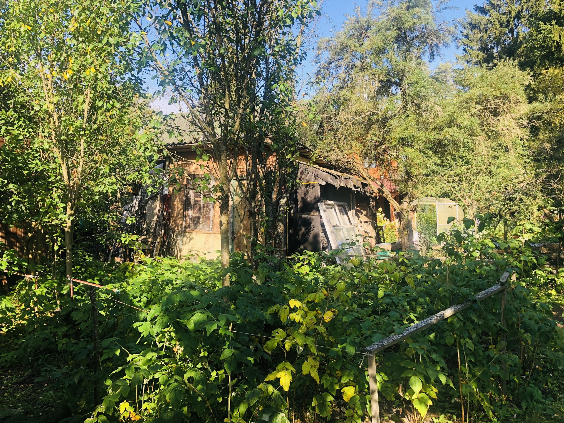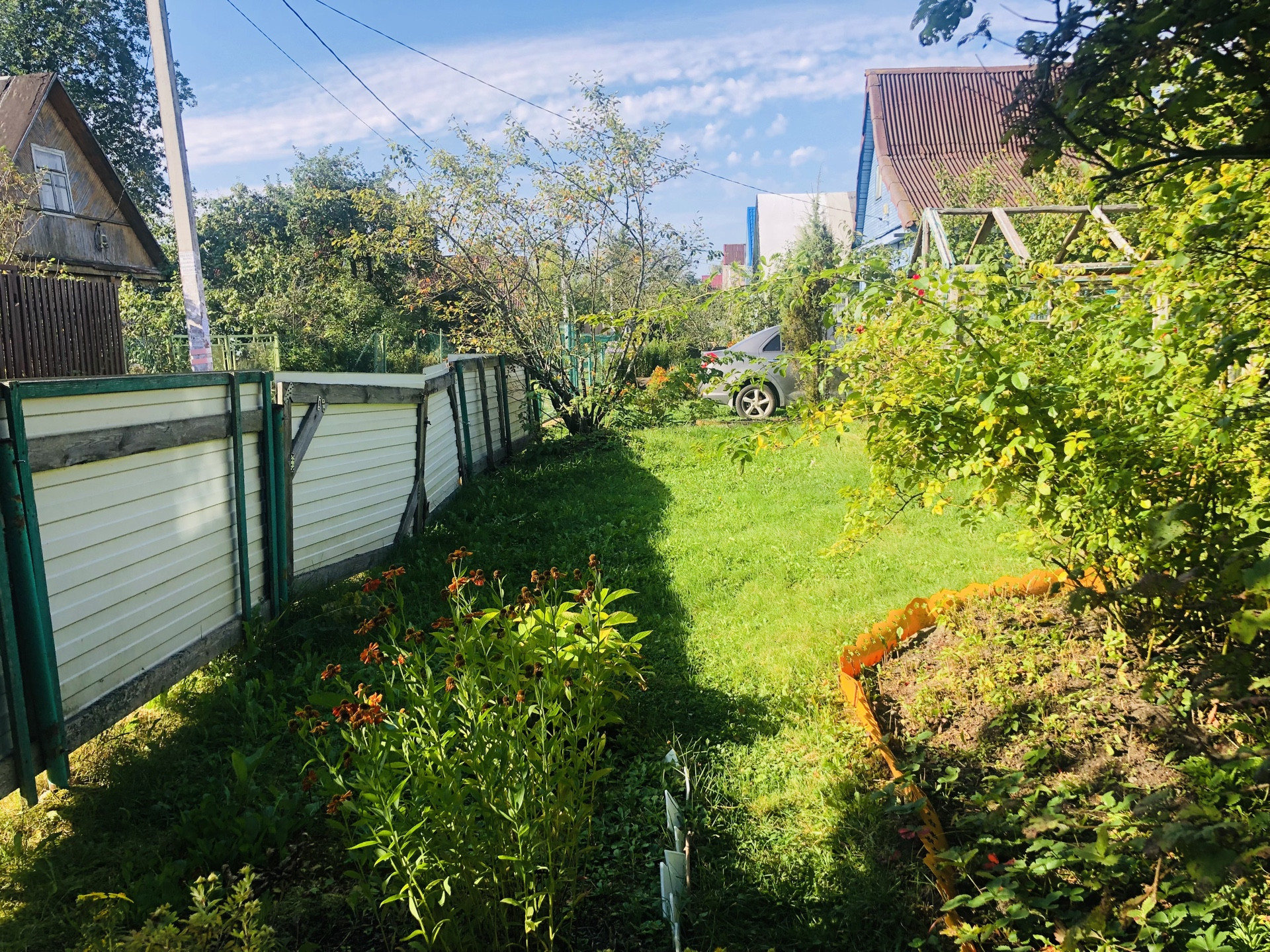 Участок, разработан, растут плодовые кусты и деревья, имеются грядки и теплица, декоративные растения и цветы. Участок огорожен забором есть въезд с воротами и  площадкой под авто. Участок огорожен забором- сетка рабица.