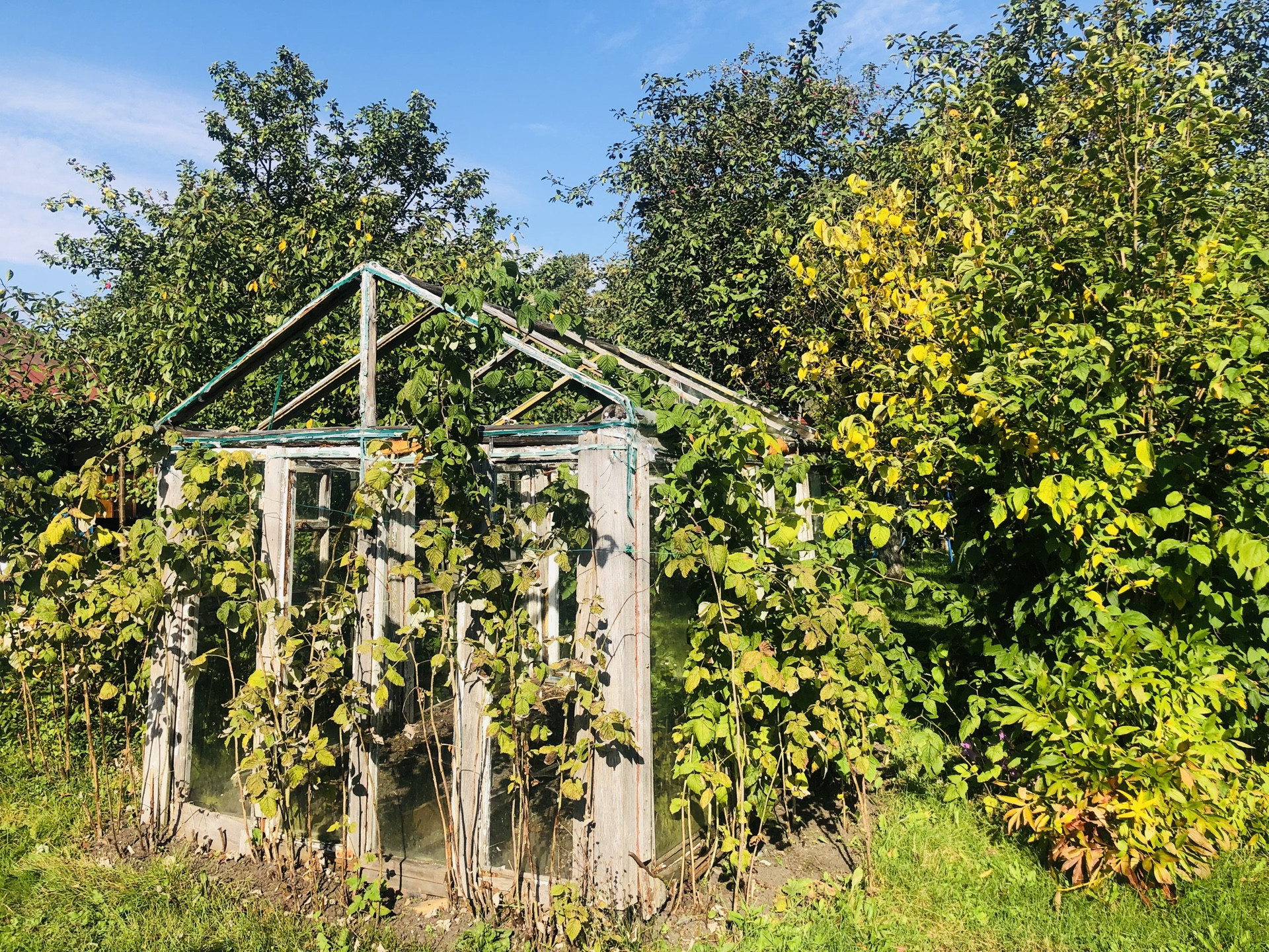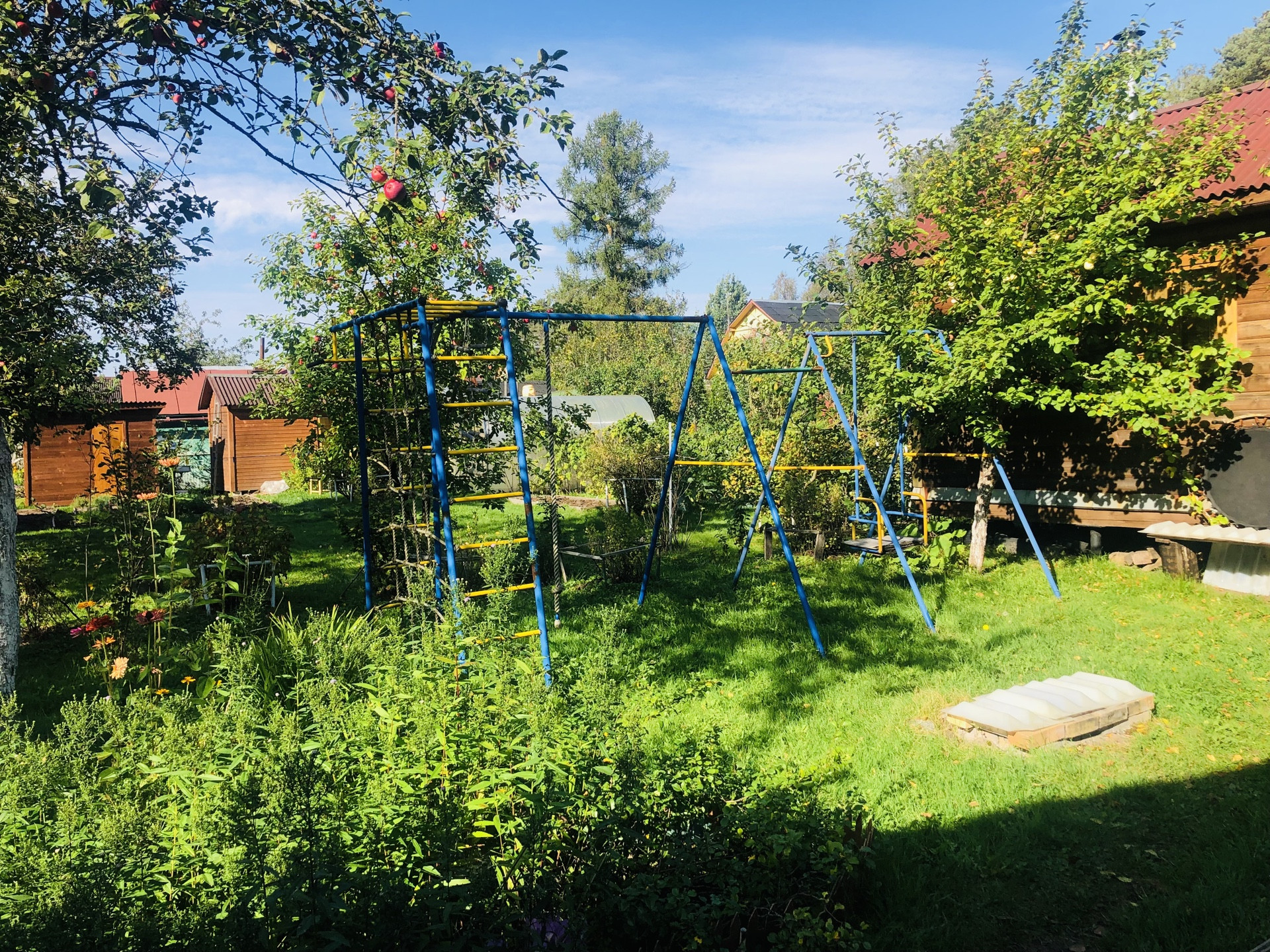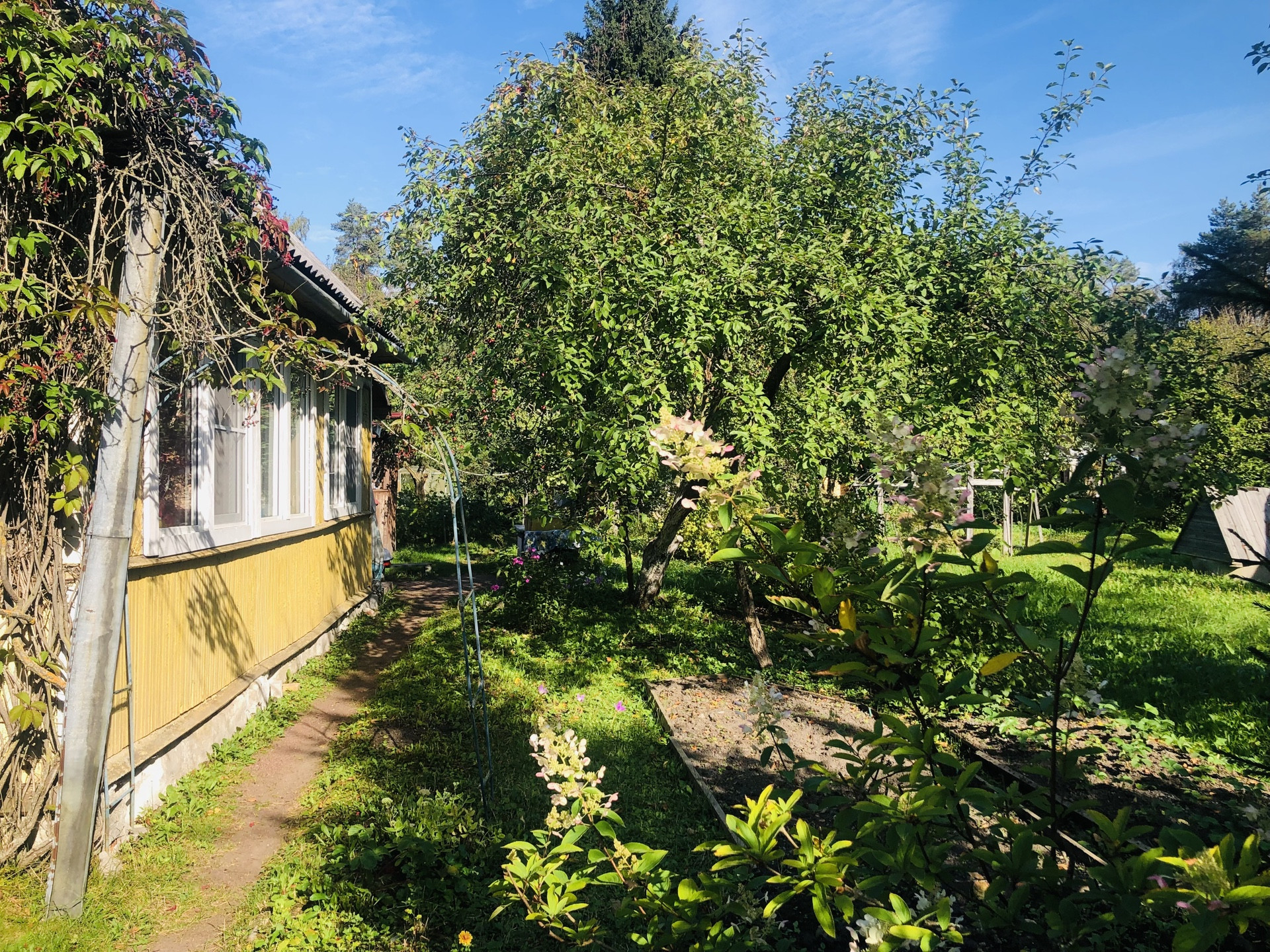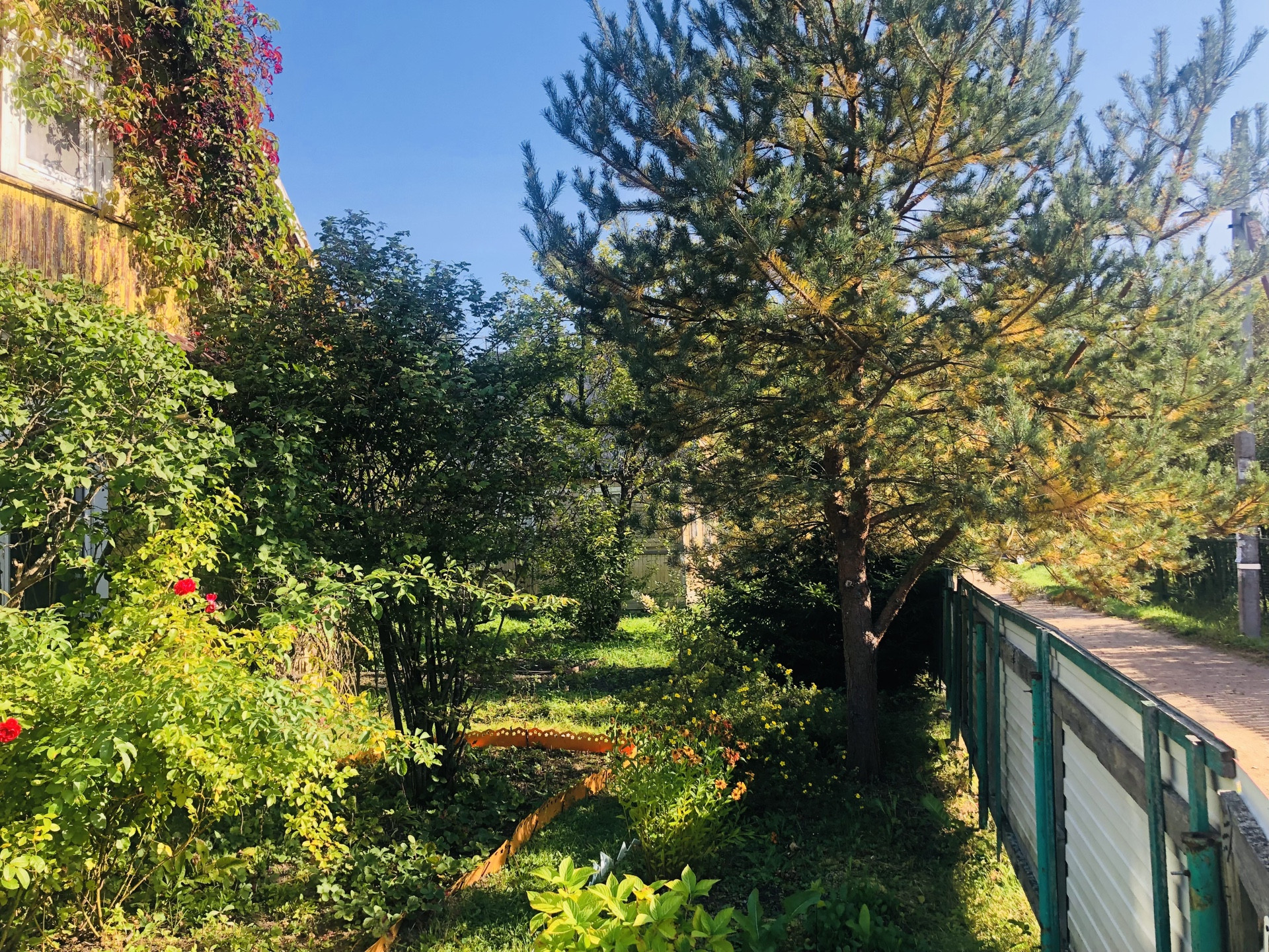 Участок, разработан, растут плодовые кусты и деревья, имеются грядки и теплица, декоративные растения и цветы. Участок огорожен забором есть въезд с воротами и  площадкой под авто. Участок огорожен забором- сетка рабица.