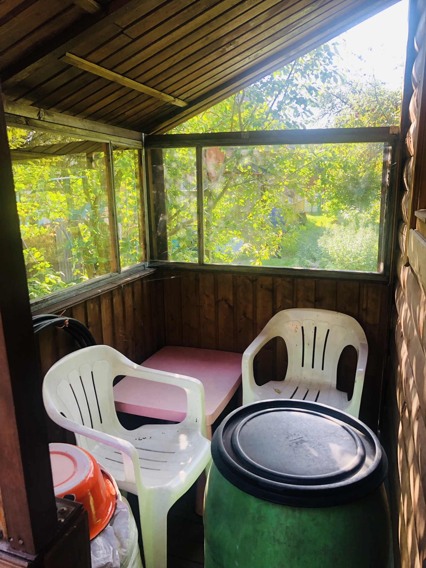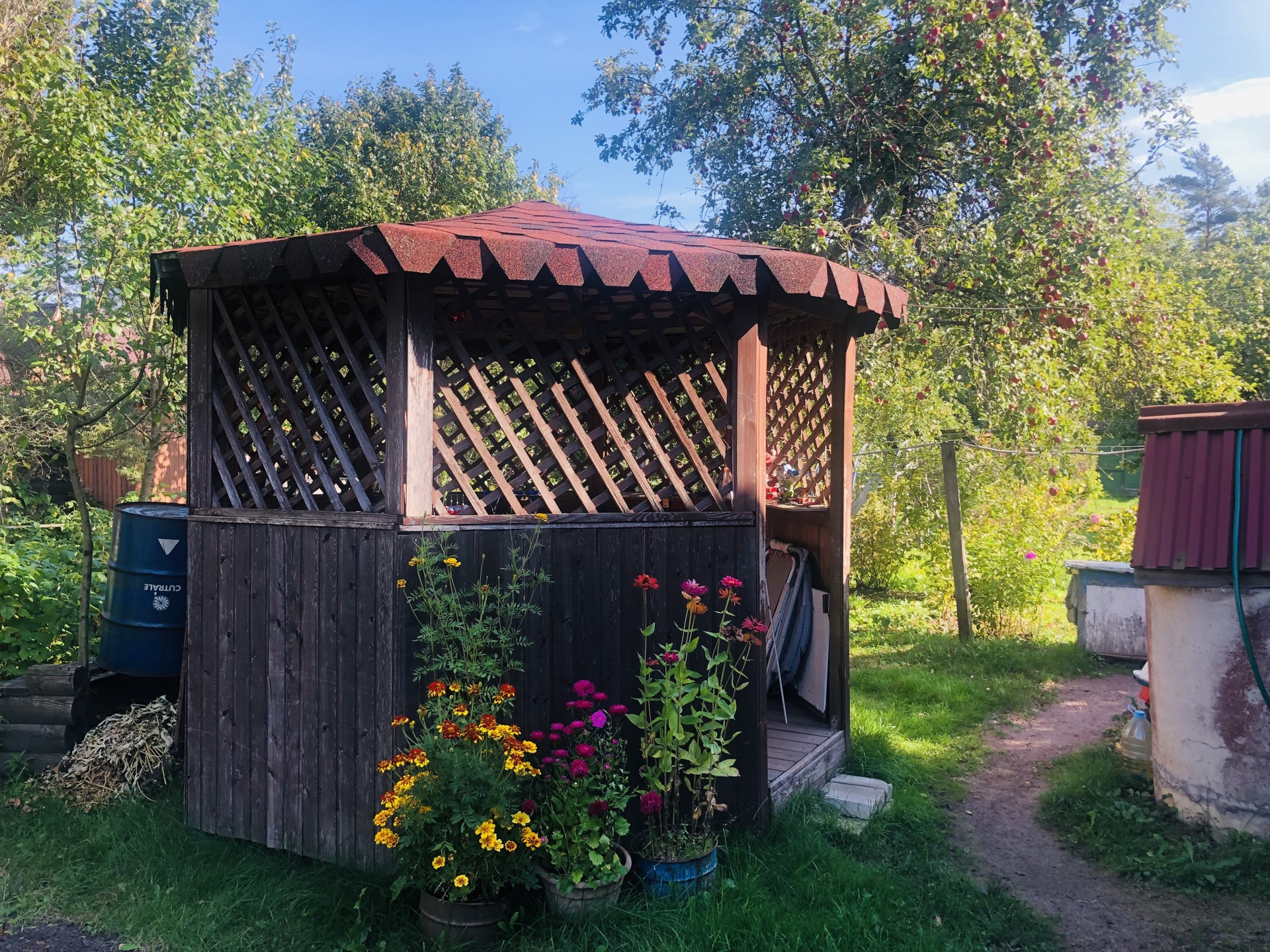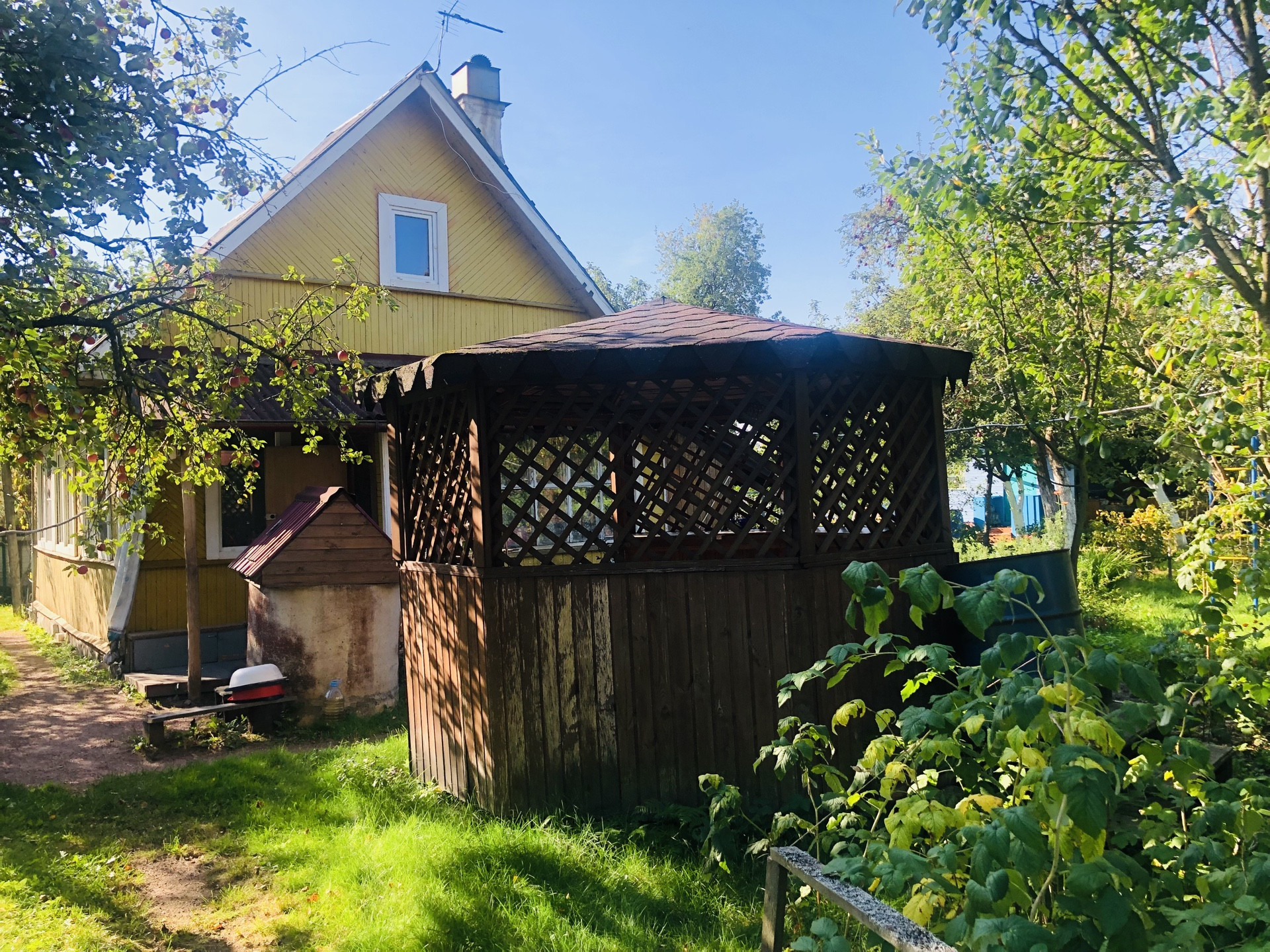 На участке есть брусовая баня (2021 года постройки размером 4х4 м, стоит на винтовых сваях). В бане: парная, помывочная, комната отдыха. Еще на участке: хозблок, беседка. Все постройки в очень хорошем состоянии.