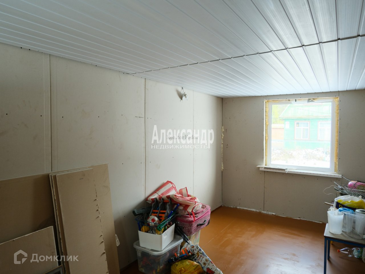 Фасад первого этажа обшит сайдингом с дополнительным утеплением. Стены комнат обшиты вагонкой и гипсокартоном, уложены новые полы, потолки обшиты пластиком.
