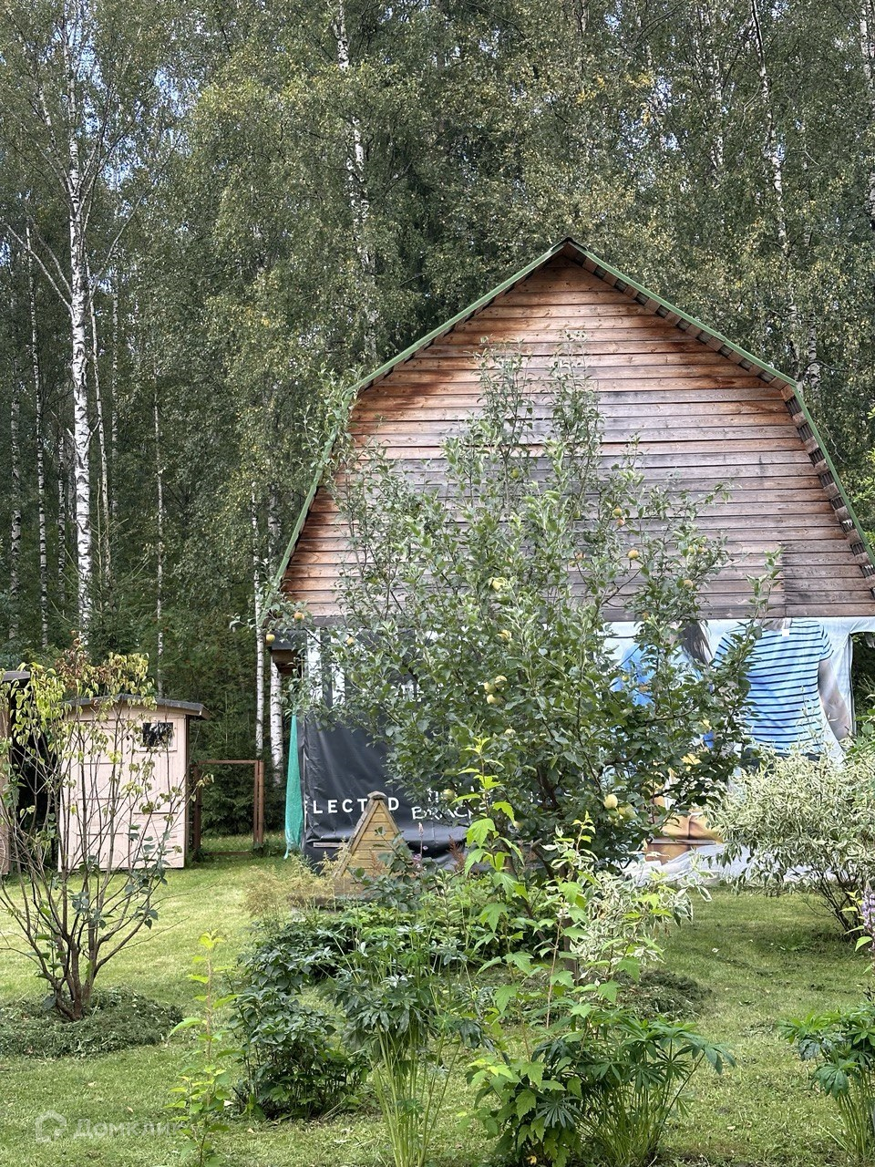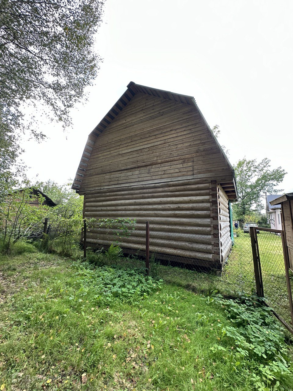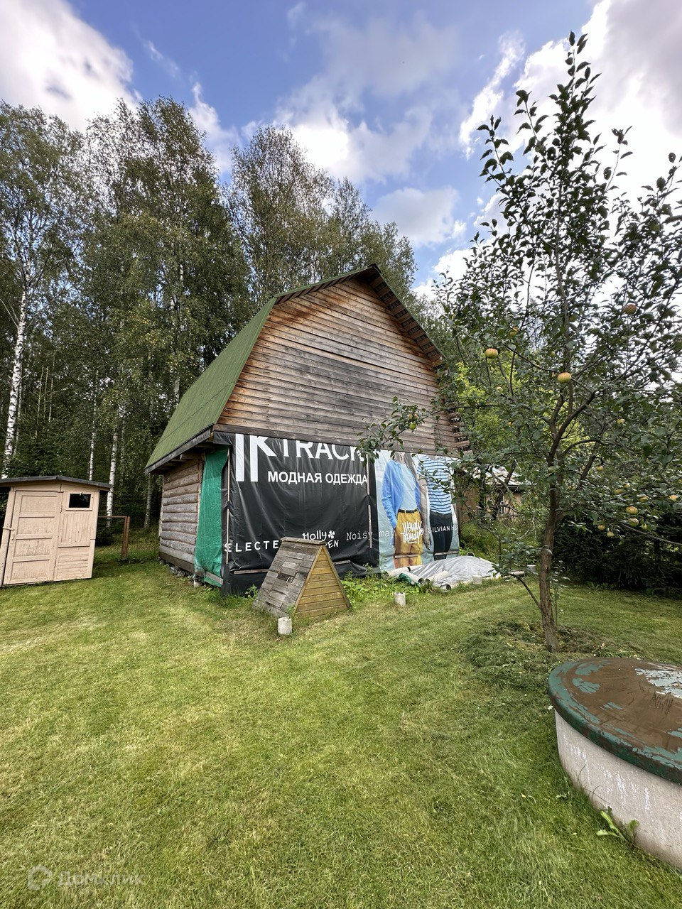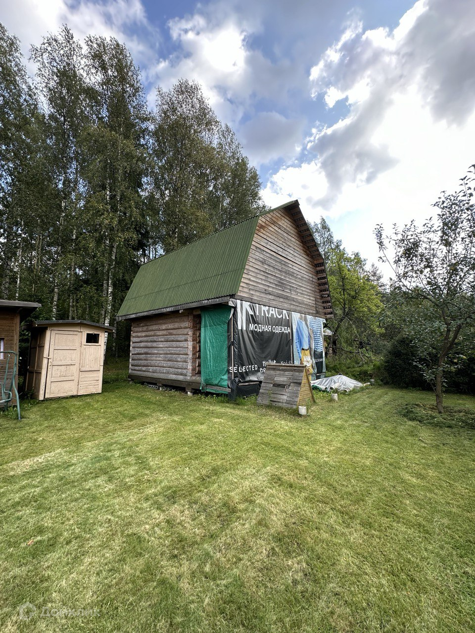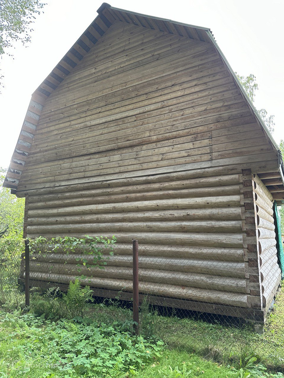 На противоположном углу участка, ближе к лесу, установлен сруб 4х6, в 2 этажа, с выносом на 2 м. Отстоялся в течение 5 лет. Без отделки, стоит на опорах под крышей.