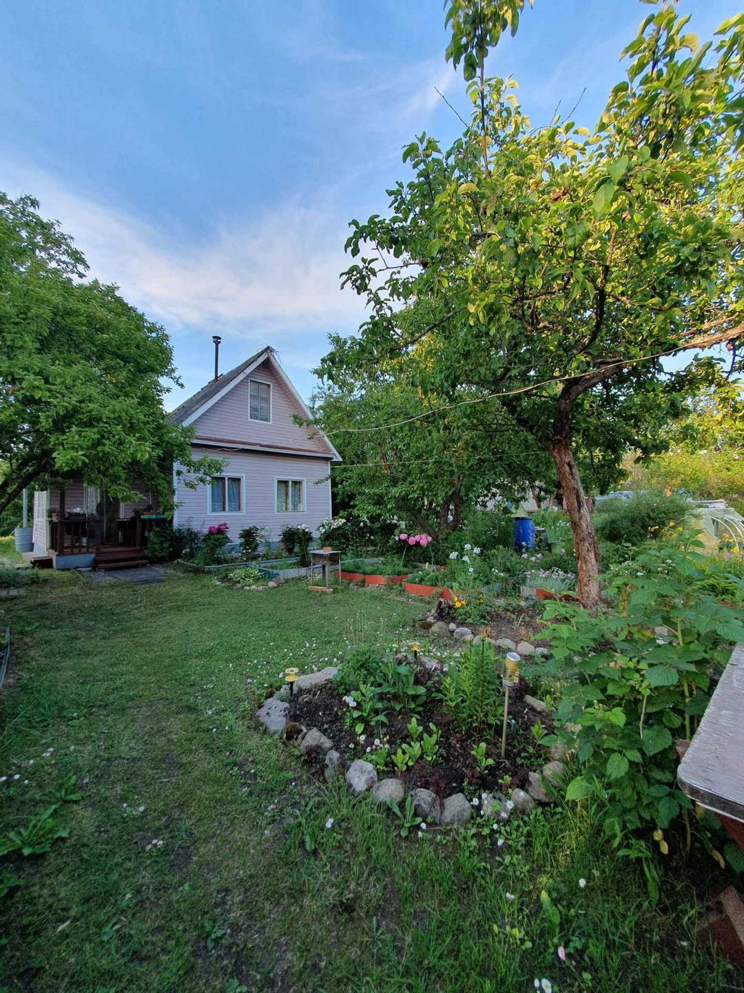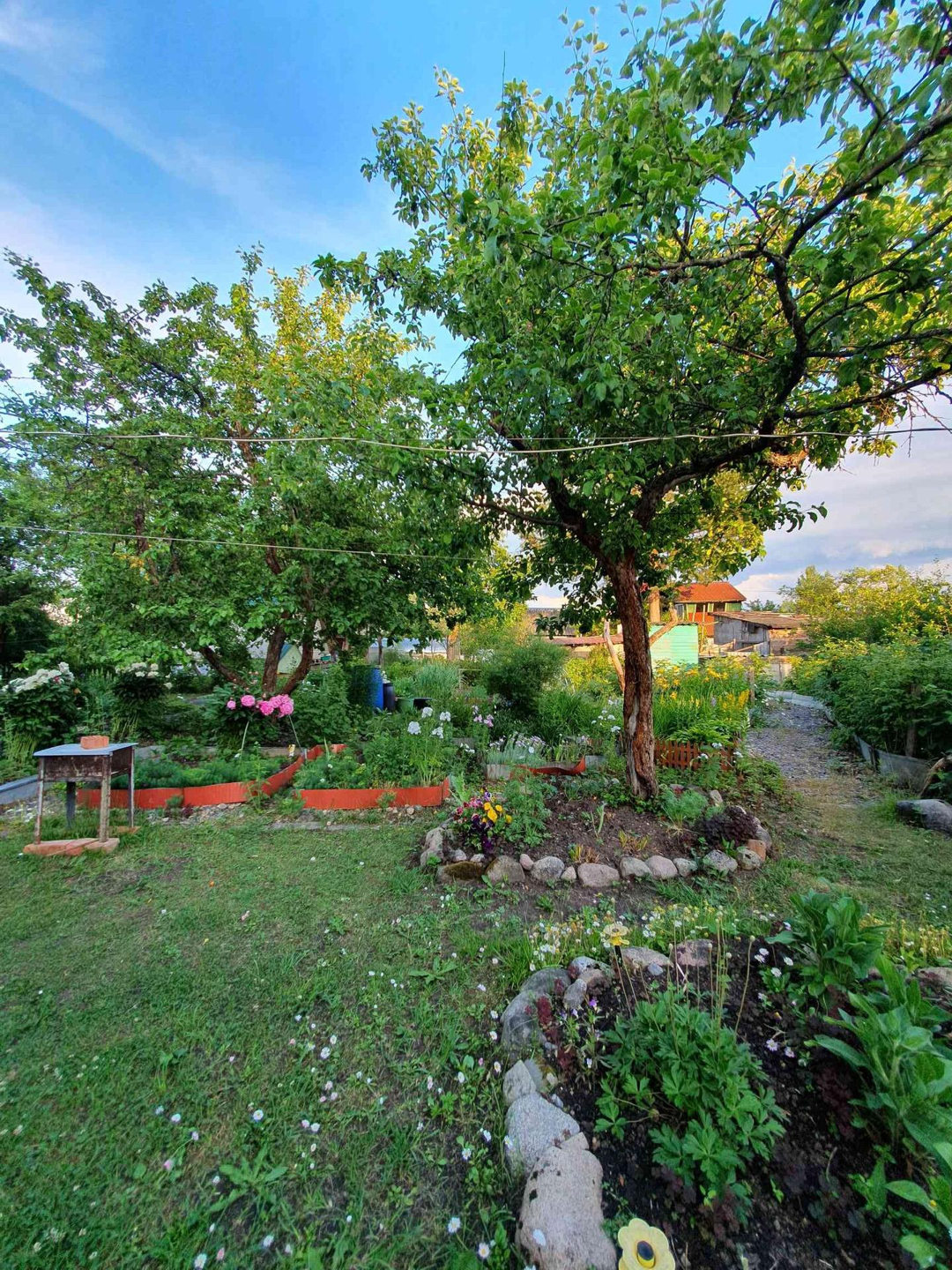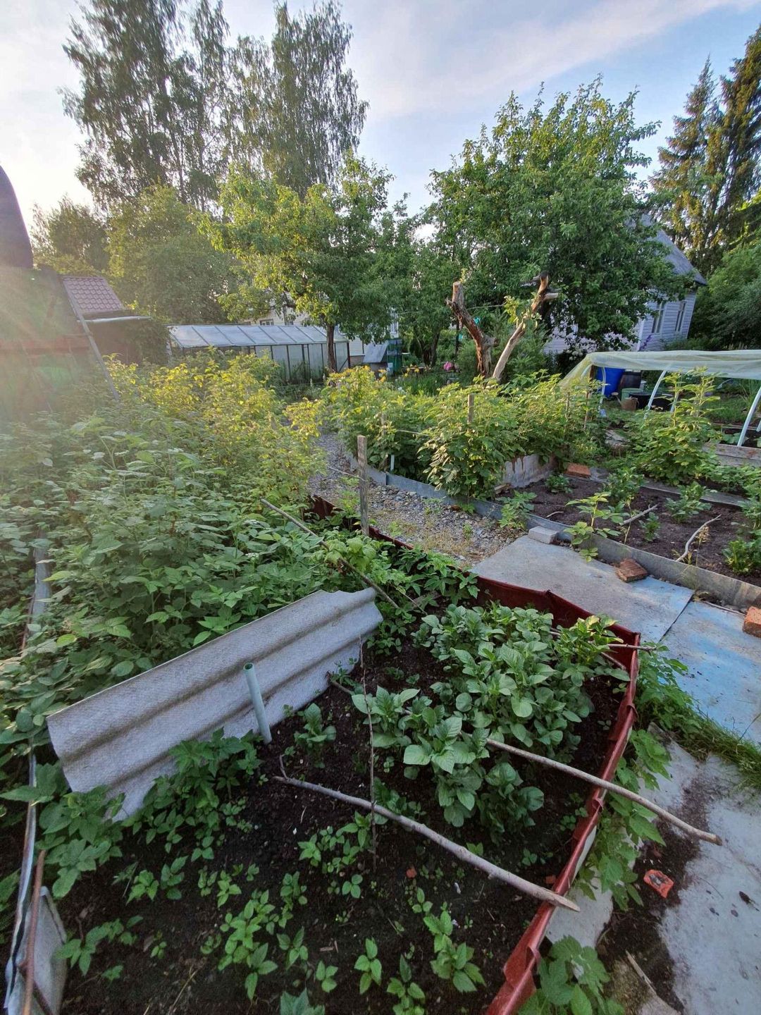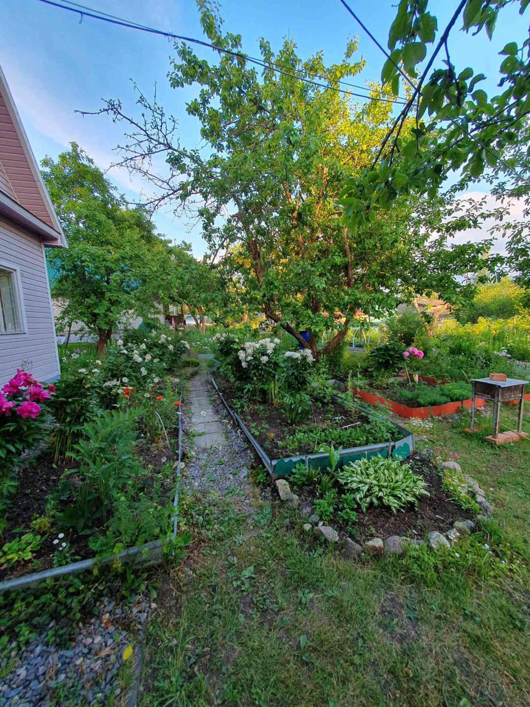 Ровный сухой участок грамотно зонирован,сделан дренаж, "работает" каждый сантиметр. Клумбы с розами,пионами,лилиями разных цветов дарят красоту и благоухание;большой плодоносящий малинник, на участке растут яблони,груши, слива разных сортов. Разбиты грядки для выращивания различных овощей, установлены теплица и парник.