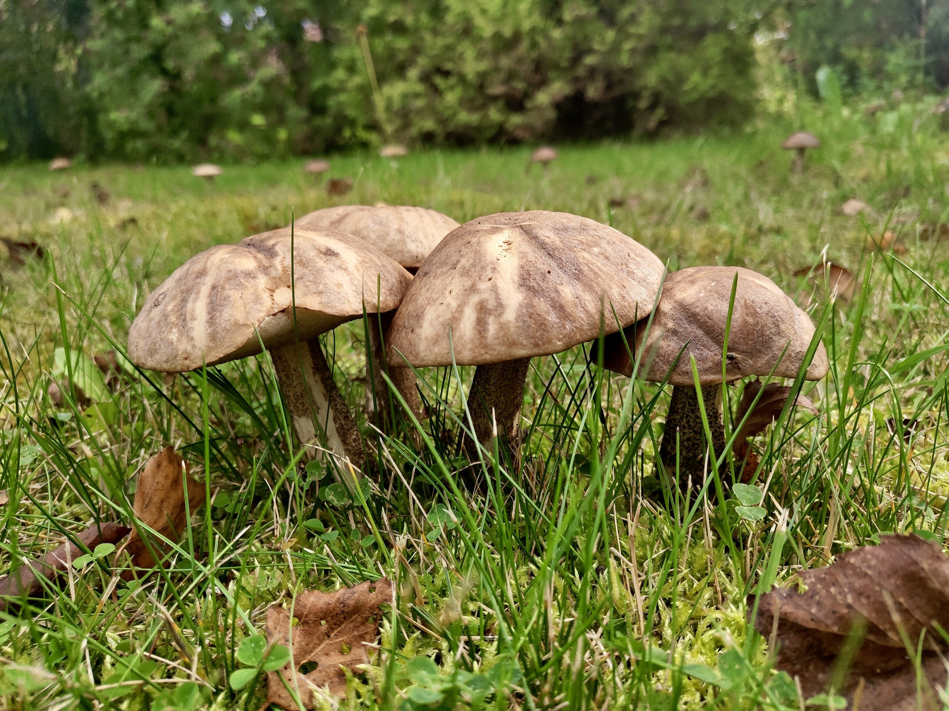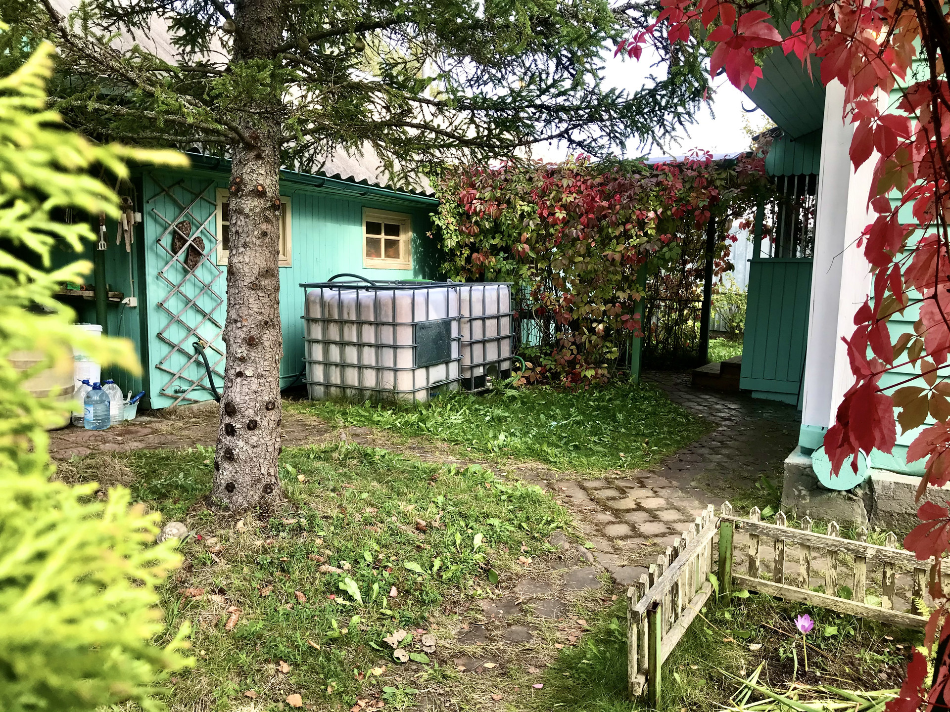 На участке посажены плодовые кусты и деревья, многолетние цветы, растут подберезовики.
