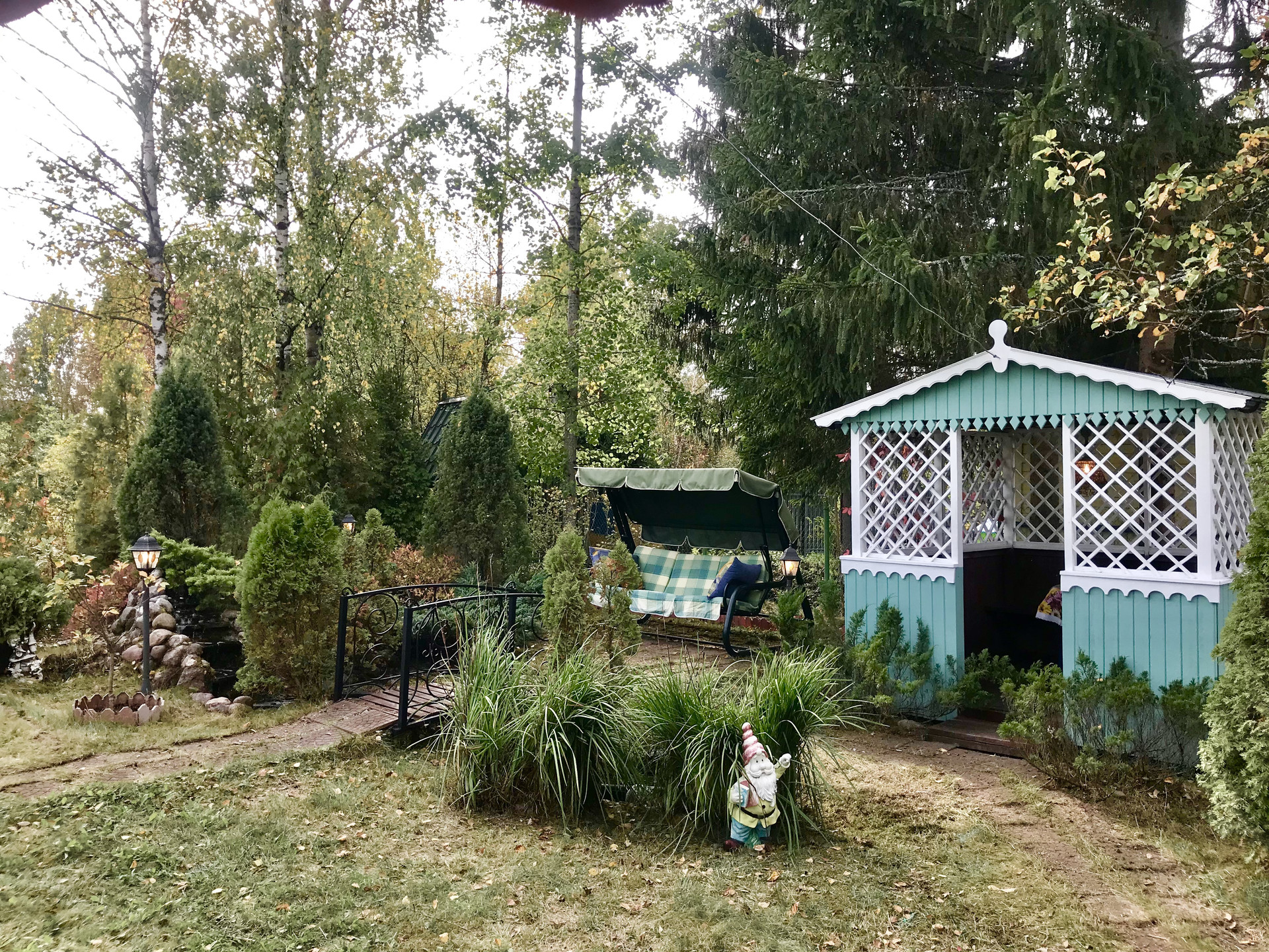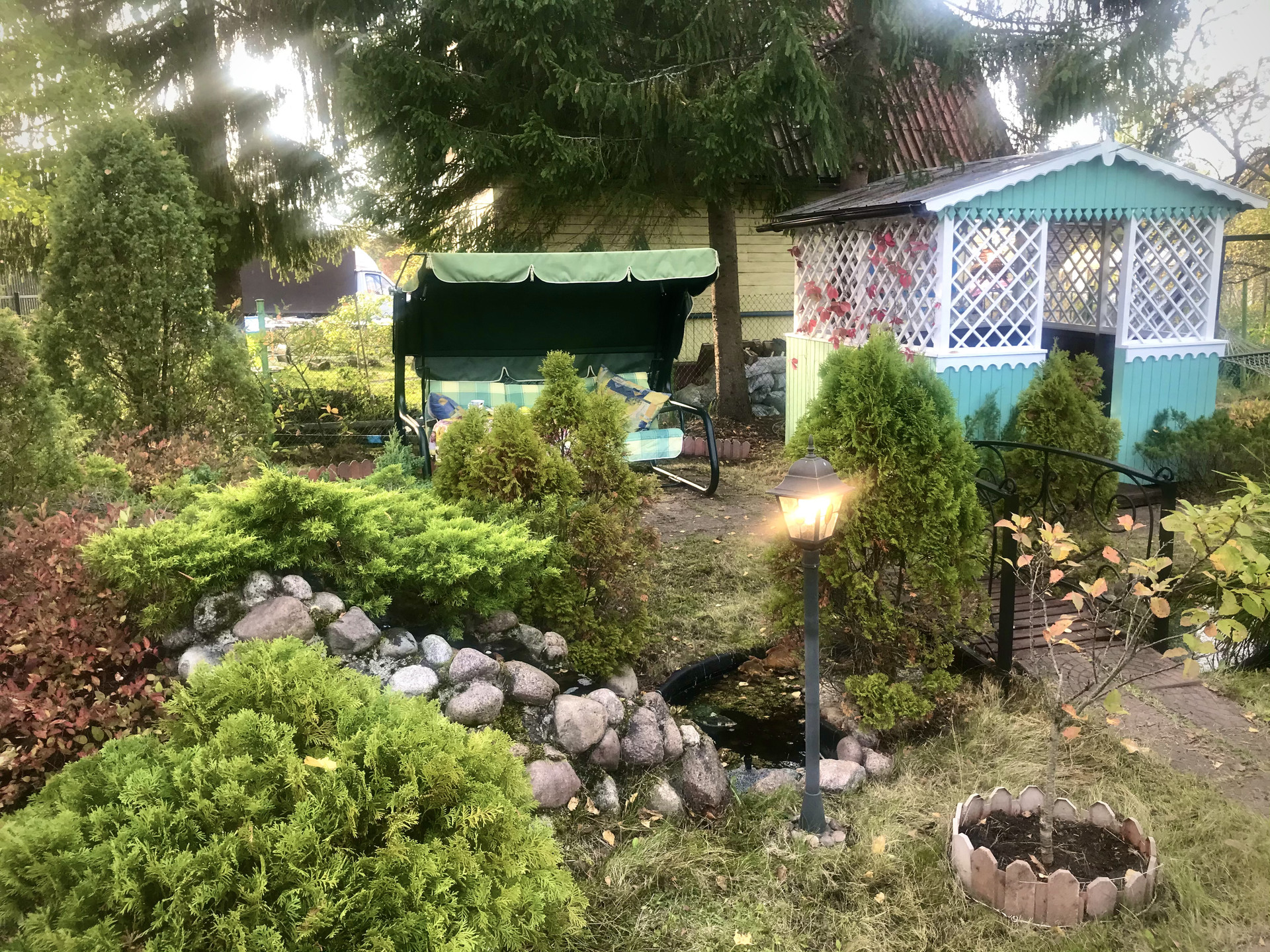- качель с зоной отдыха, альпийской горкой, хвойными растениями, водоемчиками, мостиком, небольшим ручьем и фонтаном