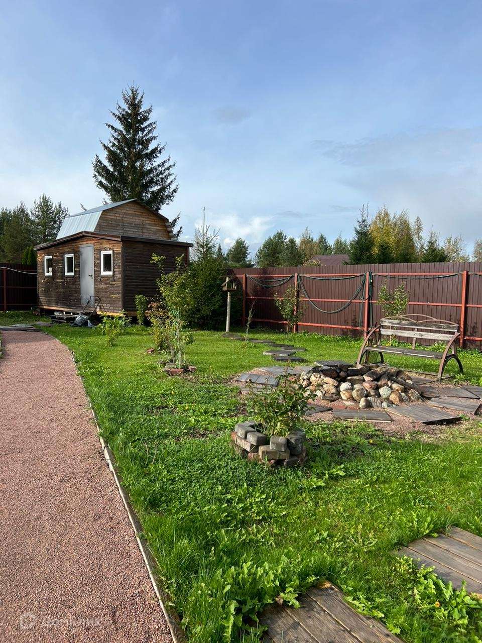 Участок сухой с прекрасным газоном, лаундж зоной, зоной парковки, огорожен.