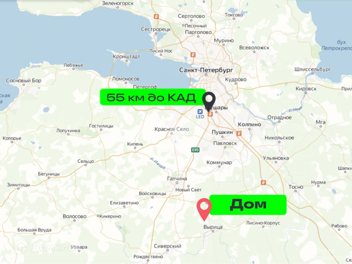 Расположен дом в массиве Красницы, СНТ Парус. От СПб 55 км на автомобиле, либо на электричке с Витебского вокзала до ж/д станции «Красница». В 5 км находится посёлок Вырица.