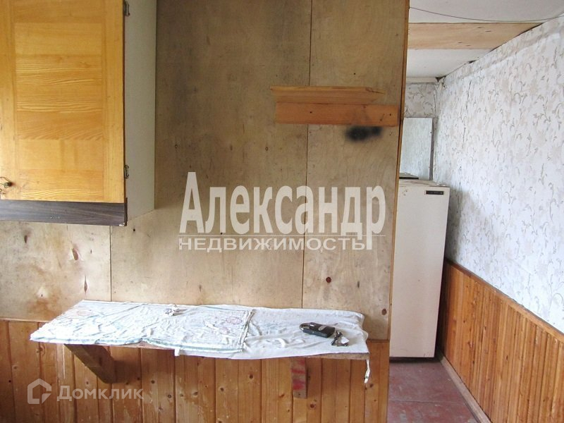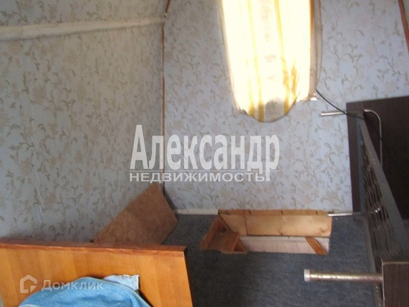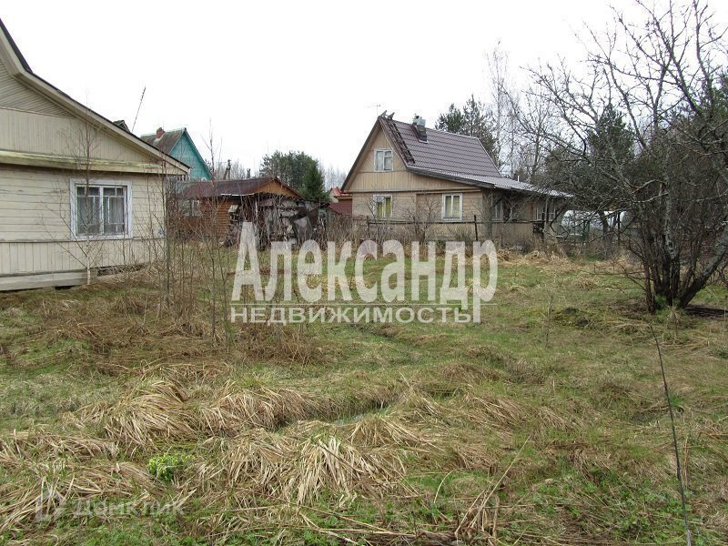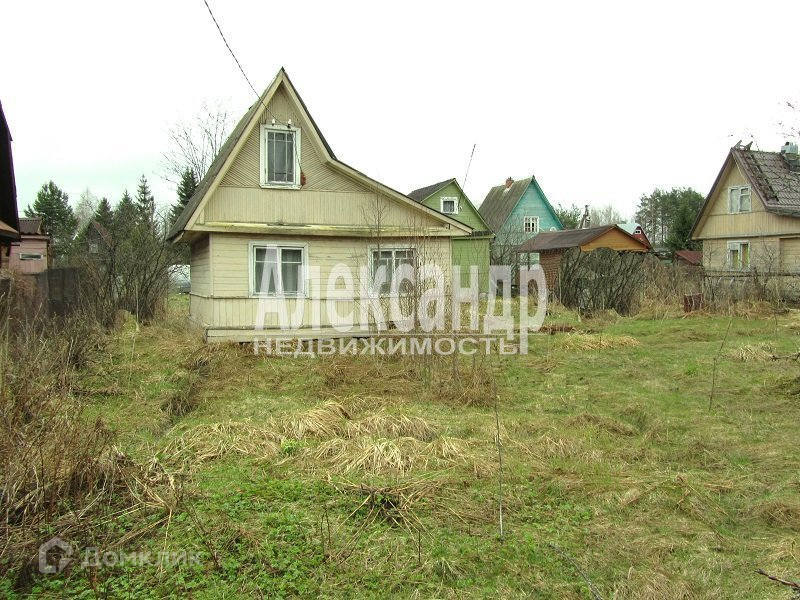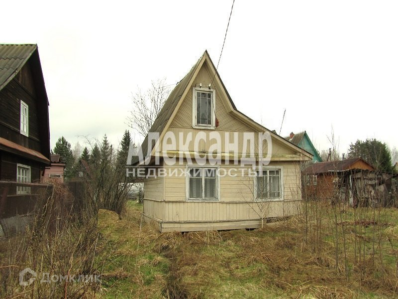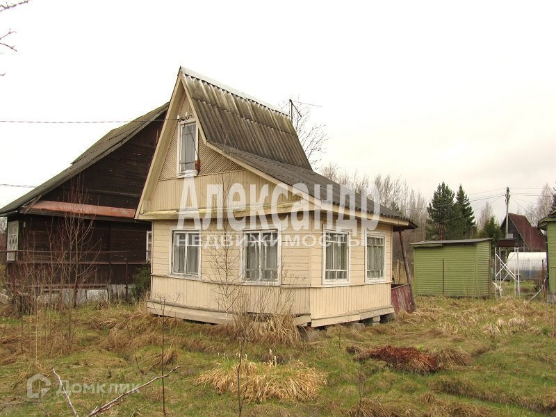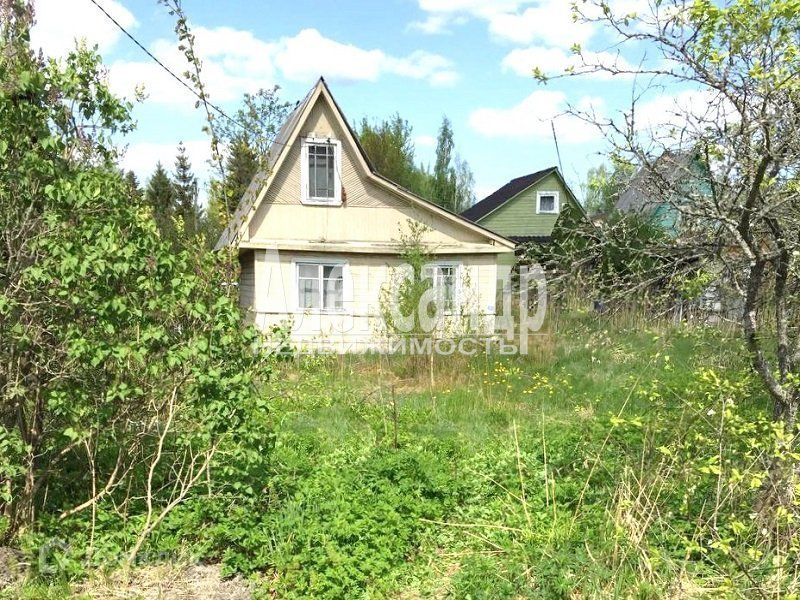 1698340  В 50 км от Санкт- Петербурга садовый дом  дом общ. пл. 34 кв.м. из бревна, снаружи обшит вагонкой, 2 комн., кухня, прихожая. Электричество в доме, скважина на 3 участка. Участок 6 соток , разработан,