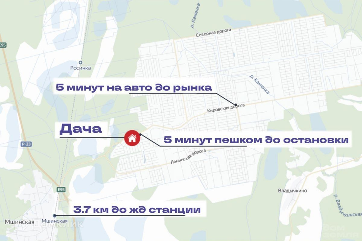 Транспортная доступность:На машине по Киевскому шоссе от СПб можно добраться за 1 час 20 мин по обновленному расширенному шоссе. На электричке от Балтийского вокзала /Ленинский проспект/ Броневая и доехать до ж/д станции "Мшинская" за 1 час 50 мин. Три раза в день на поезде Ласточка время в пути составит 1 час 11 мин. До участка пешком можно дойти за 40 минут. В сезон (с апреля по октябрь) курсирует автобус от ж/д станции по массиву. От остановки автобуса пешком идти около 5 минут.