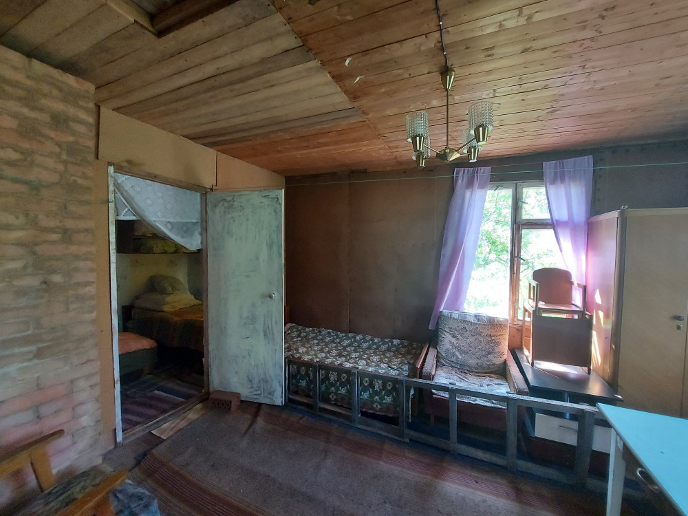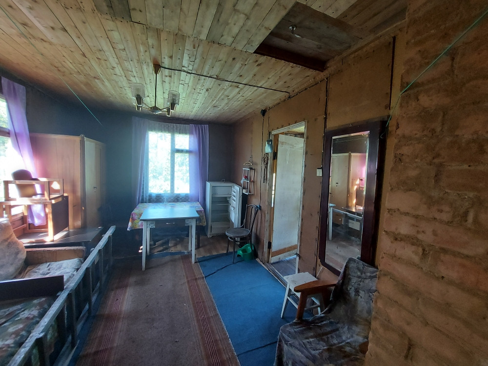 Дом каркасно-щитовой 2-х этажный,  утепленный, снаружи обшит вагонкой, фундамент – ленточный, крыша – шифер, на окнах установлены двойные деревянные рамы. Дом заводского изготовления и сборки,  домокомплект 1990 года постройки.  В  доме на первом этаже: закрытое крыльцо; кухня/веранда с большими окнами – 12 кв.м.; спальня кирпичной с печью-плитой и щитом отопления – 8 кв.м.; гостиная два окна – 18 кв.м.; спальня – 8 кв.м.;  На втором этаже: место под размещение двух комнат. Отделка стен в доме – ДВП/обои, полы новые – деревянные/линолеум, потолки – деревянные. Есть небольшой погреб.
