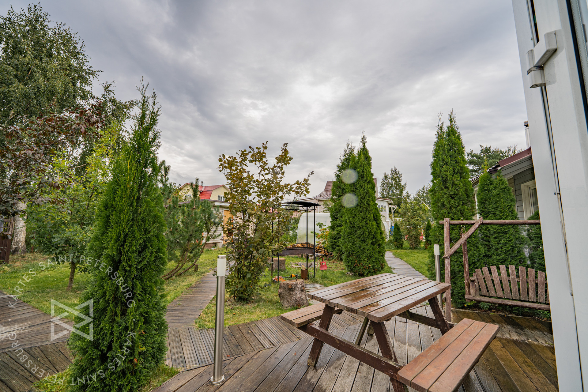 ✅Есть беседка с обустроенной зоной барбекю, места для хранения садового инвентаря и парник
