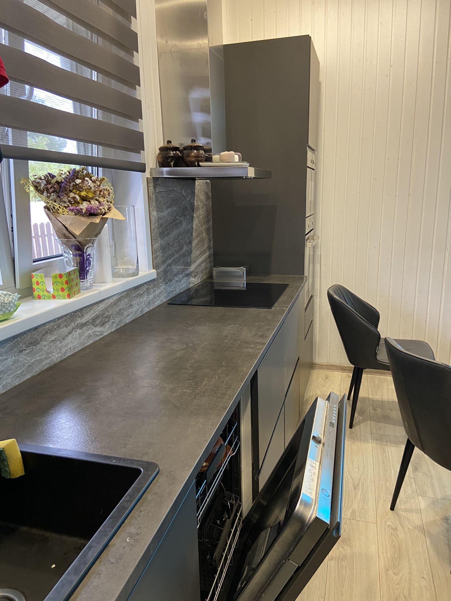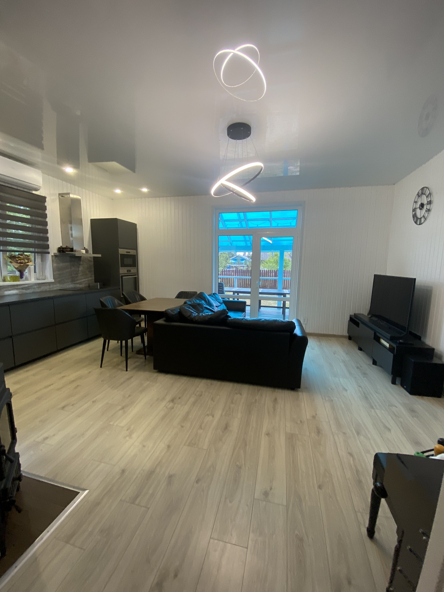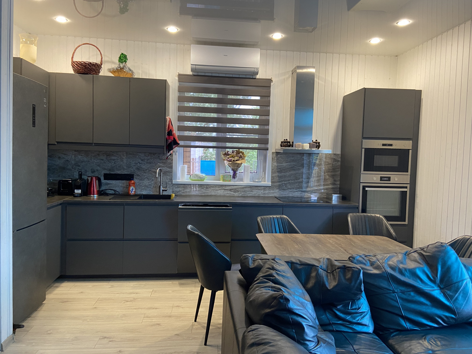 Дом оборудован дорогим кухонным гарнитуром с встроенной техникой, спальни укомплектованы эргономичными кроватями.