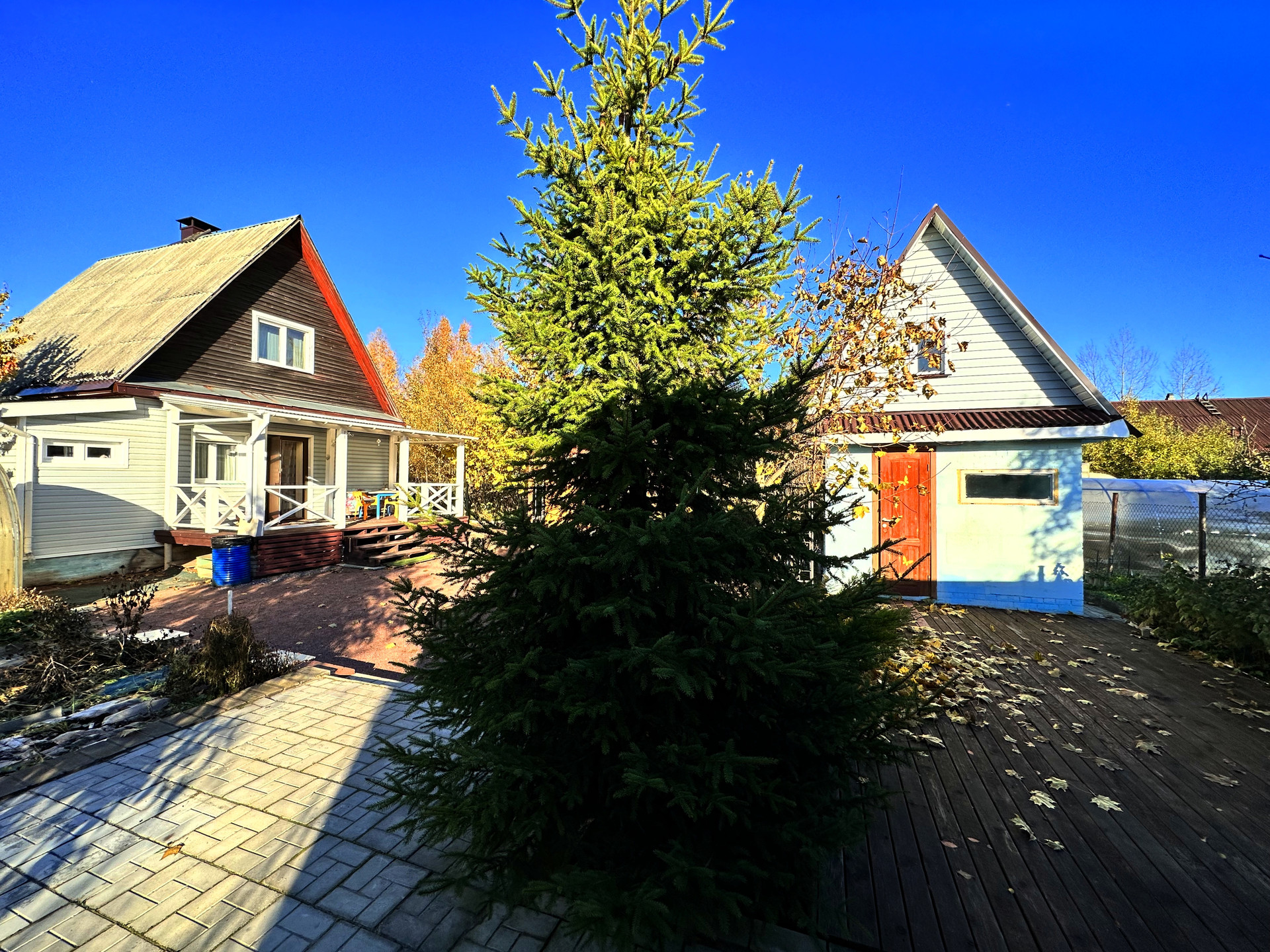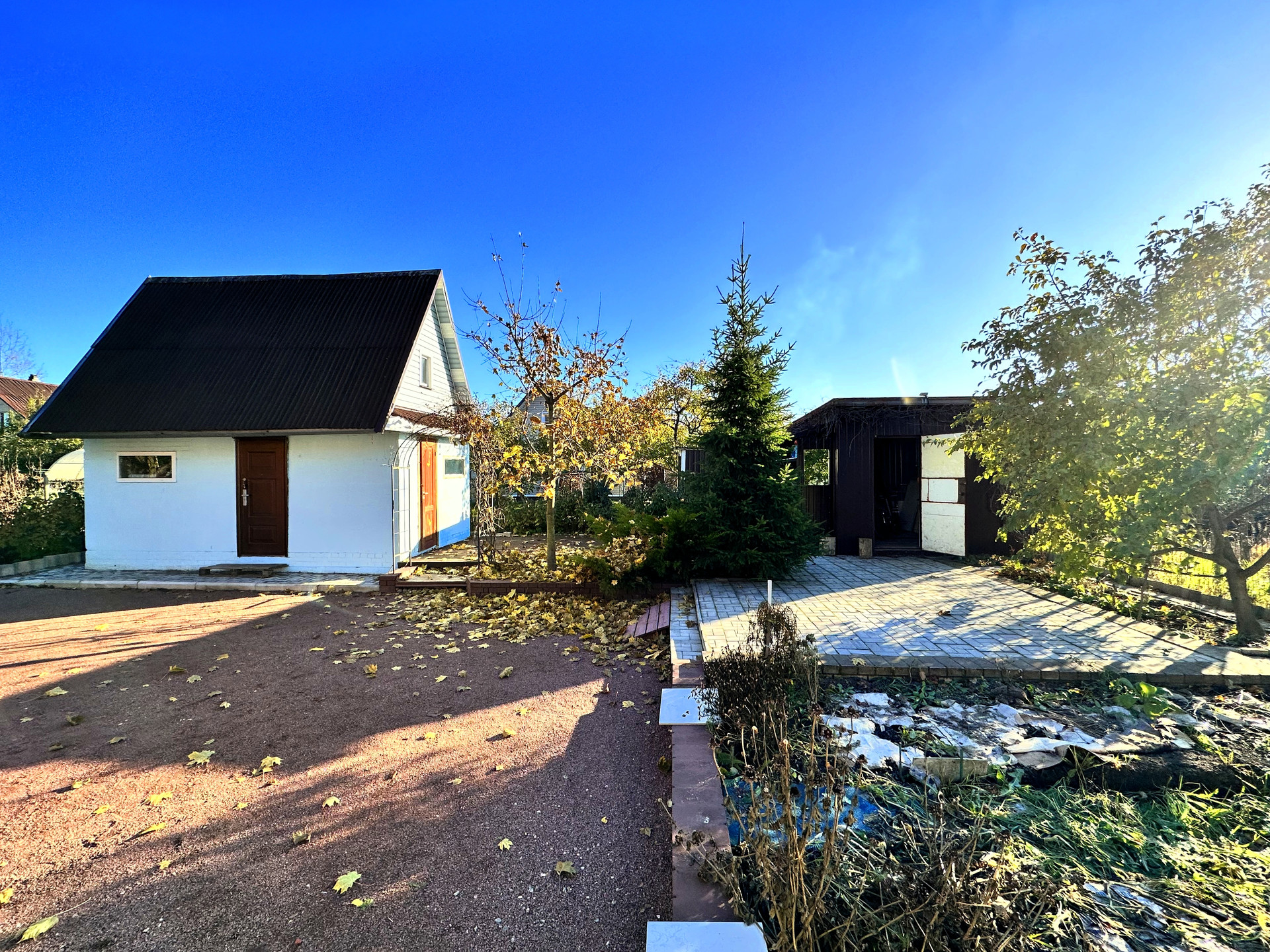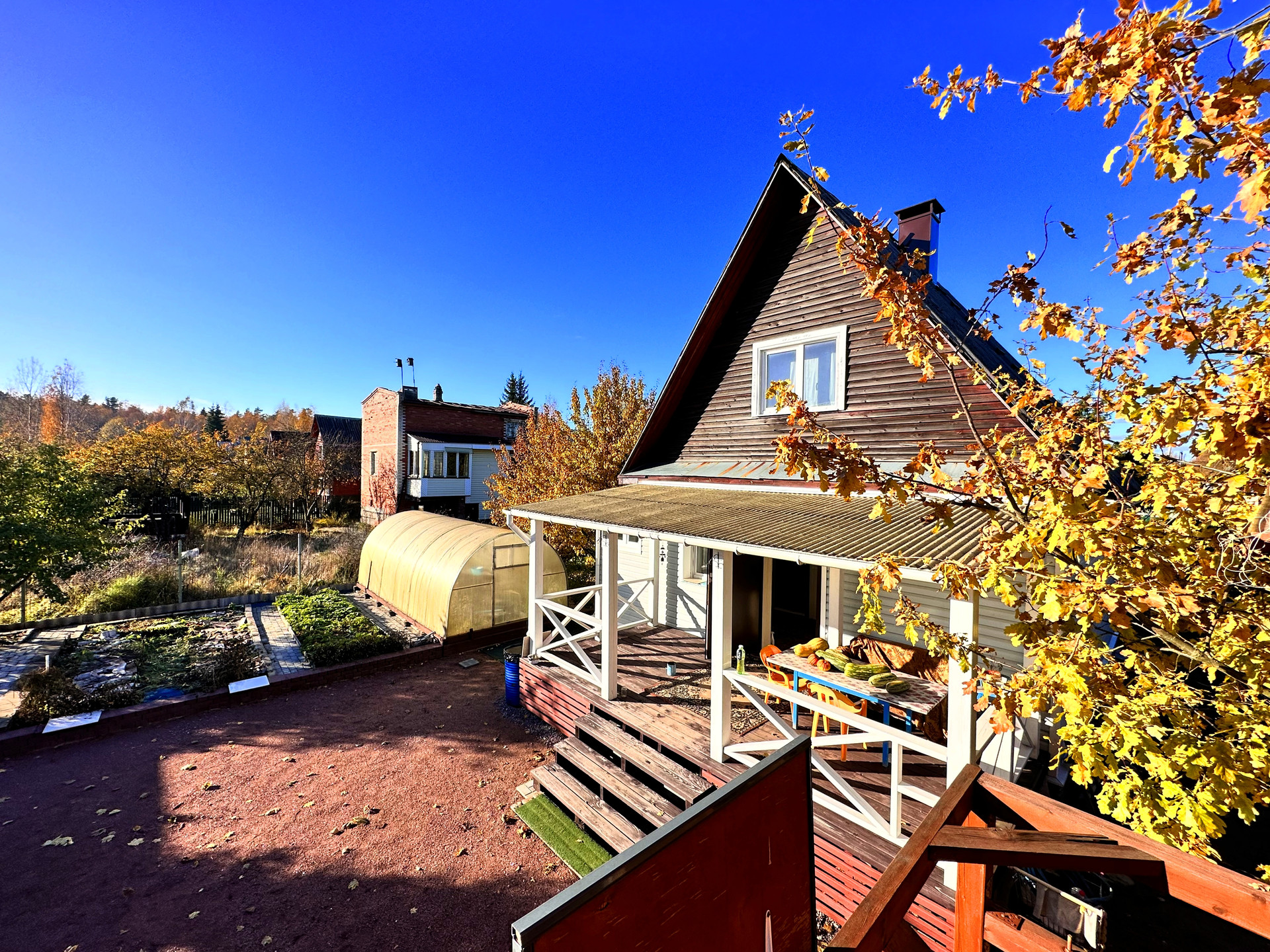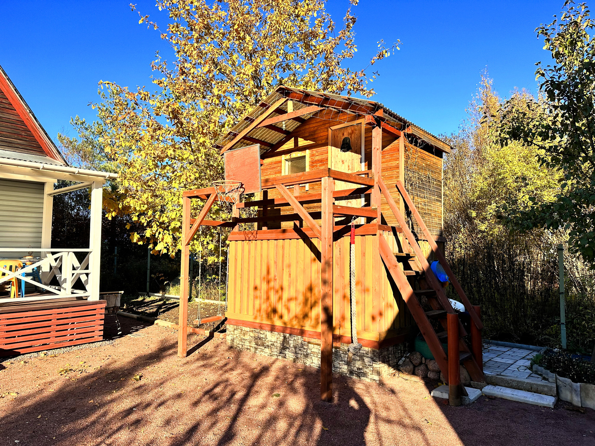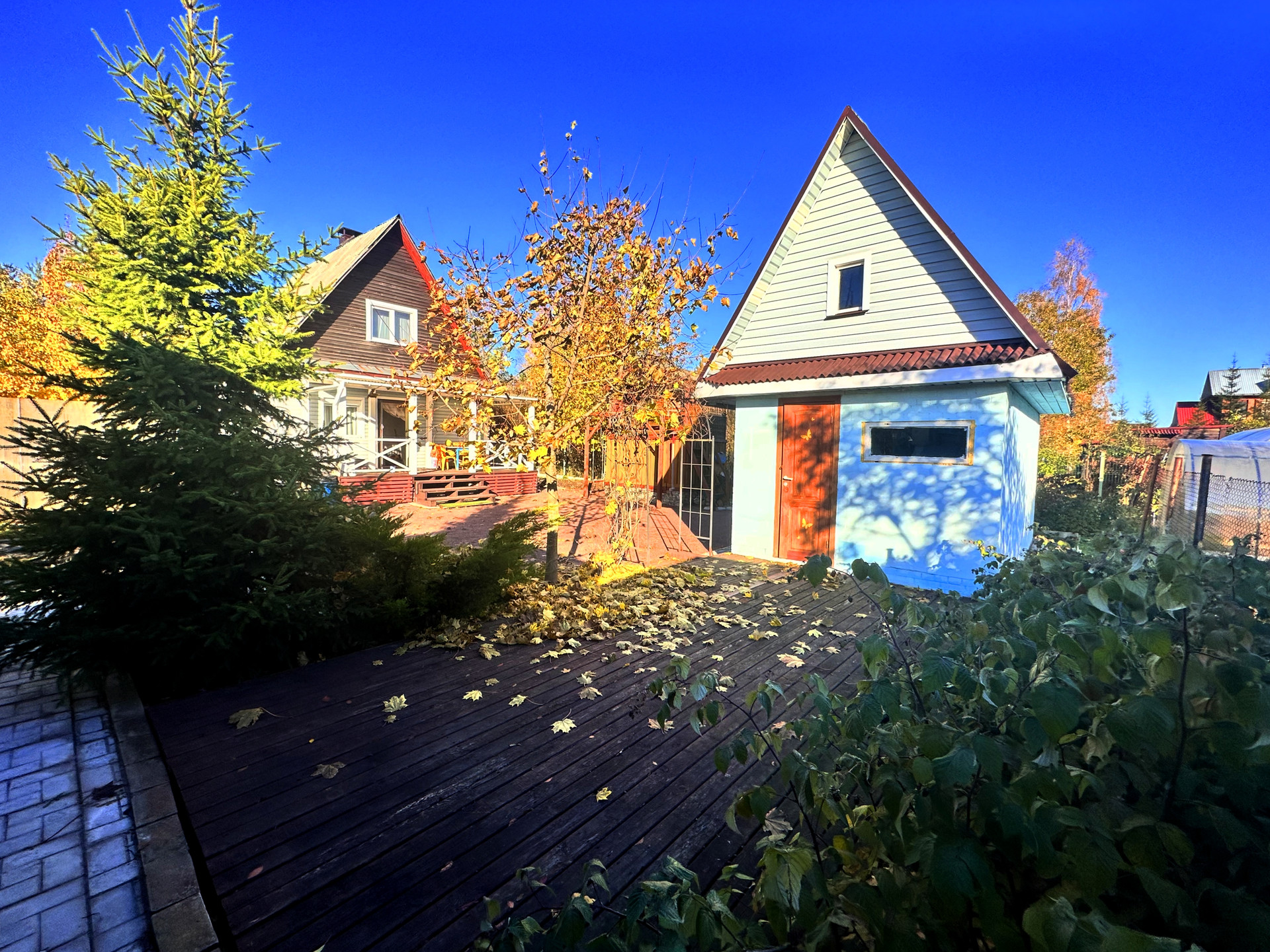 - постройки – кирпичный дом, постройка из газобетона (можно использовать как баню или гостевой дом), сарай из металлического профиля, дровяник, теплица, детский уголок (сам домик, качели, канат, баскетбольное кольцо), зона с террасной доской (подойдет для лежаков или для бассейна), зона барбекю, выложена плиткой