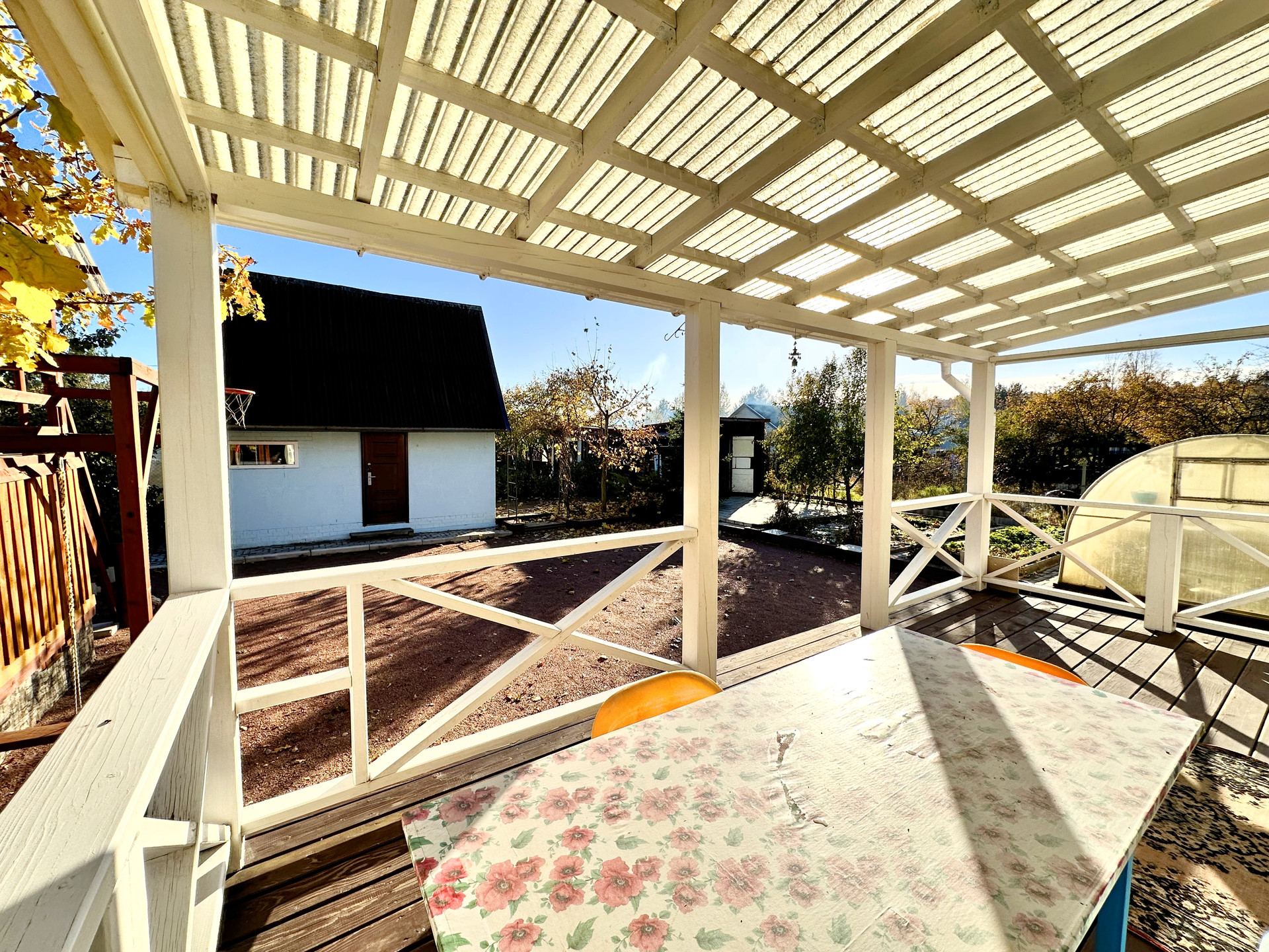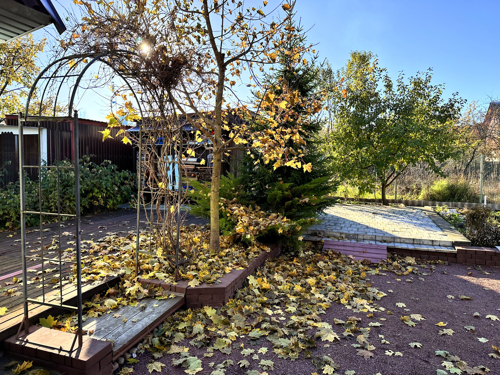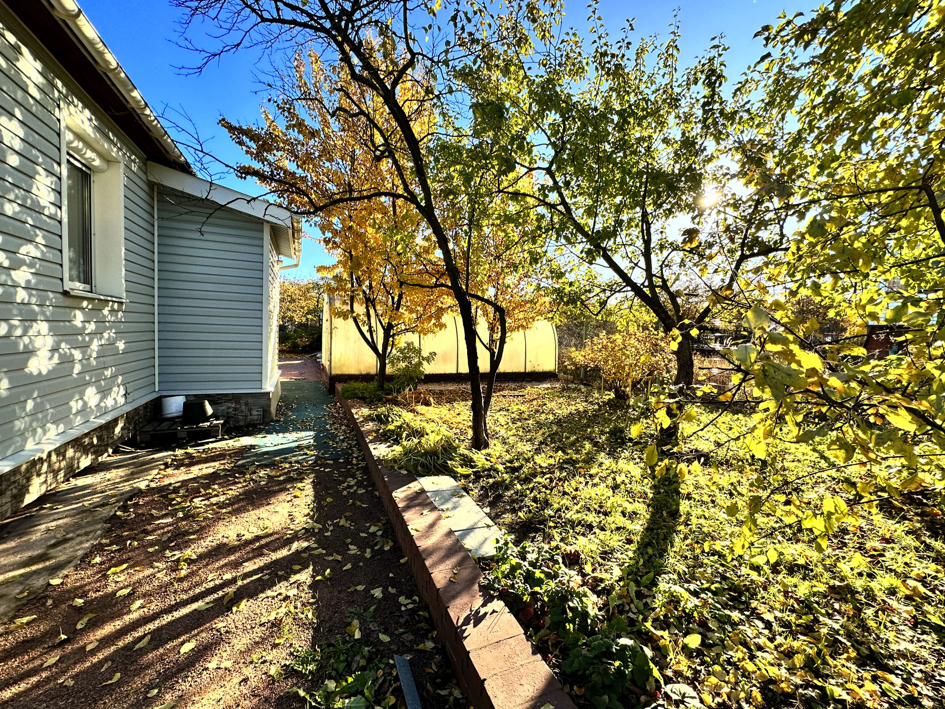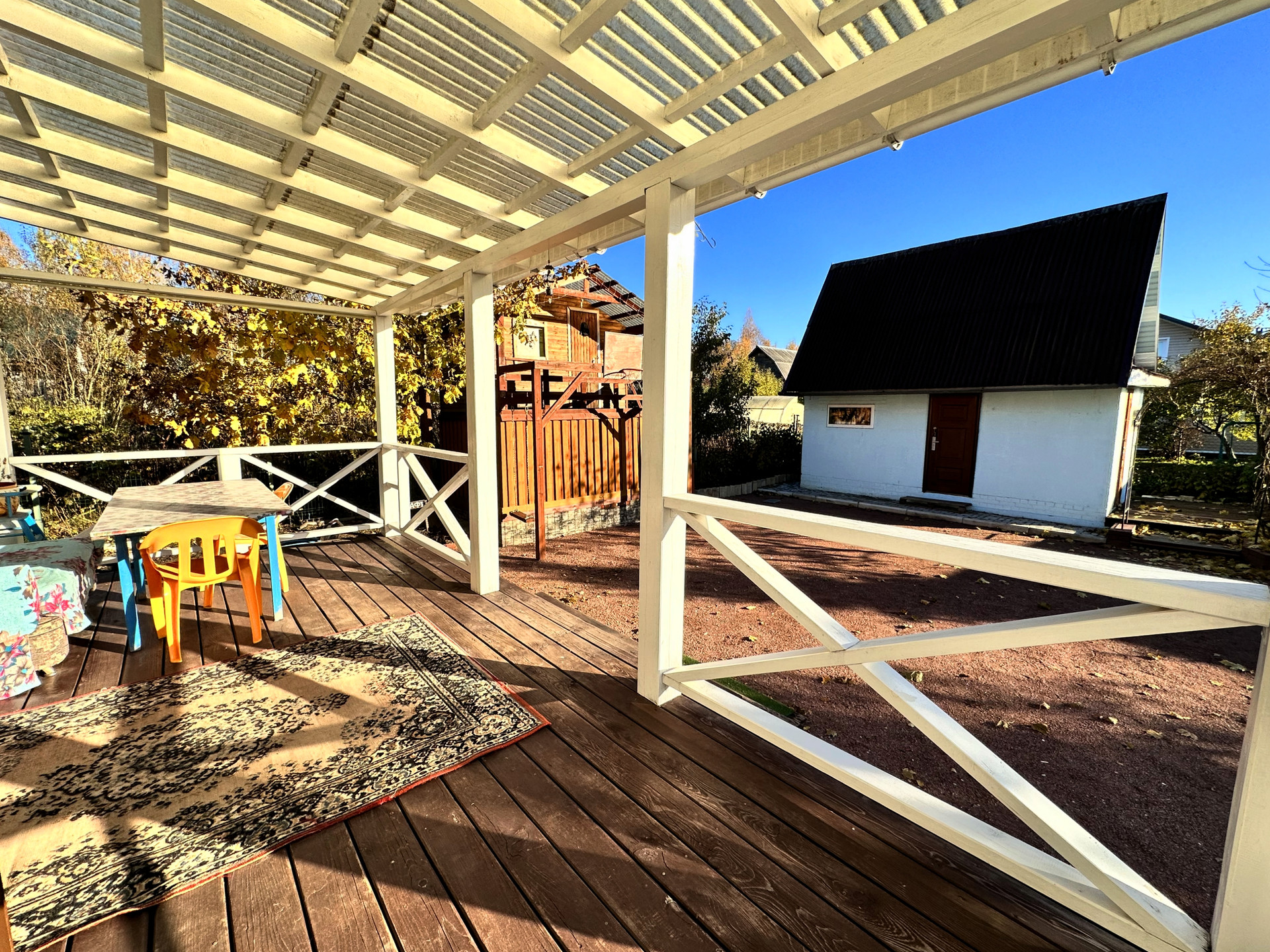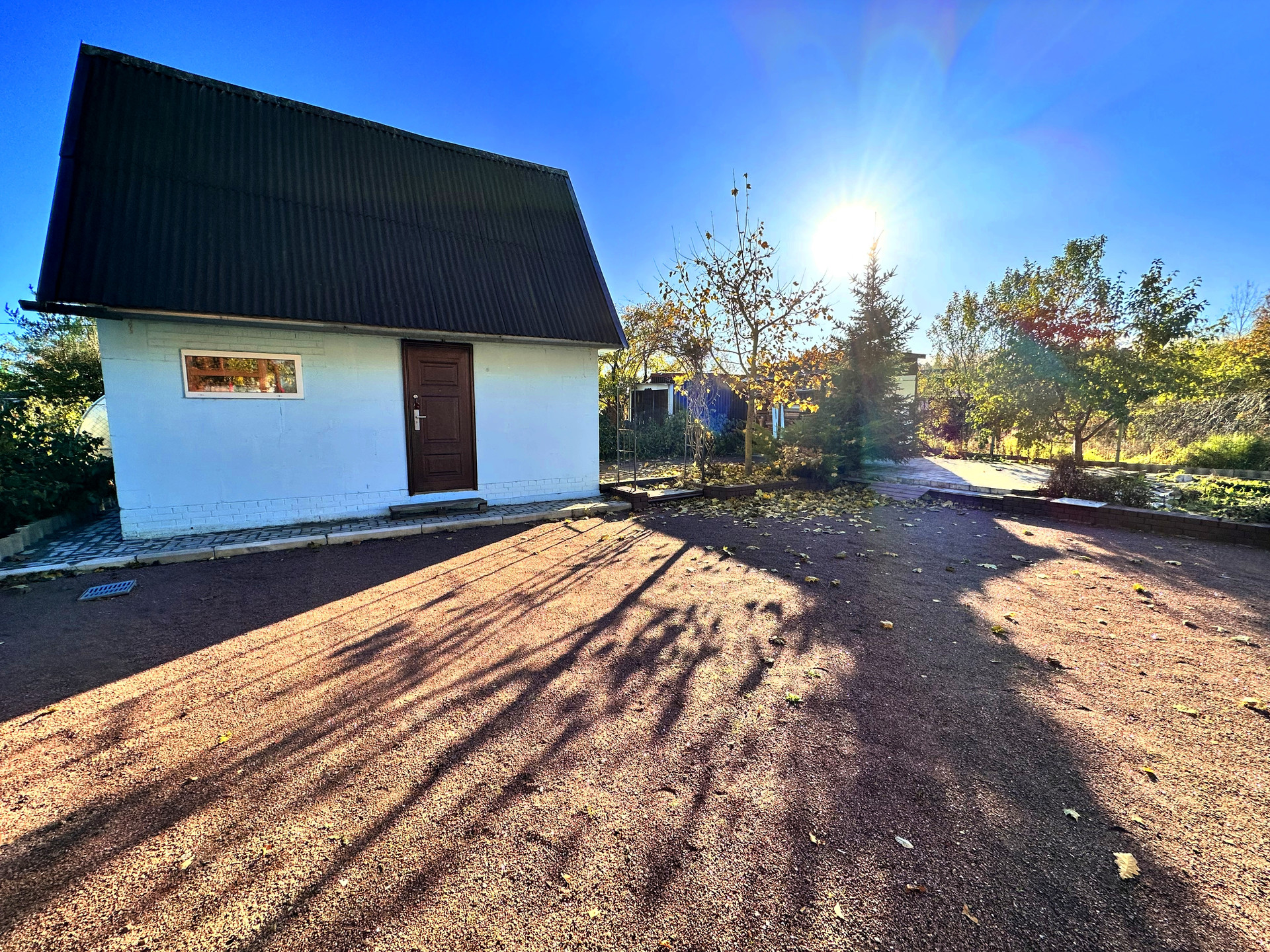 - постройки – кирпичный дом, постройка из газобетона (можно использовать как баню или гостевой дом), сарай из металлического профиля, дровяник, теплица, детский уголок (сам домик, качели, канат, баскетбольное кольцо), зона с террасной доской (подойдет для лежаков или для бассейна), зона барбекю, выложена плиткой