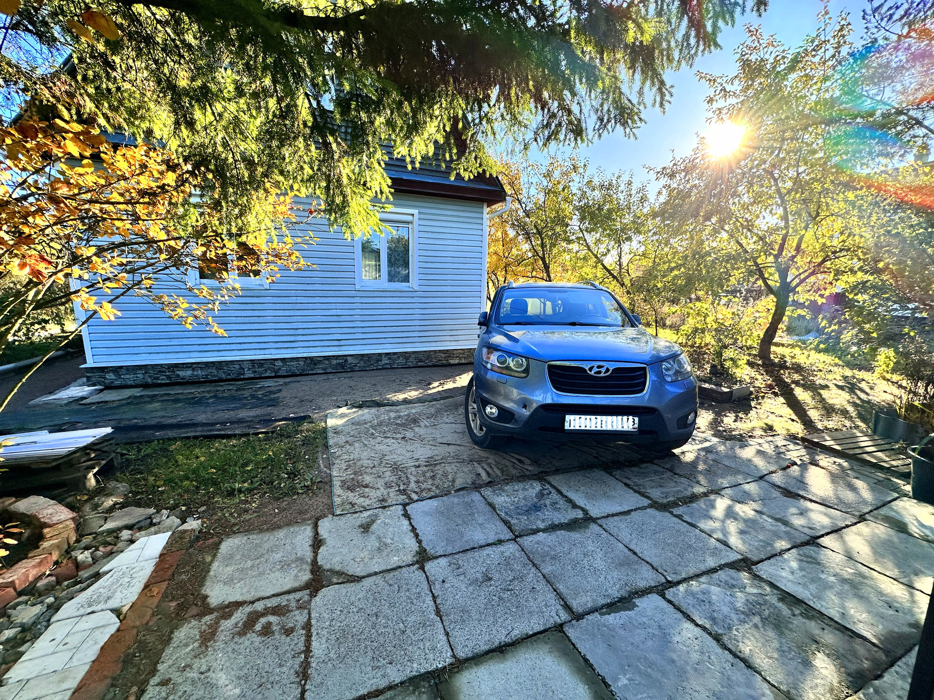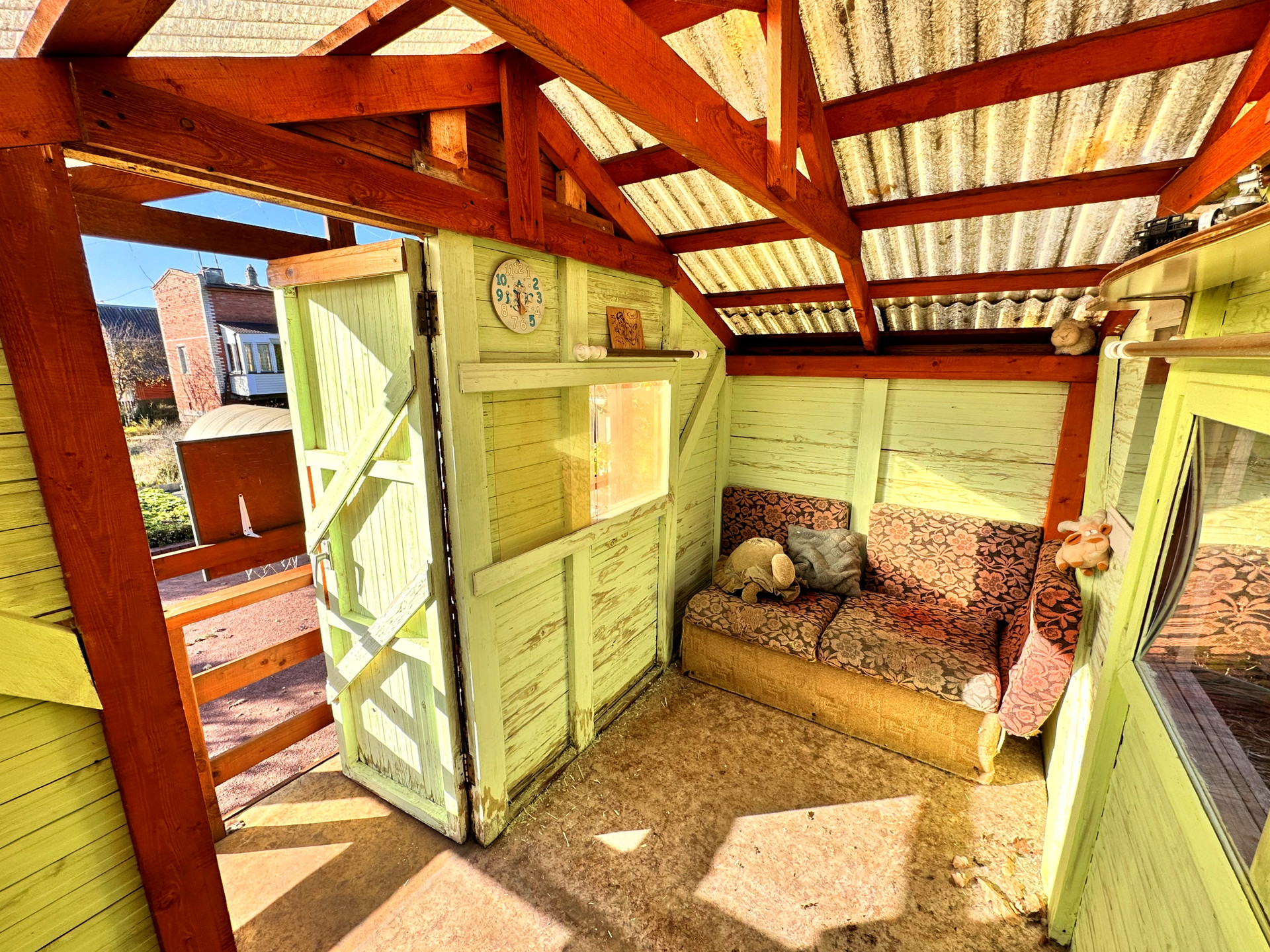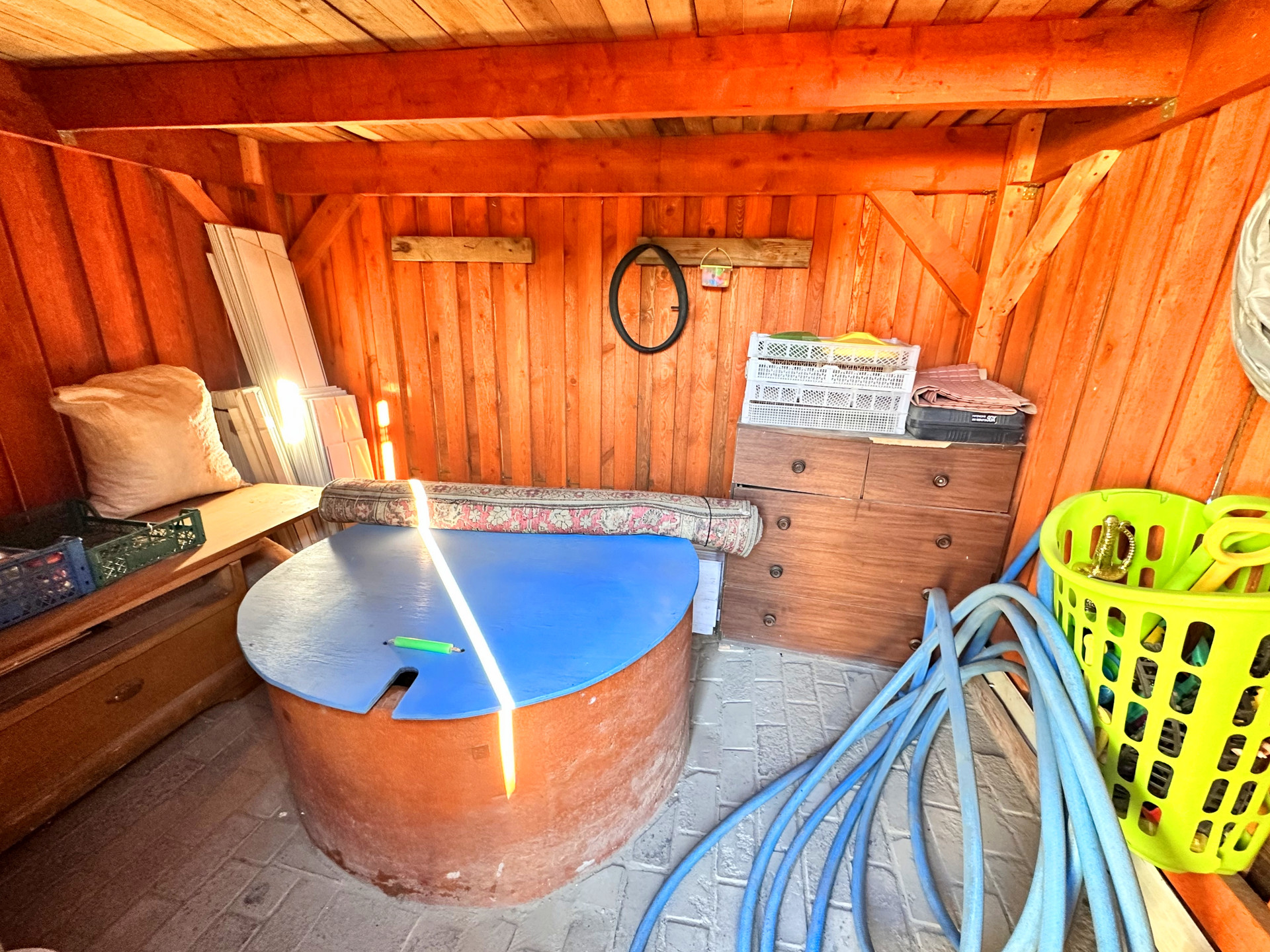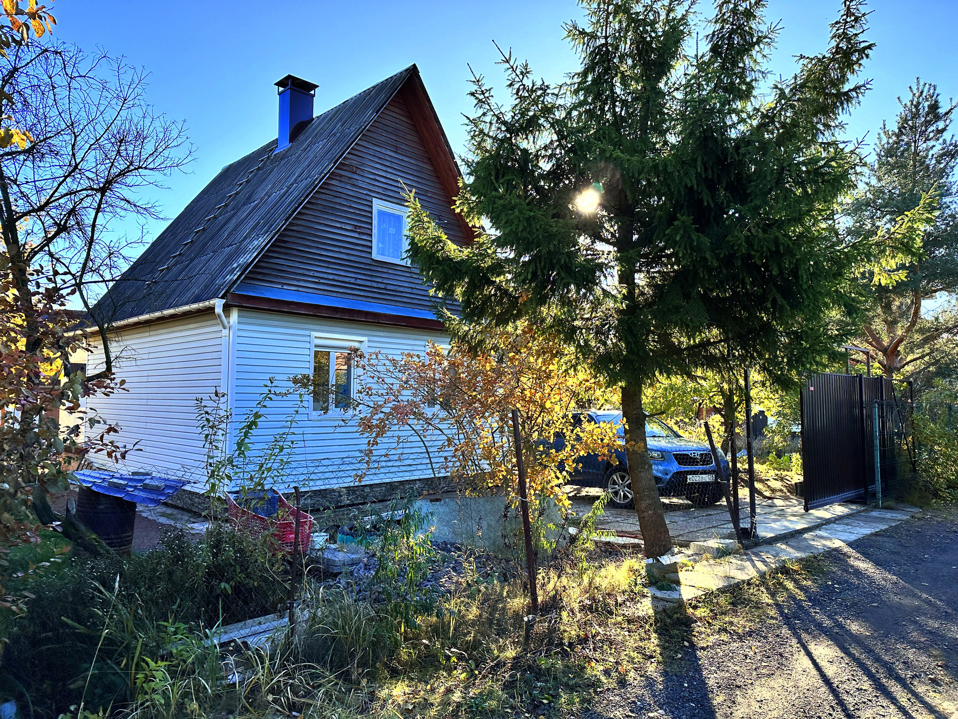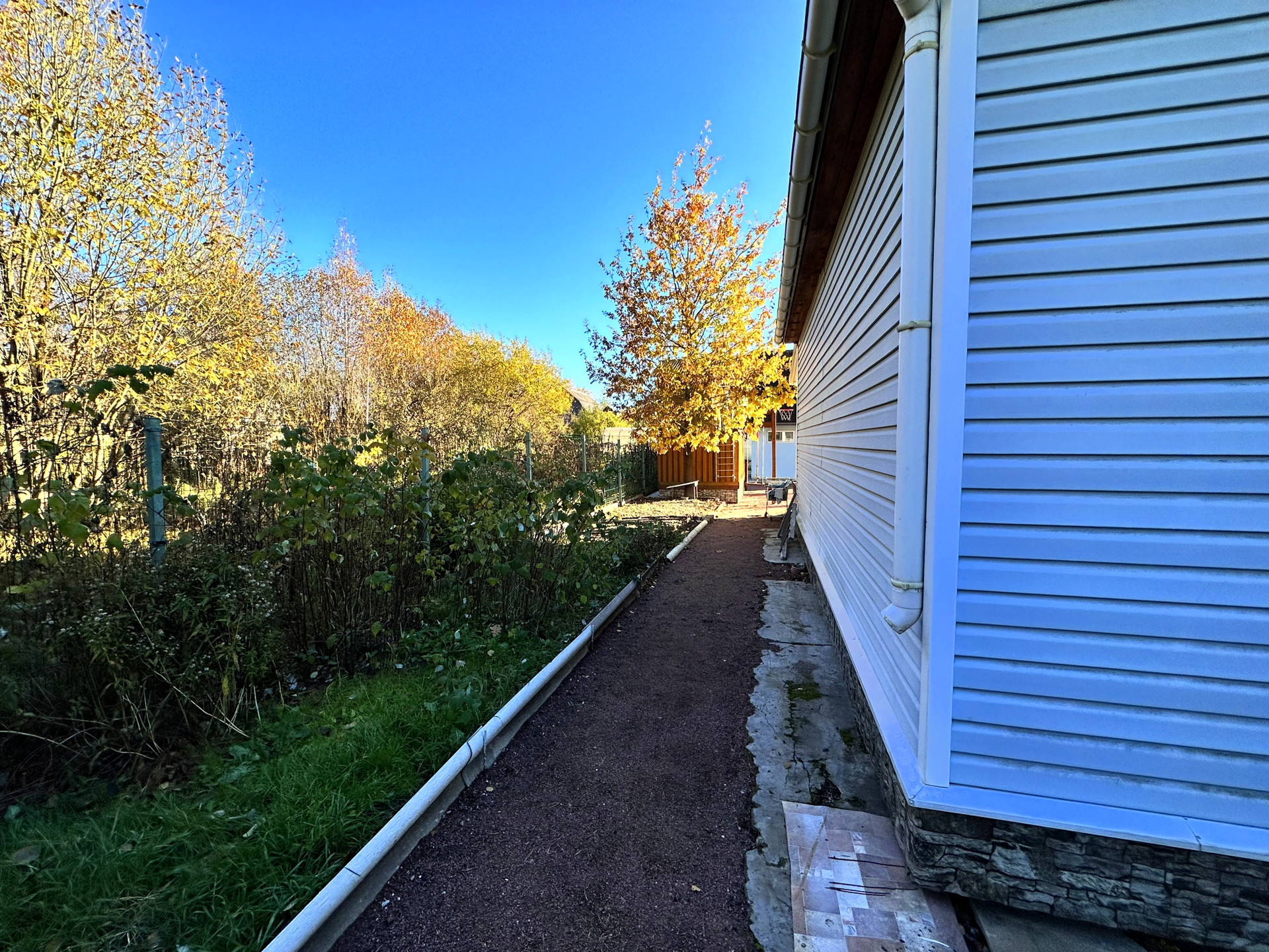- постройки – кирпичный дом, постройка из газобетона (можно использовать как баню или гостевой дом), сарай из металлического профиля, дровяник, теплица, детский уголок (сам домик, качели, канат, баскетбольное кольцо), зона с террасной доской (подойдет для лежаков или для бассейна), зона барбекю, выложена плиткой