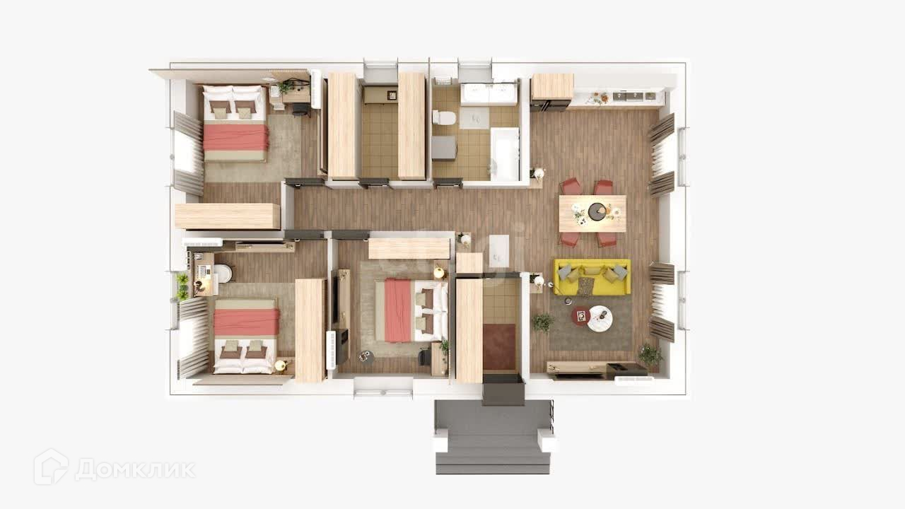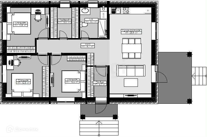 - Планировка дома включает кухню-гостинную, 3 спальни, СУС (санузел совмещенный), котельную и холл.