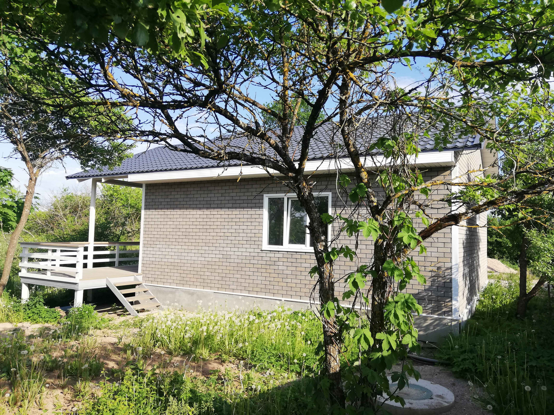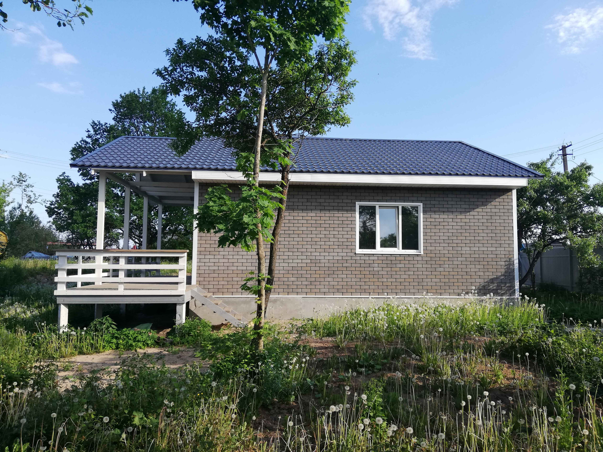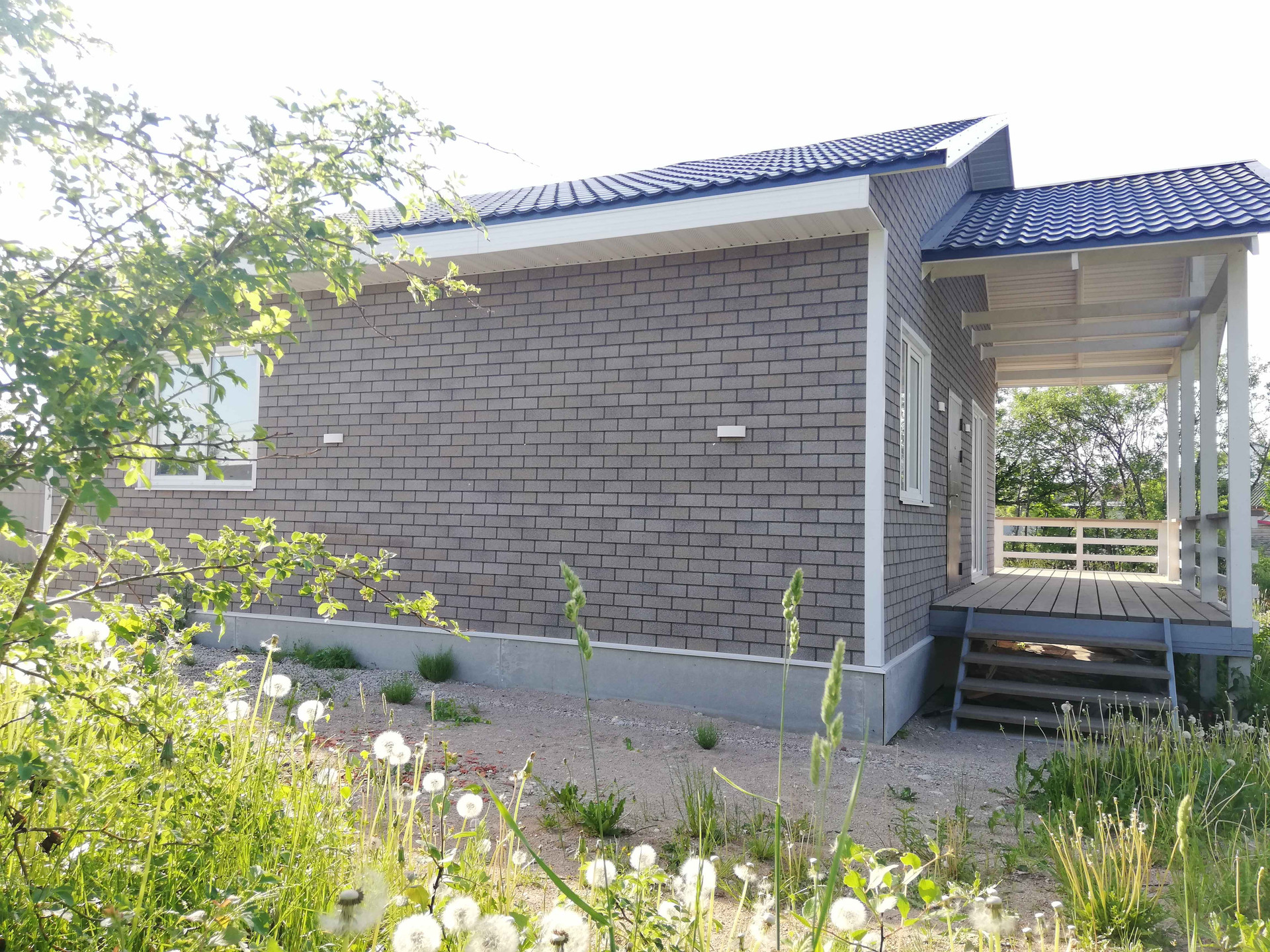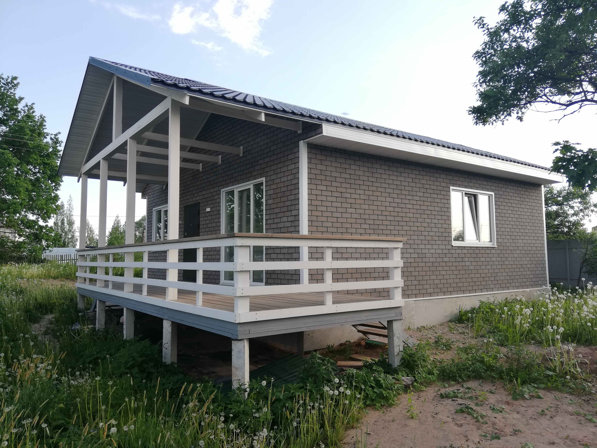 Дом построен по каркасной технологии с утеплением 150 мм и установлен на ж/б сваях, обшит фасадной черепицей. Цоколь утеплен и зашит. Крыша - металлочерепица.