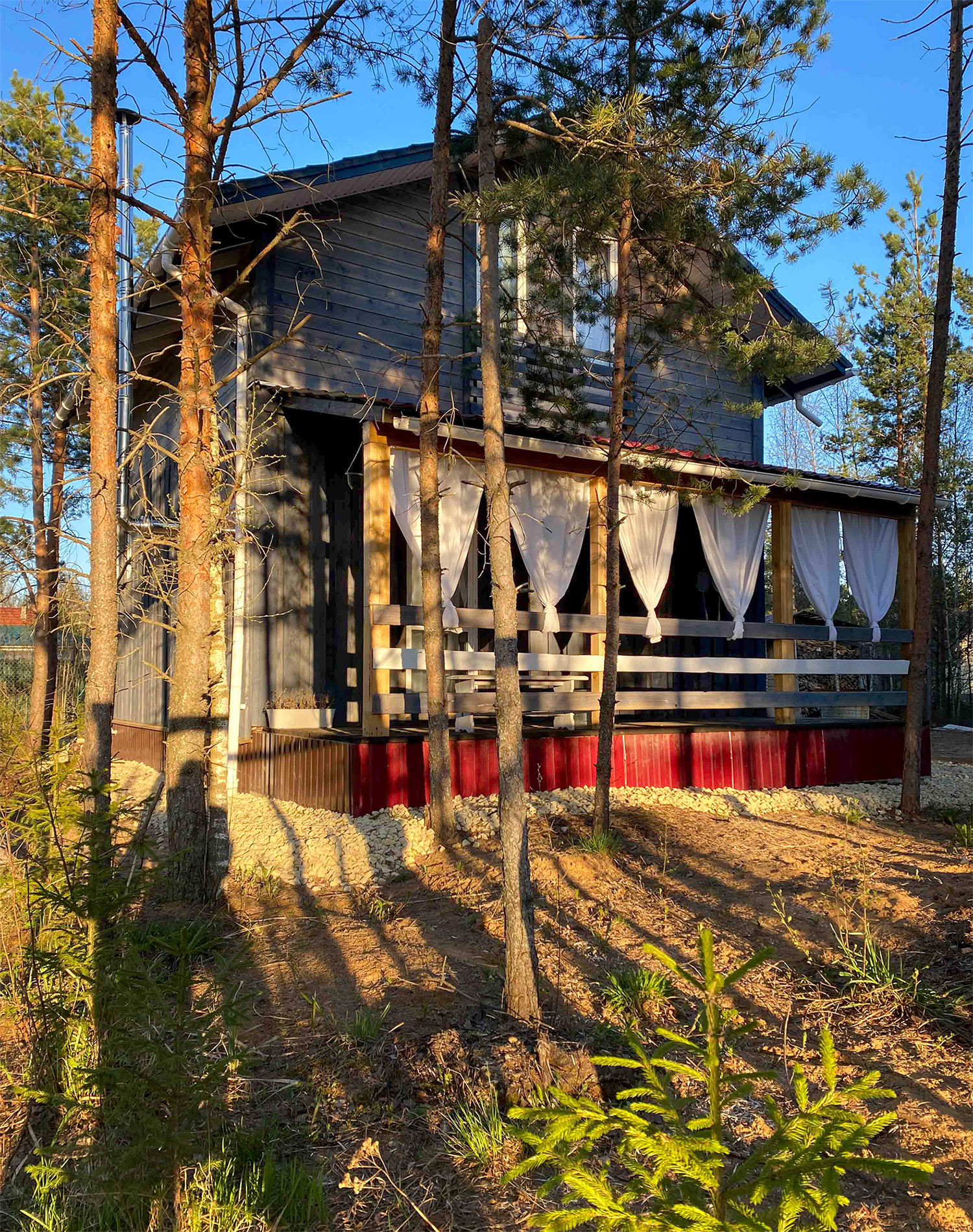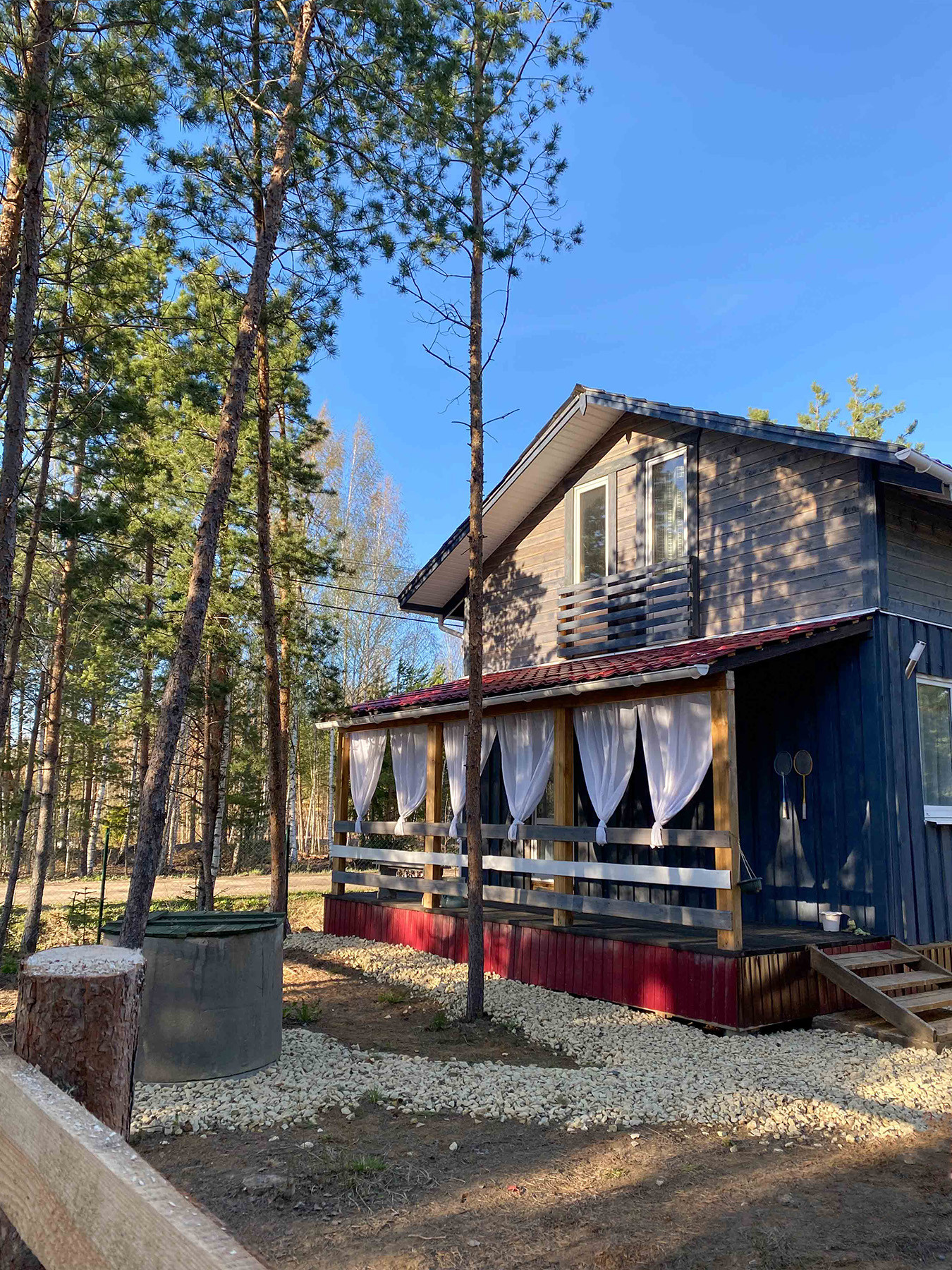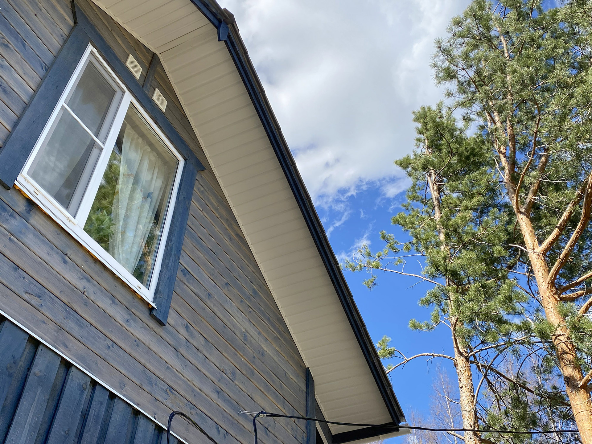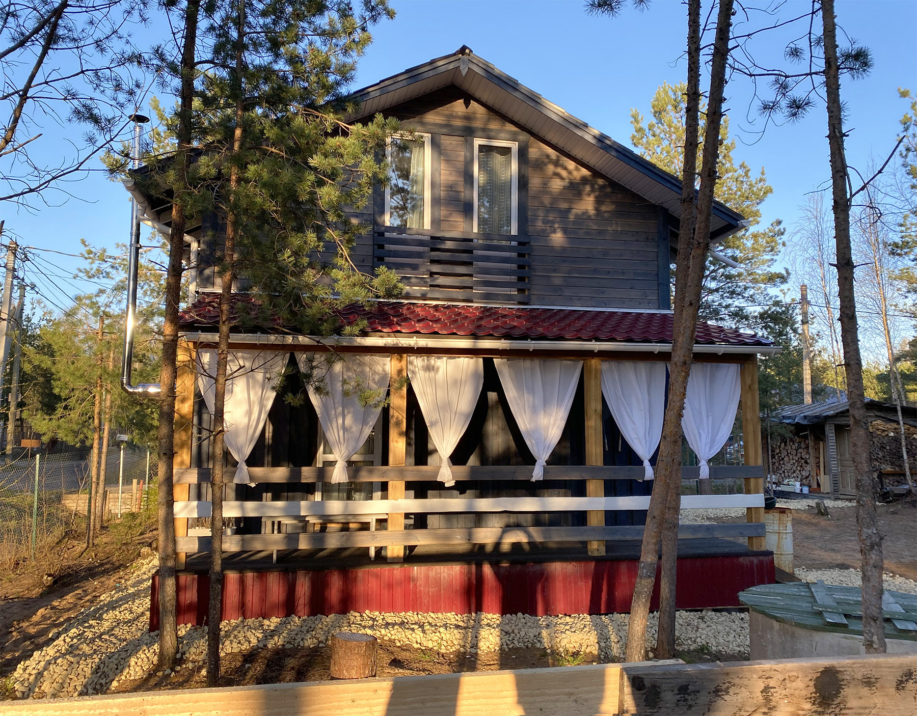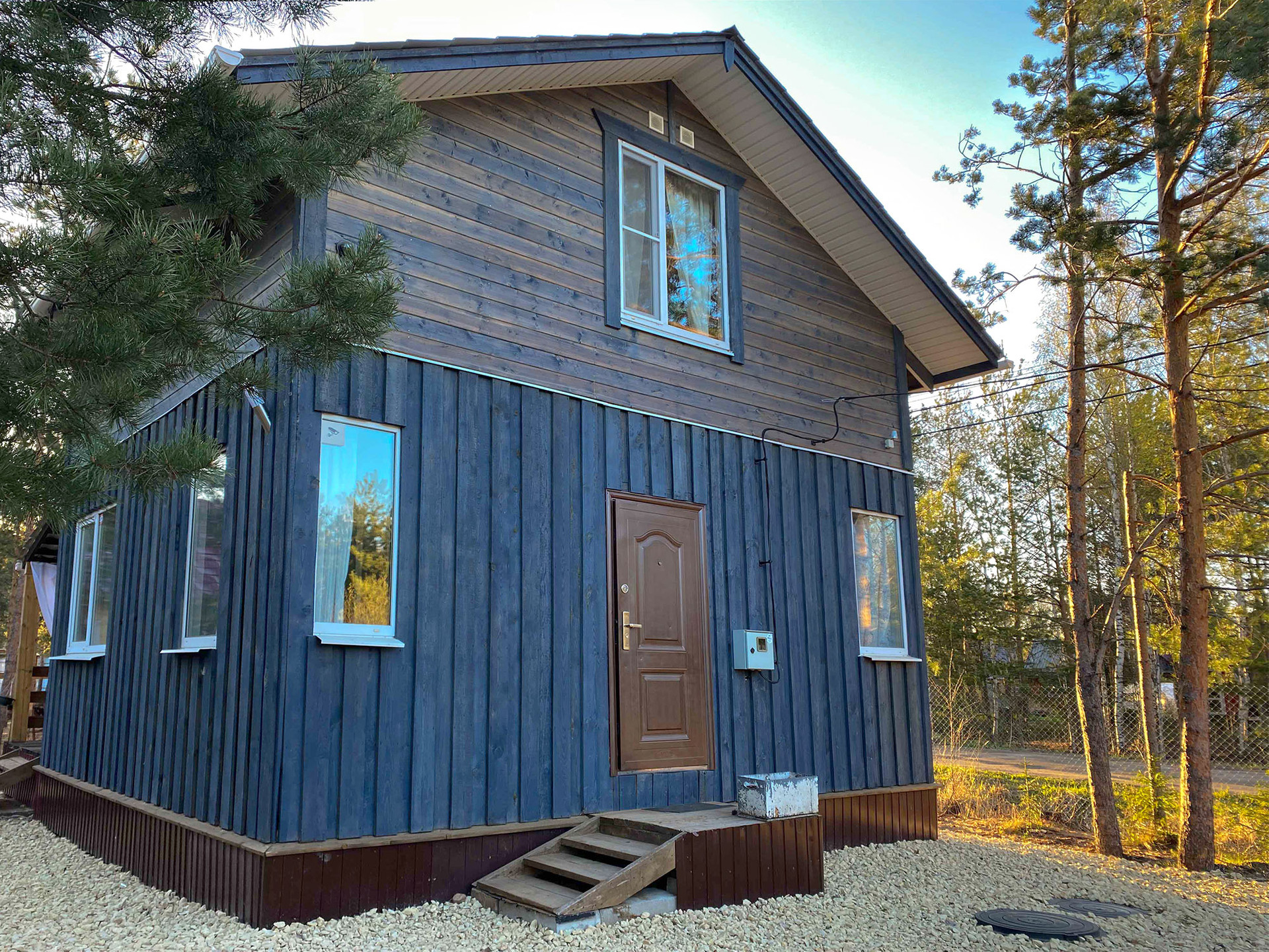 Фундамент — ж/б заливные столбы. Покрашен дом Тикуриллой (на 5 лет хватит) Уличное освещение по периметру дома. Сделаны водоотливы (защищают фасад от сырости) Зашит цоколь Открытая солнечная терраса