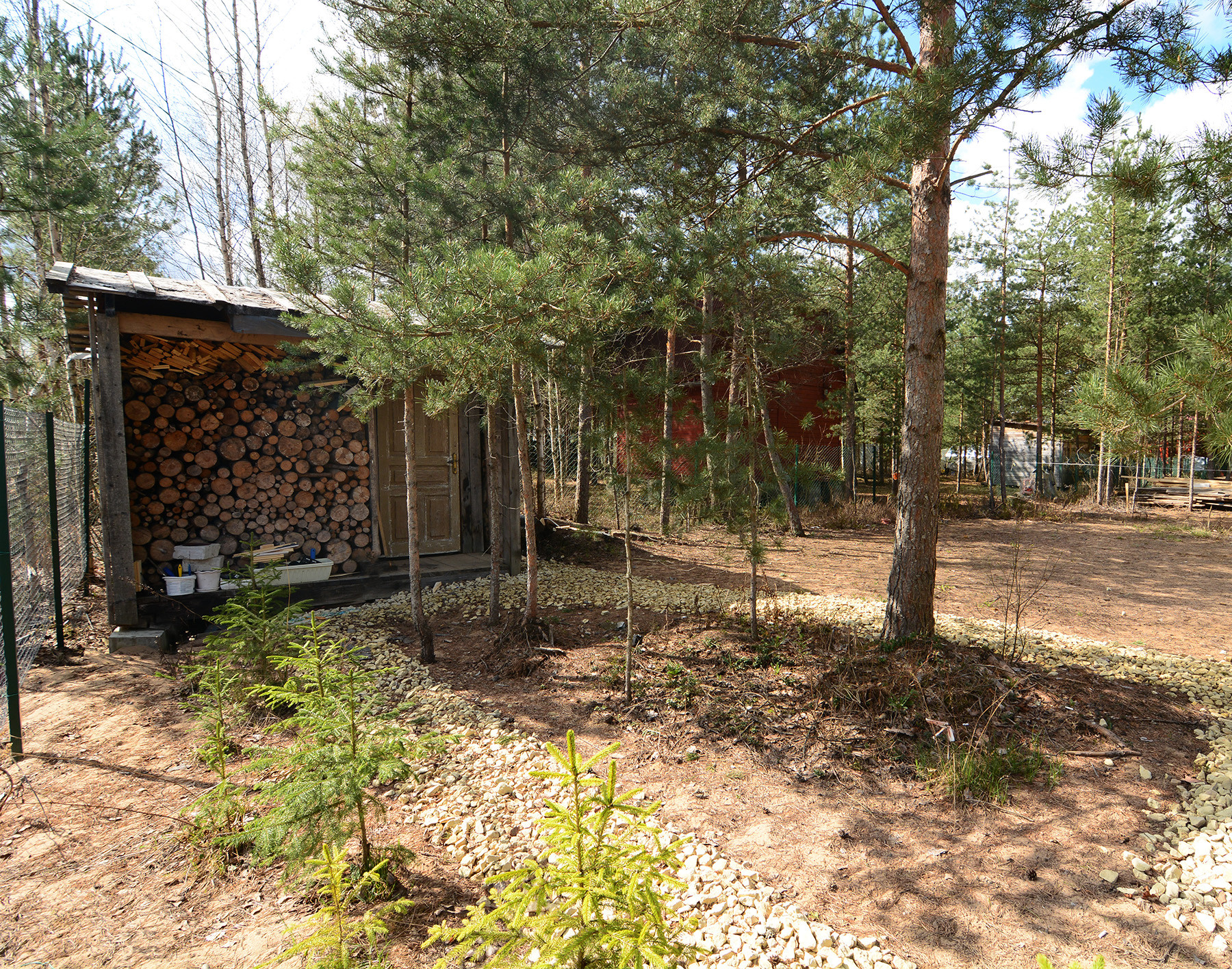 Парковка 2 места. Заезд, забор, ворота, дренаж (всюду где необходимо). Бытовка (сарай для инструмента, дров) Тропинки отсыпаны песком и щебнем. Елки по периметру посажены 2 года назад (зеленый забор)