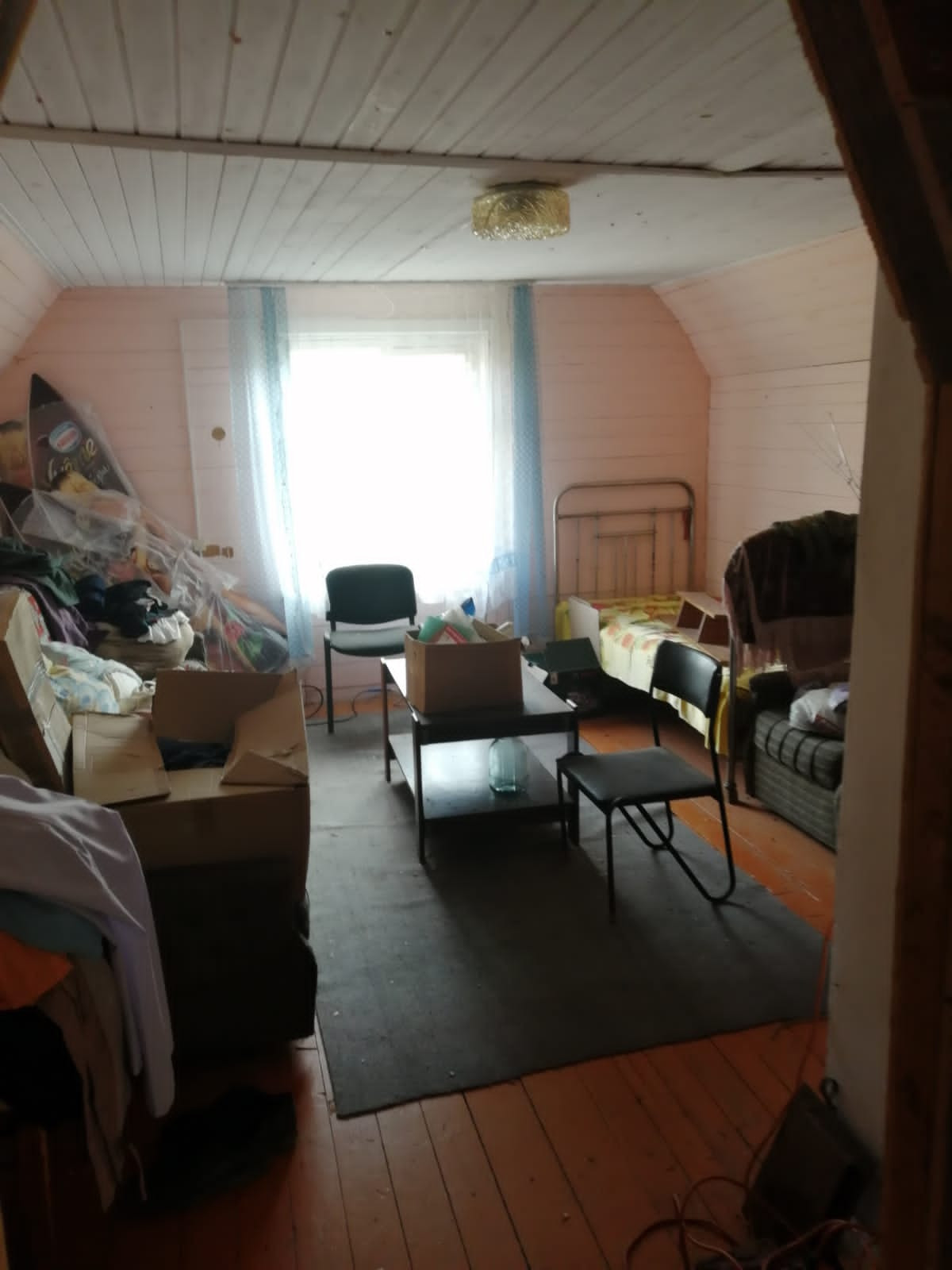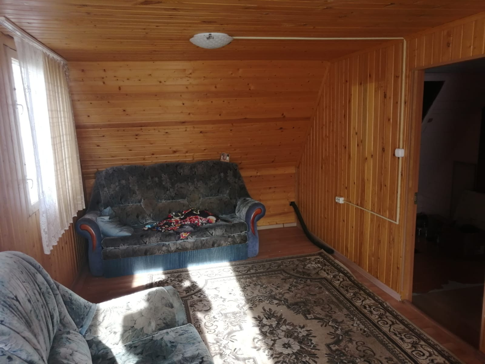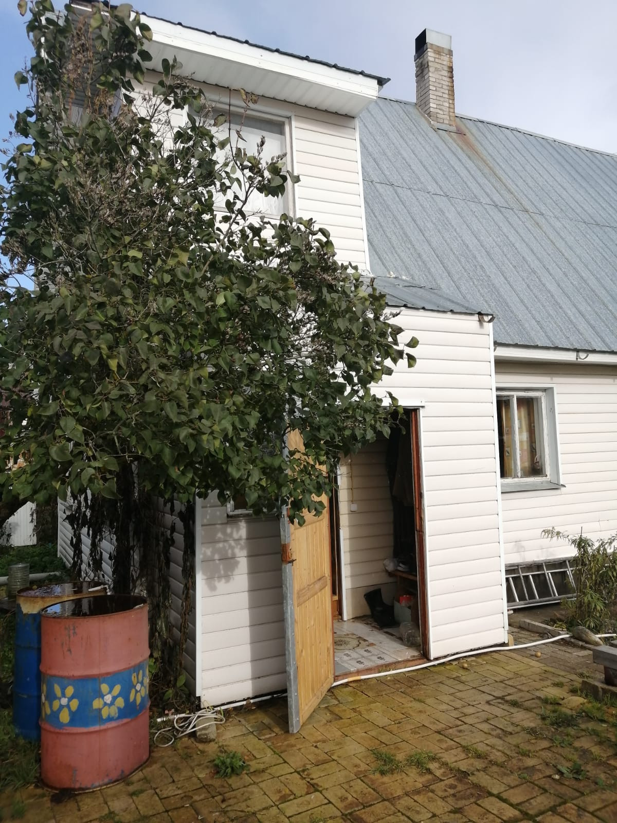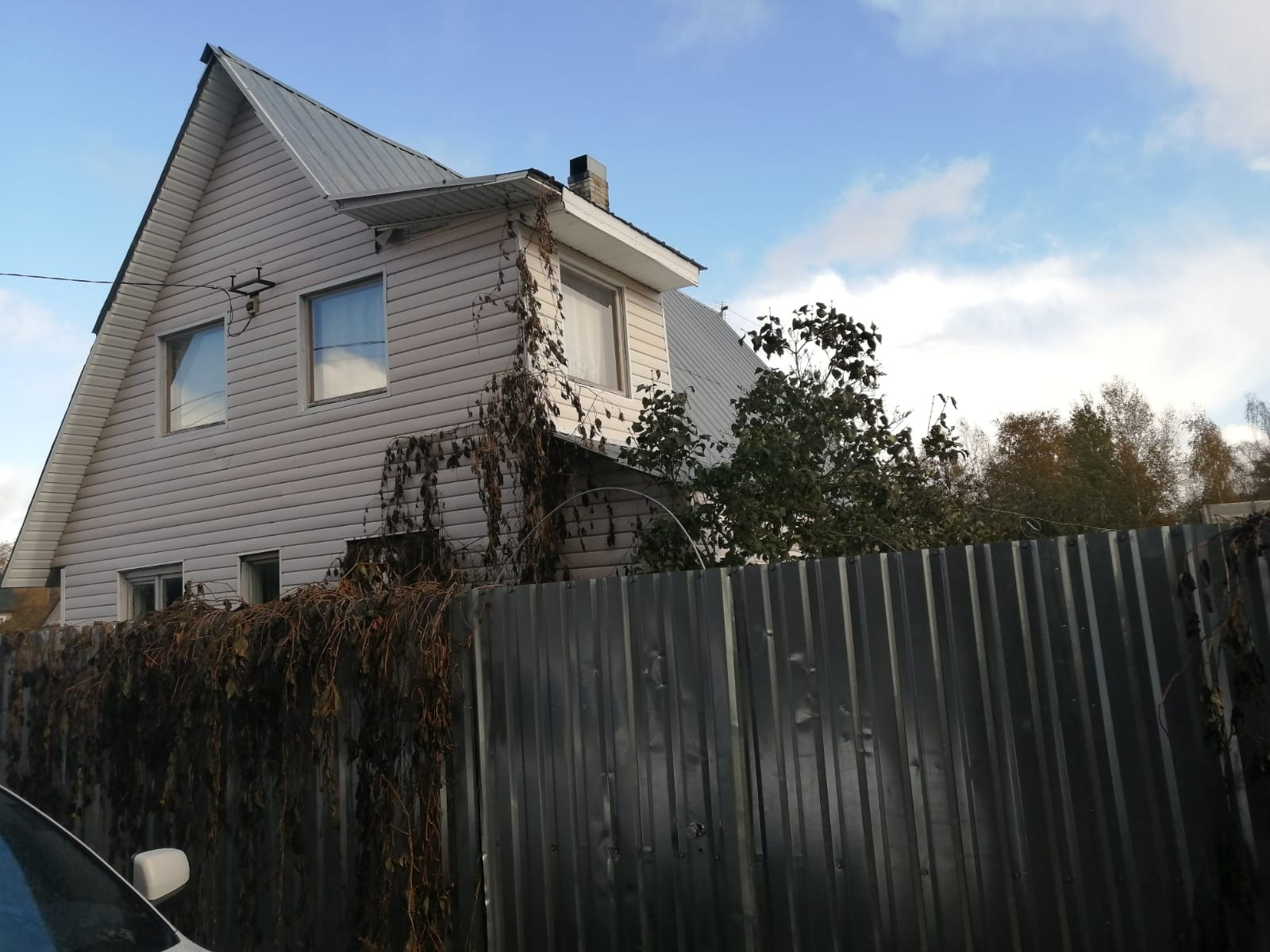 На участке расположен дом, из бруса, площадью  примерно 60 кв..м,, обшит сайдингом, 2 этажа, три комнаты и кухня,  оба жилые, обшит вагонкой. Отопление дома - печное. Дом не оформлен