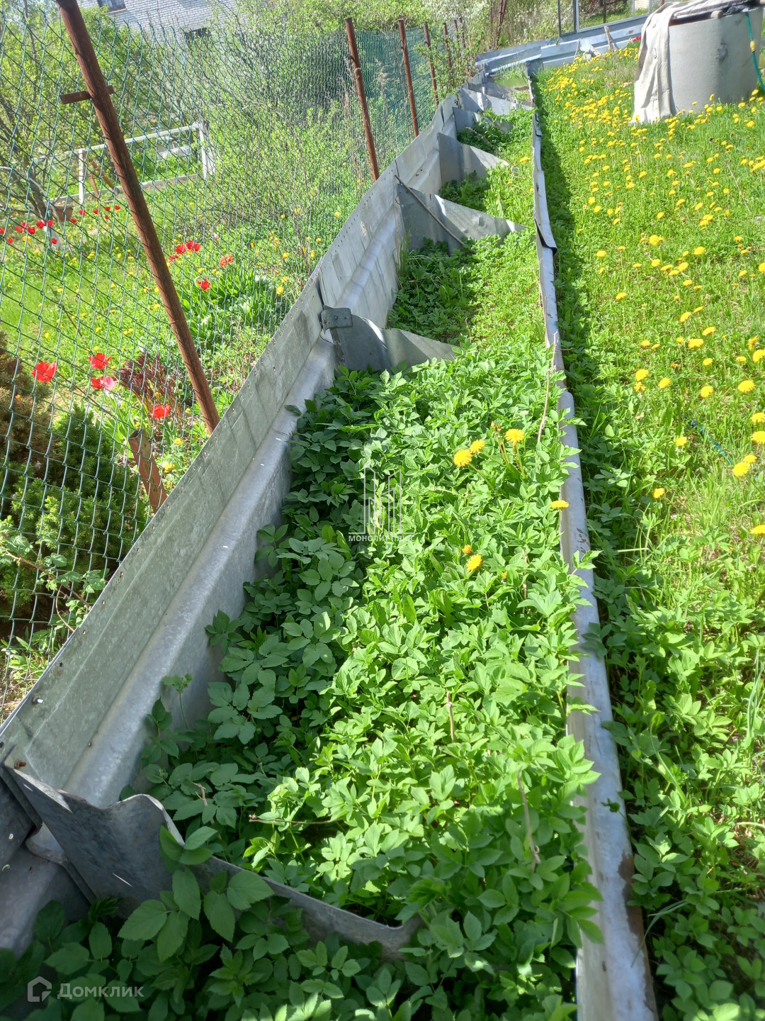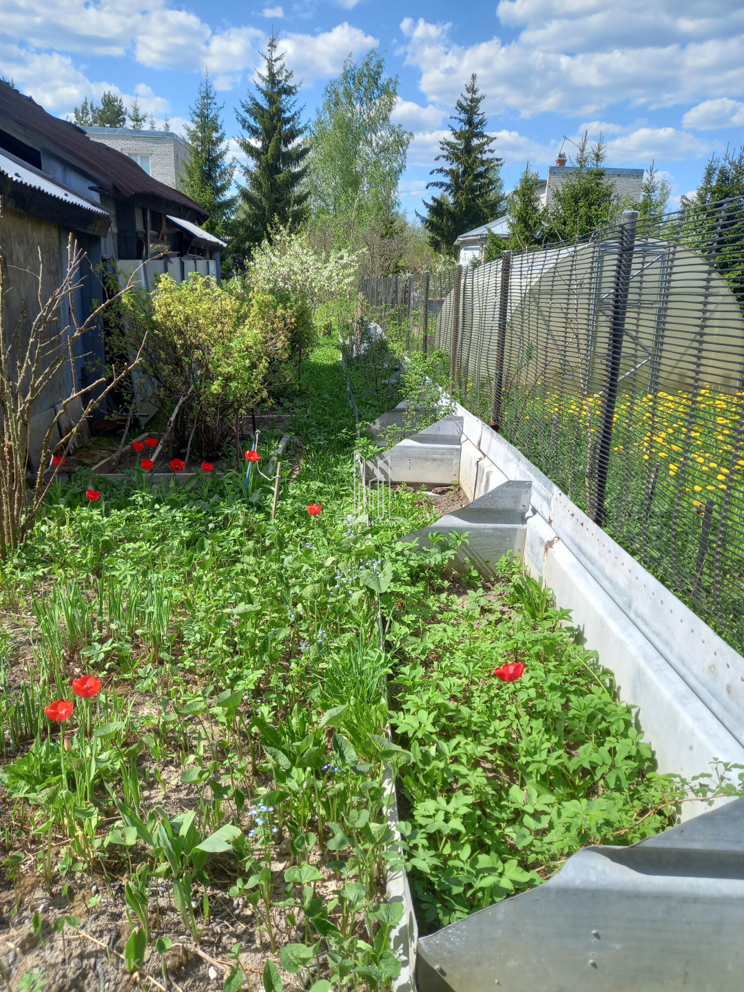 Участок квадратной формы, огорожен с трех сторон надежными вечными грядами из оцинкованного толстостенного железа. Из него же ограждение водоема и основание теплицы. Накопительный бак для воды.