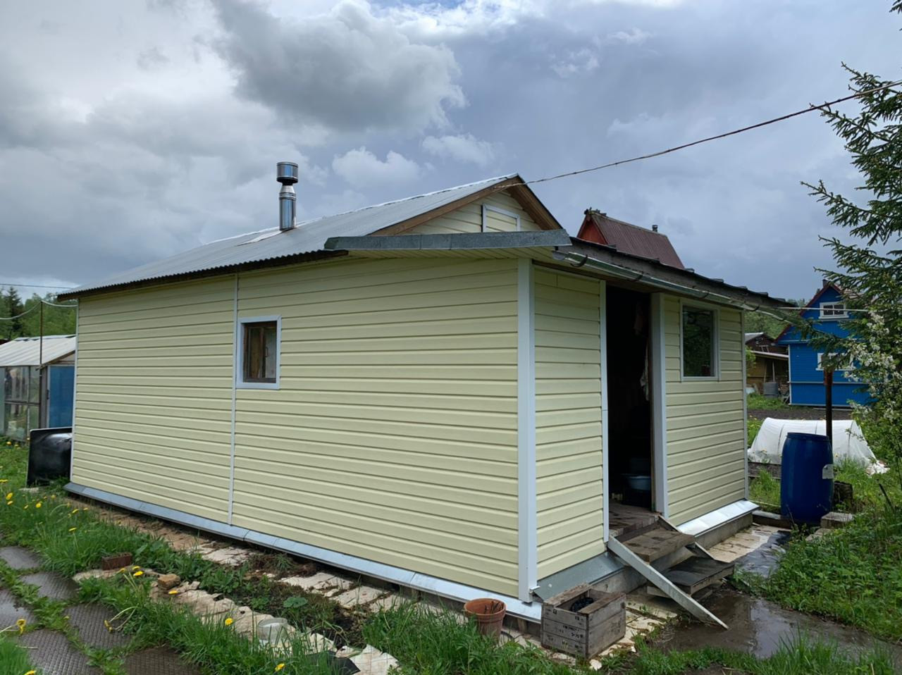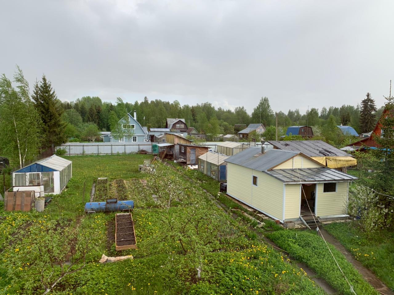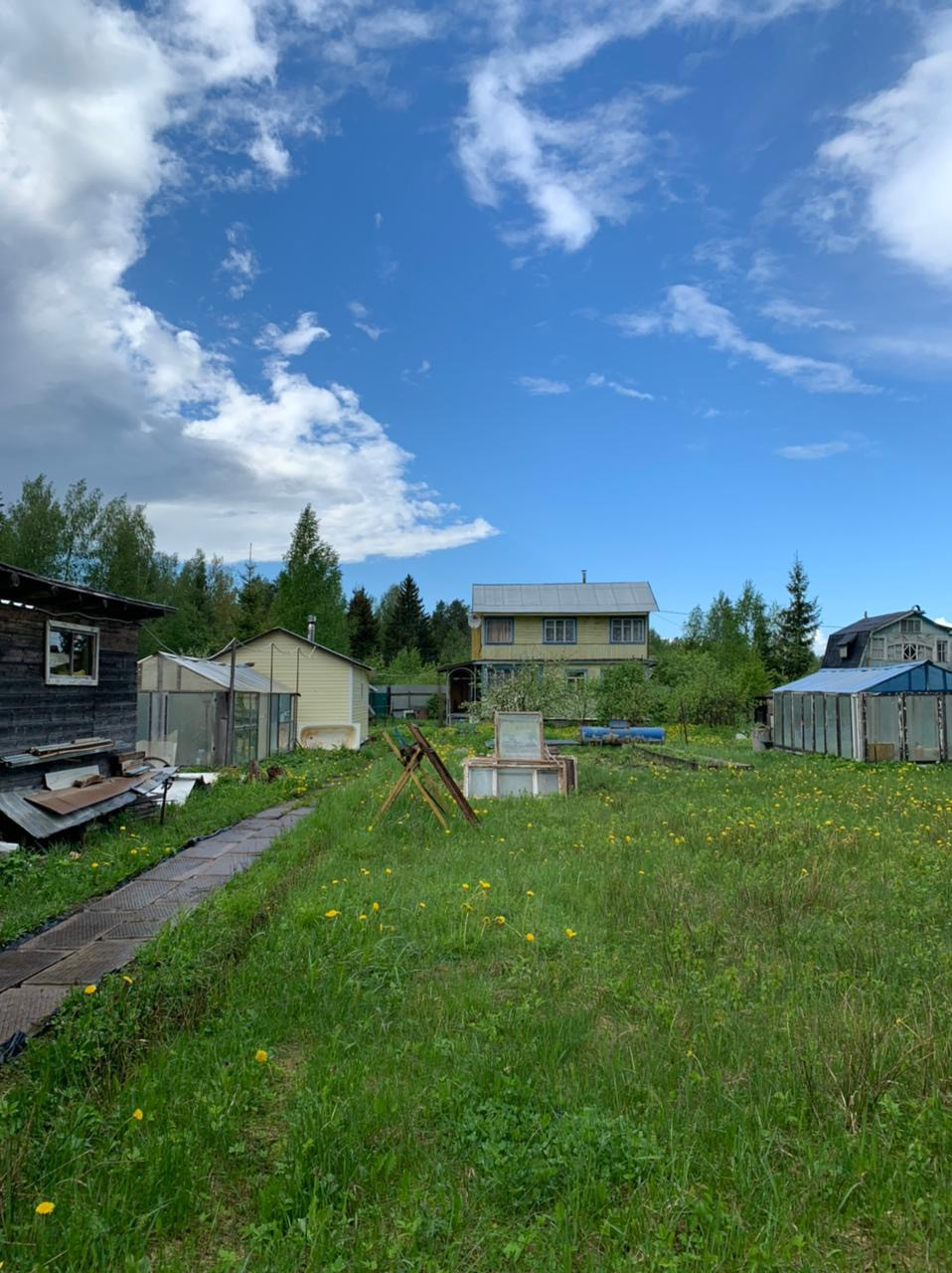 Колодец, септик, хозпостройки, плодовые деревья (яблони, сливы, вишня) кусты малины, чёрной смороды.